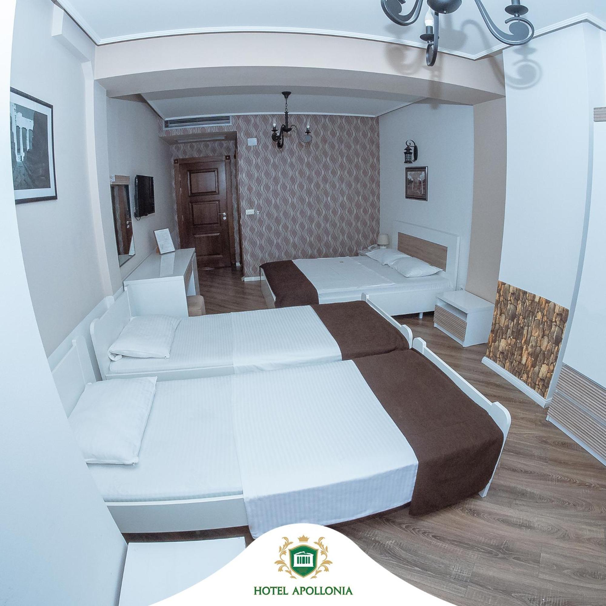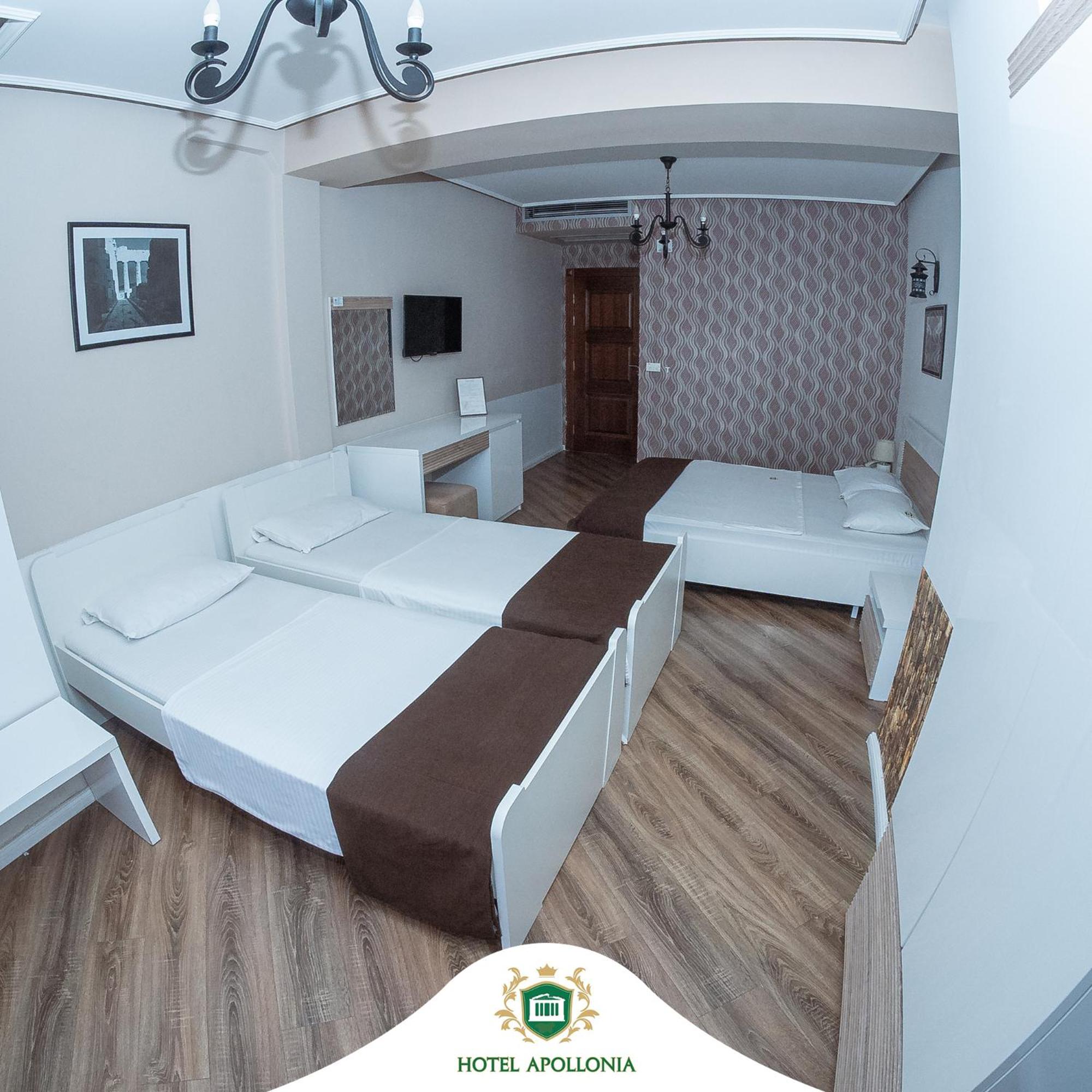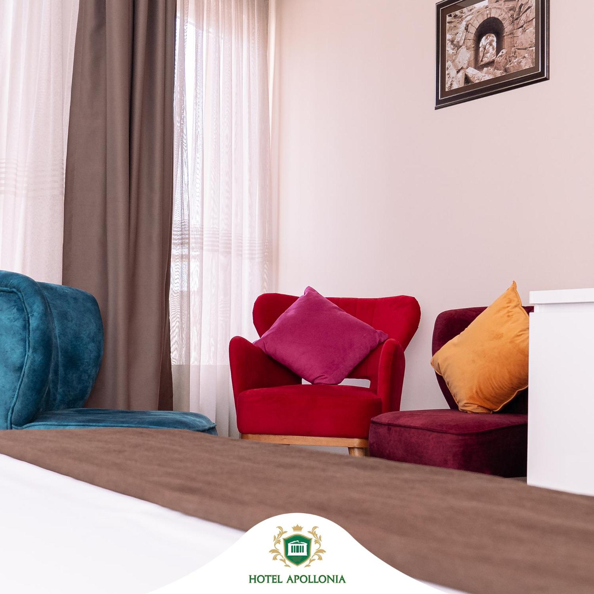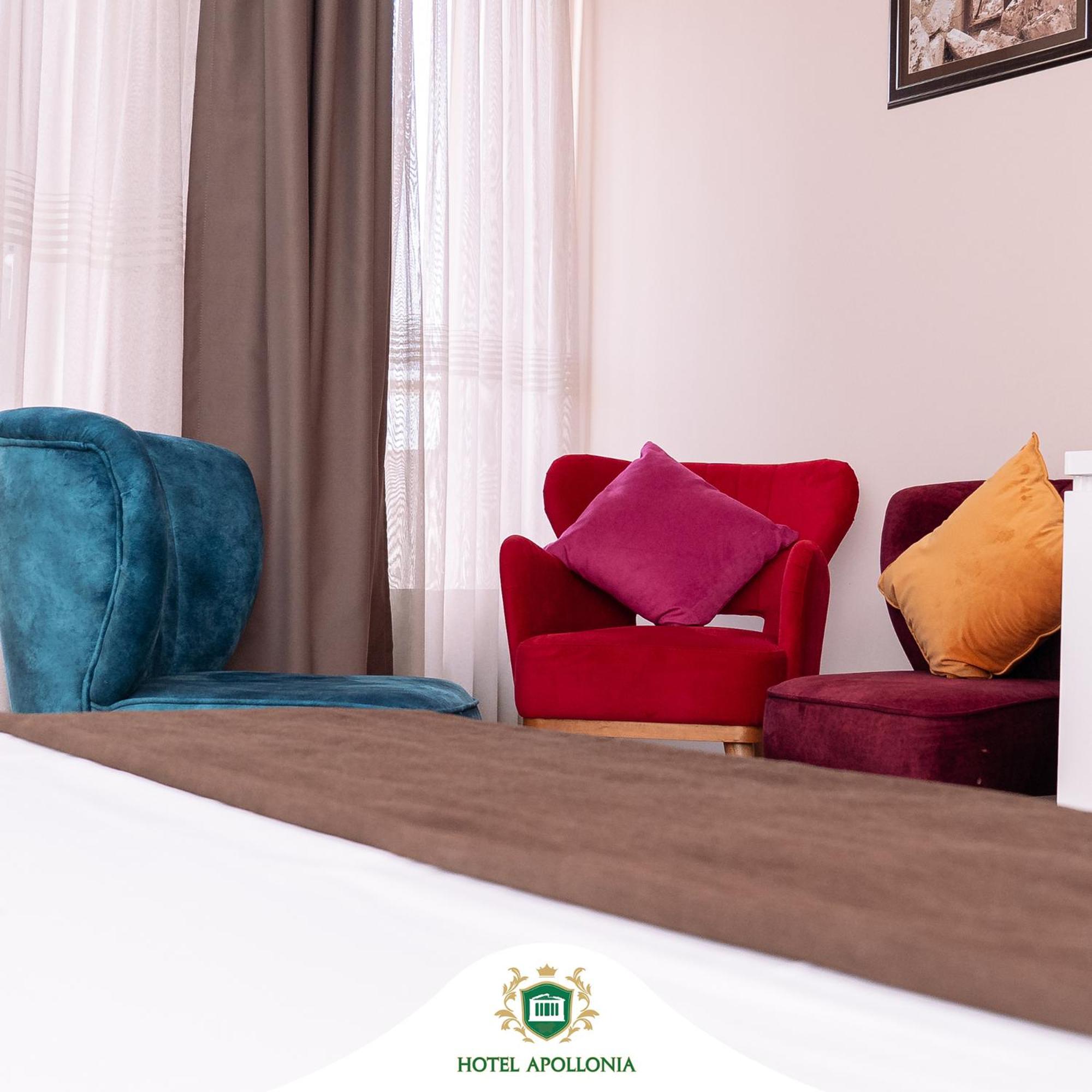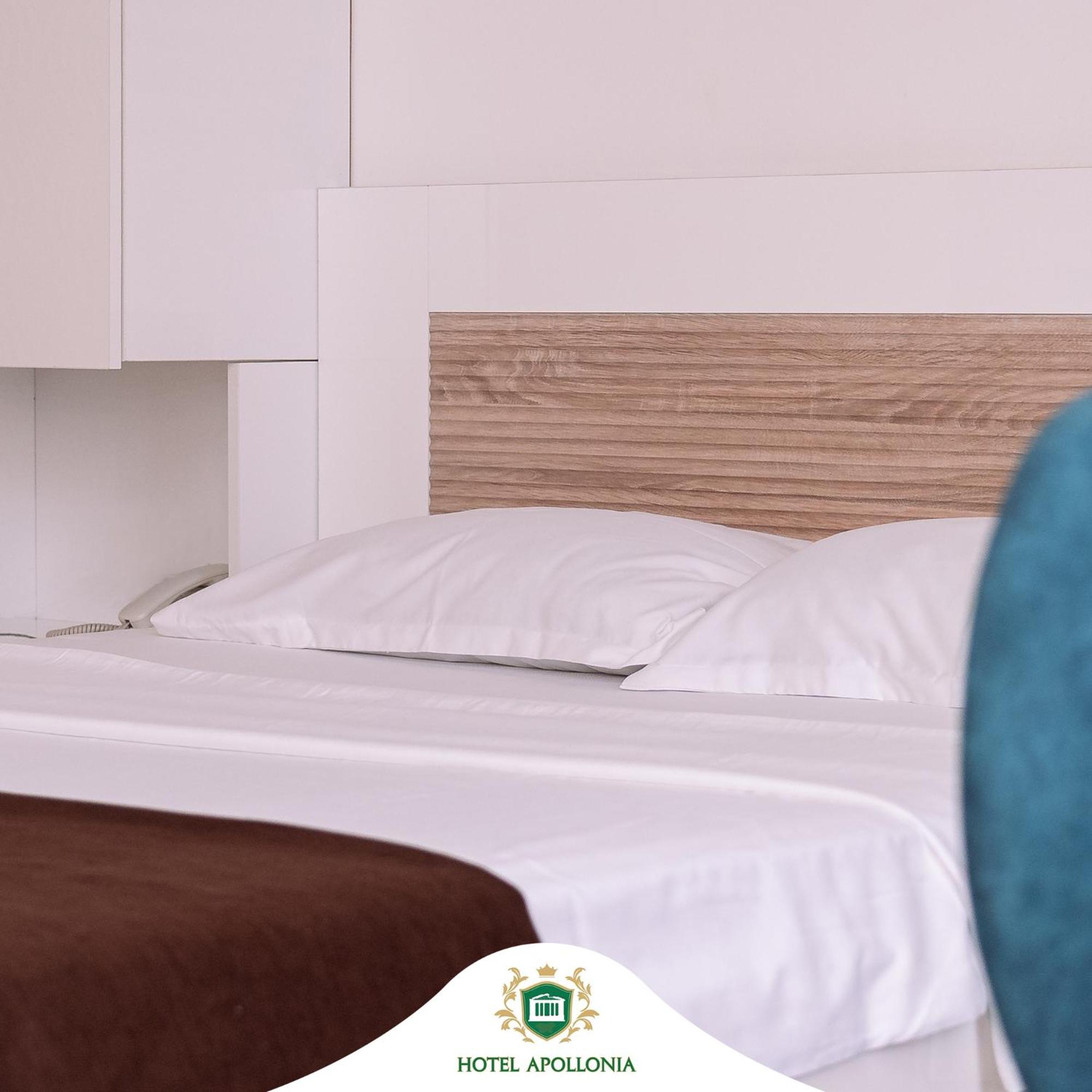 The rooms at Hotel Apollonia are well-equipped with modern amenities such as flat-screen TVs, air conditioning, and free toiletries, ensuring a comfortable stay for all guests.