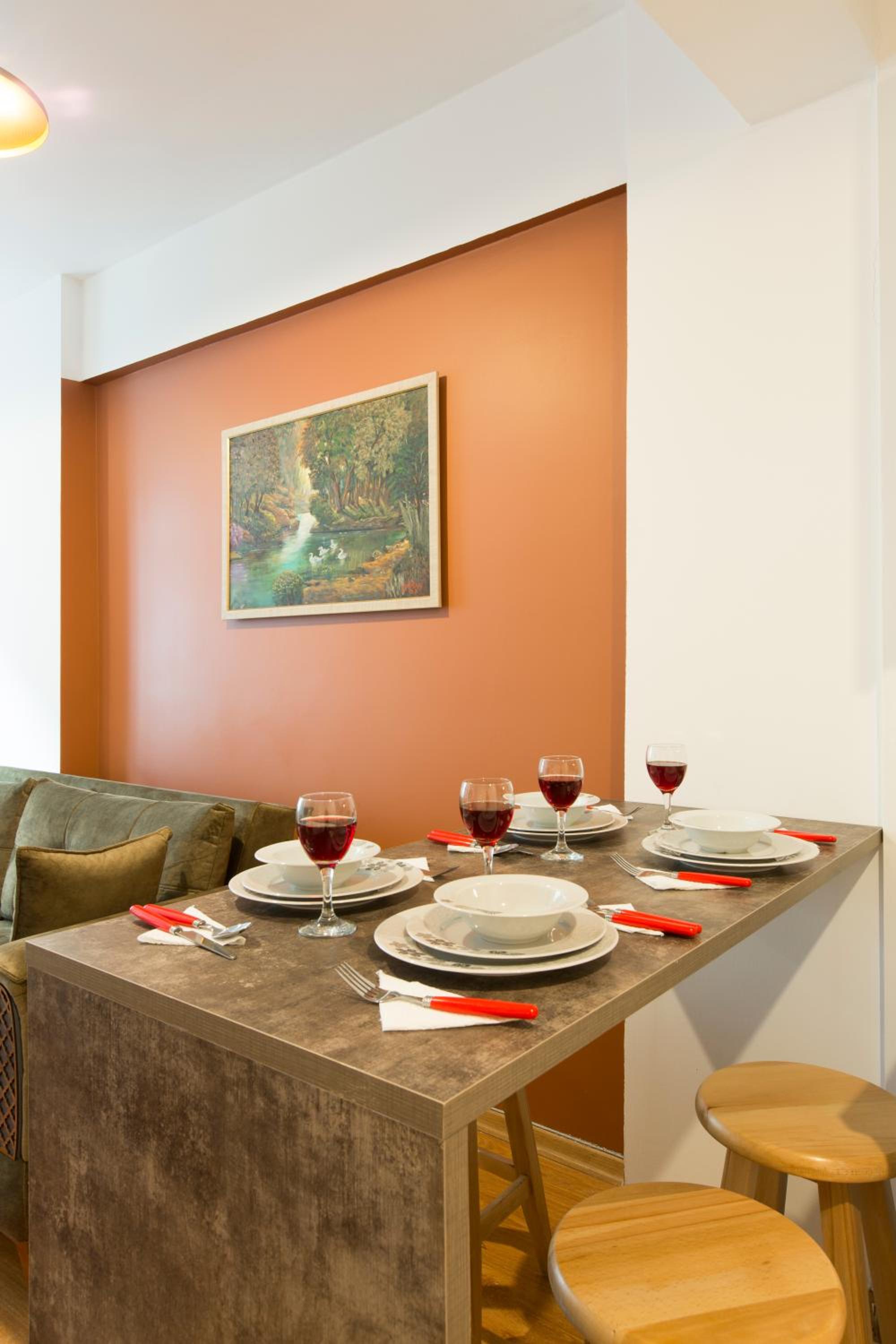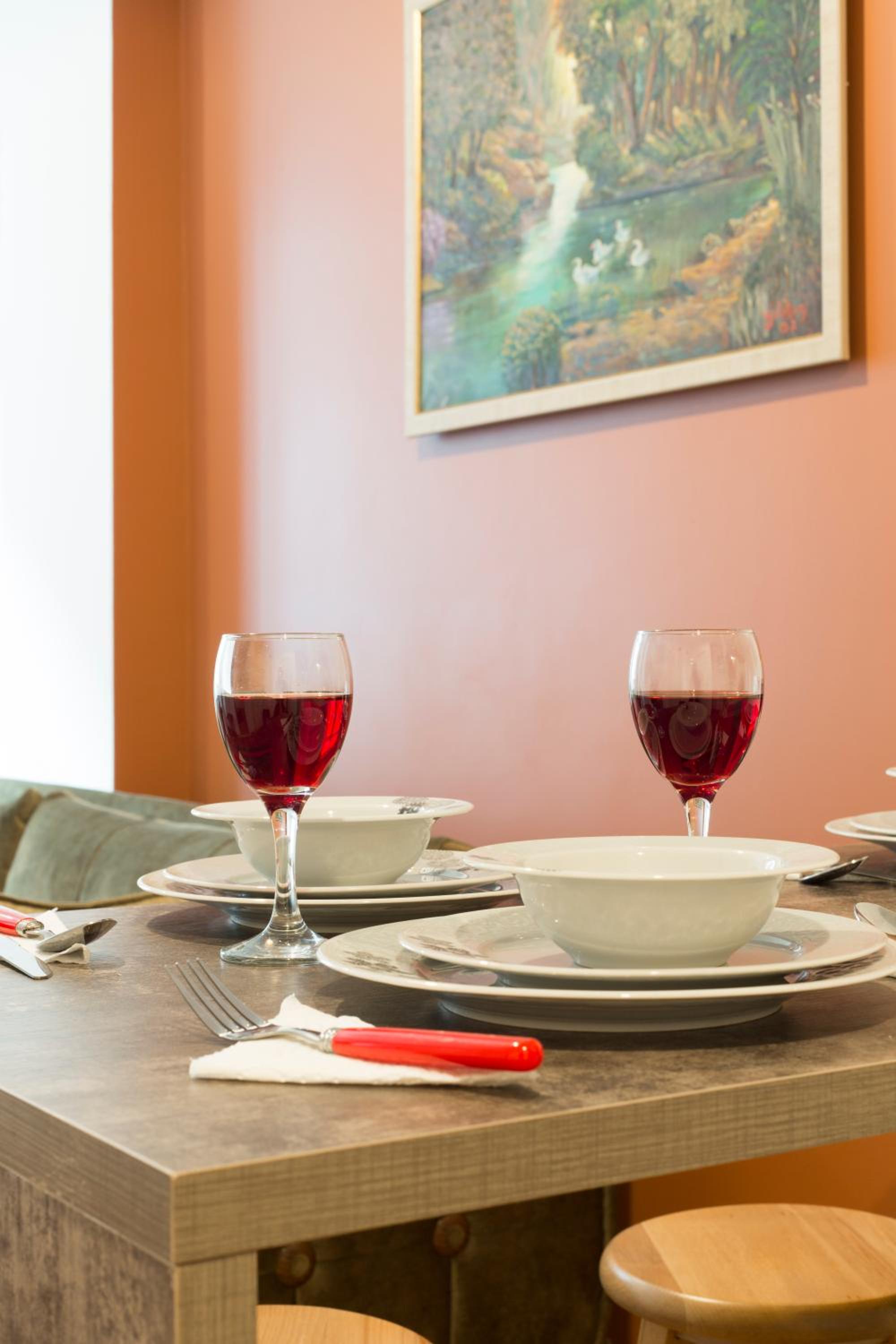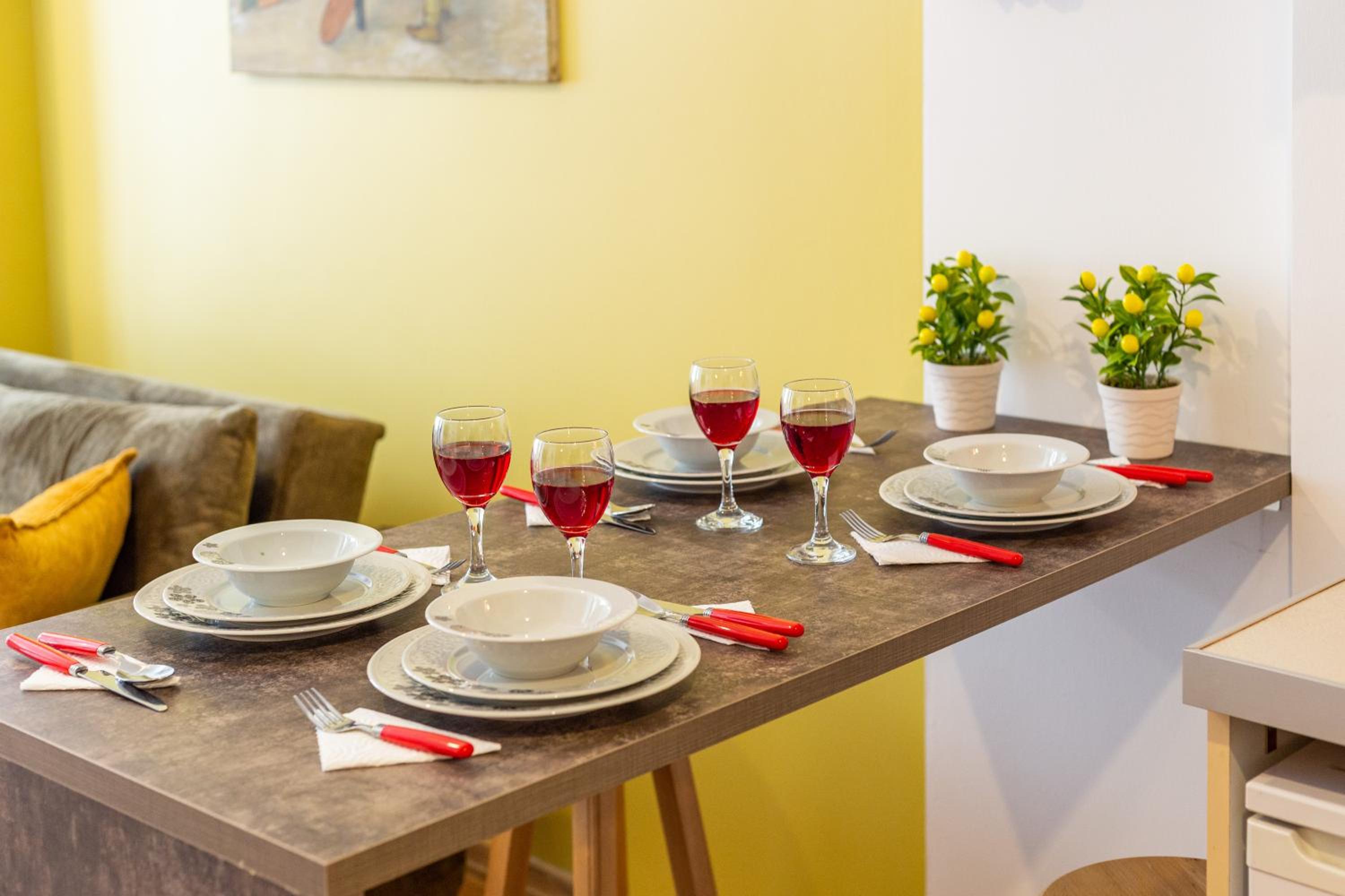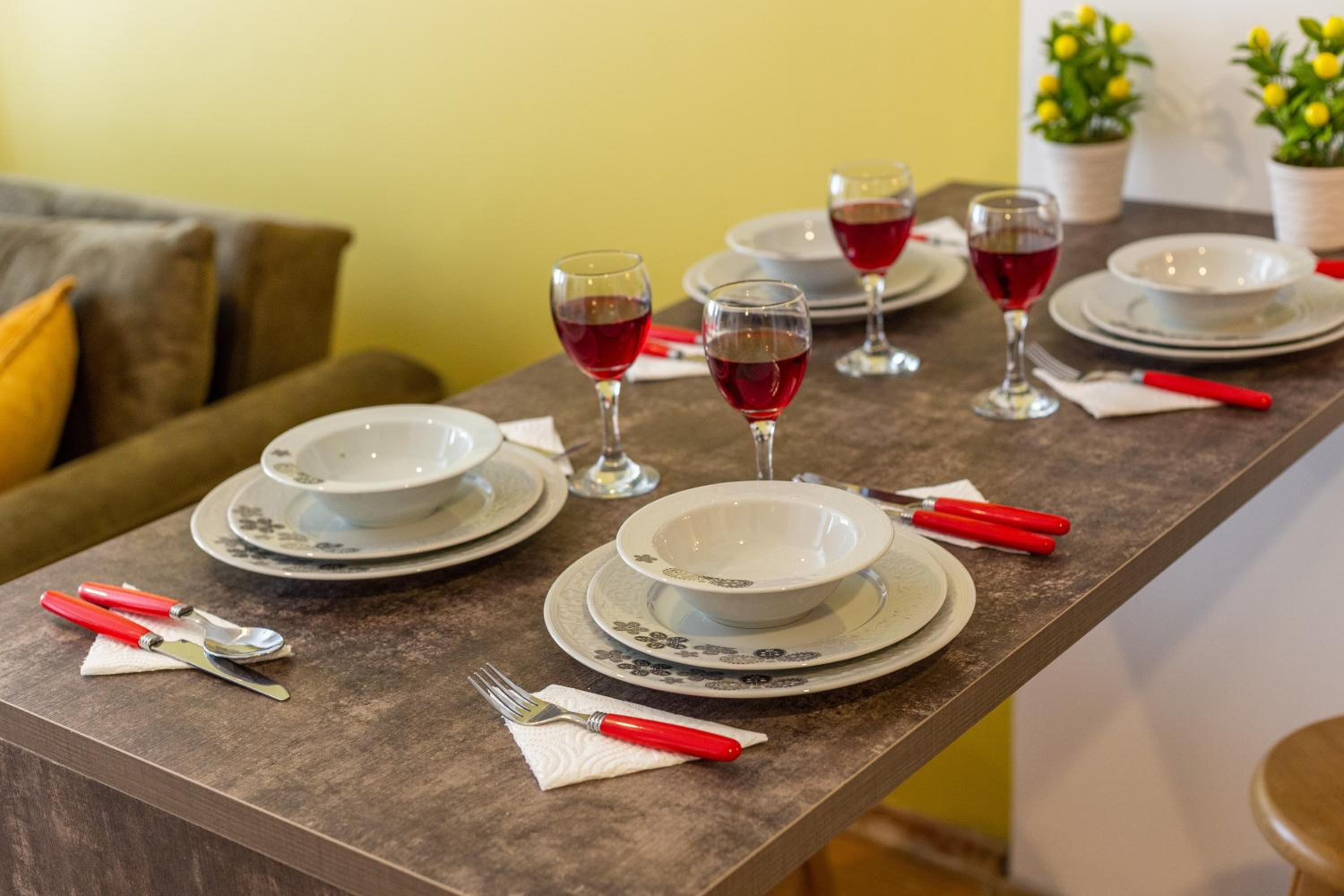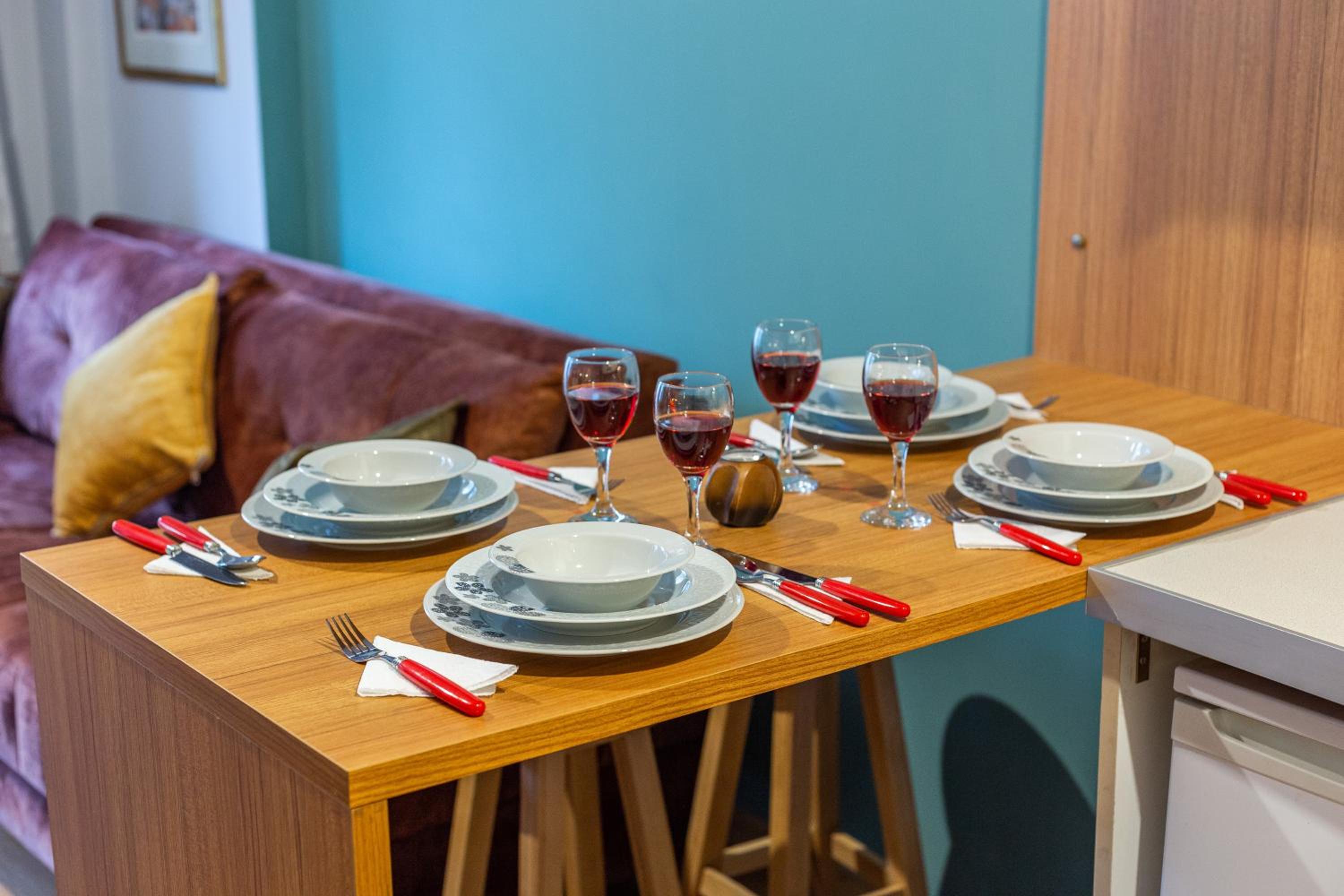No proper coffee machine or free bottles of water on arrival. Bare minimum in terms of furnishings and cutlery.
