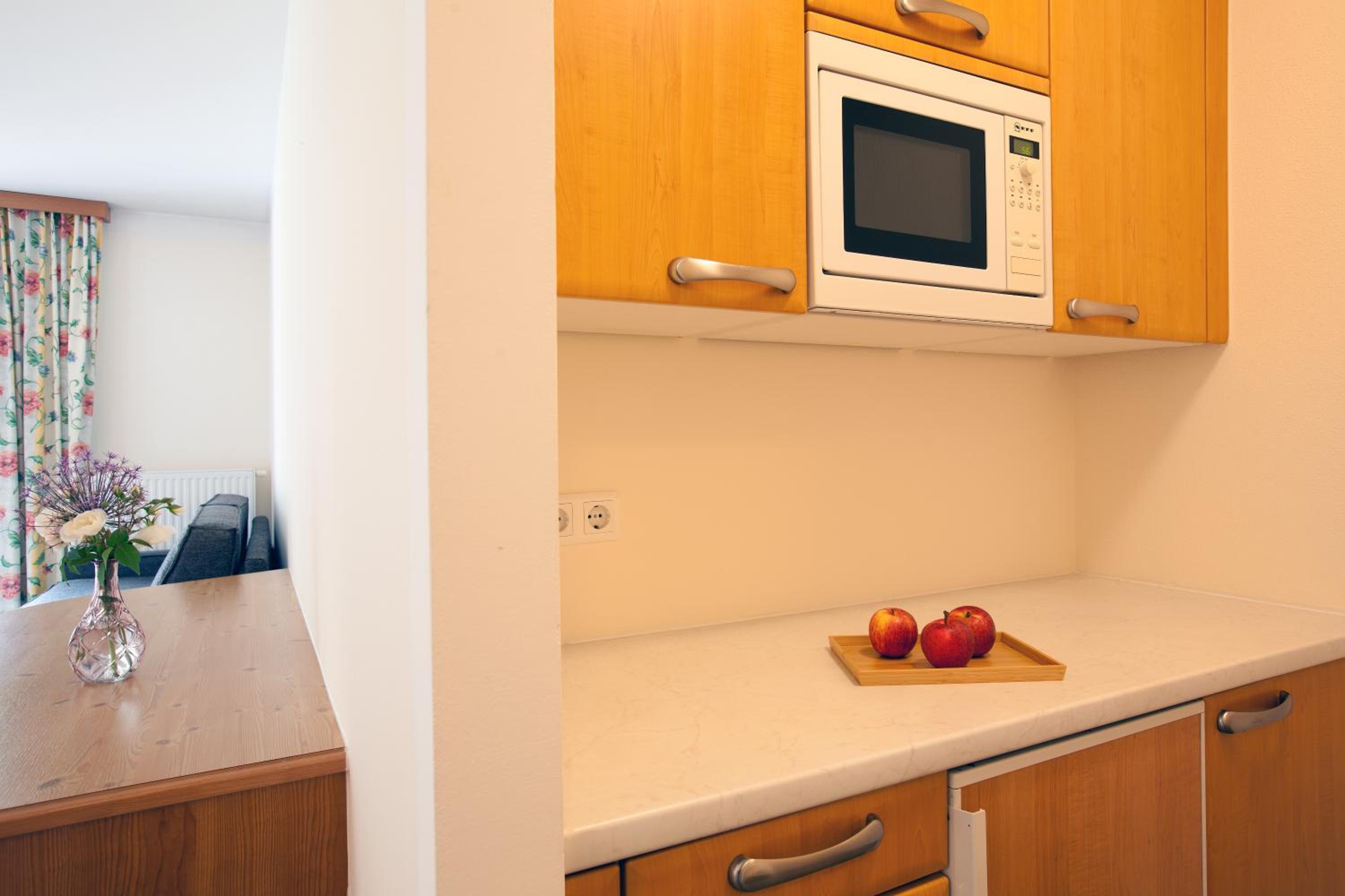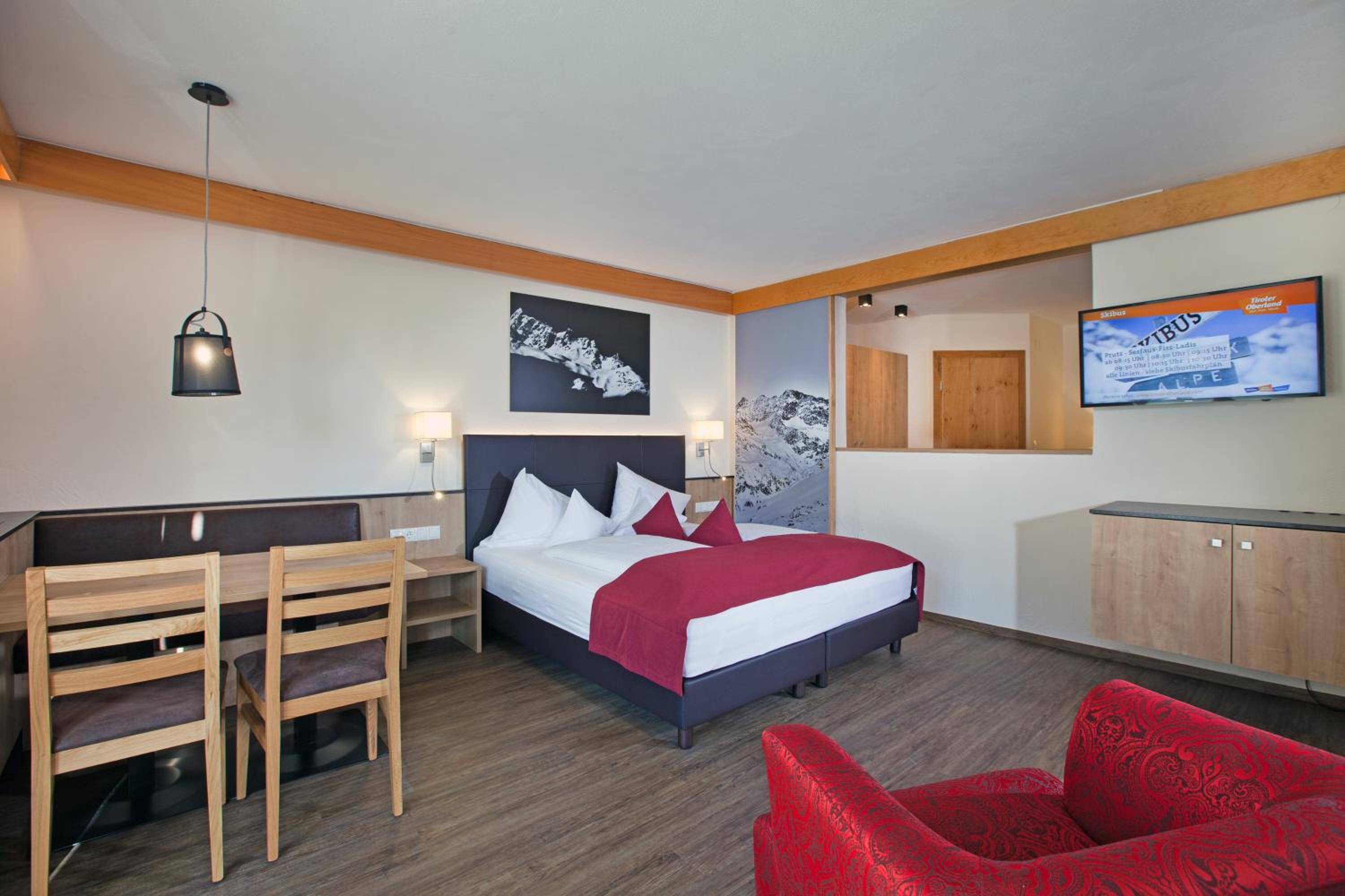 Zeer vriendelijk personeel. Ruime kamer. Met de auto ben je op 15 min aan de Waldbaan (Fiss). De skibus stopt eveneens voor de deur.