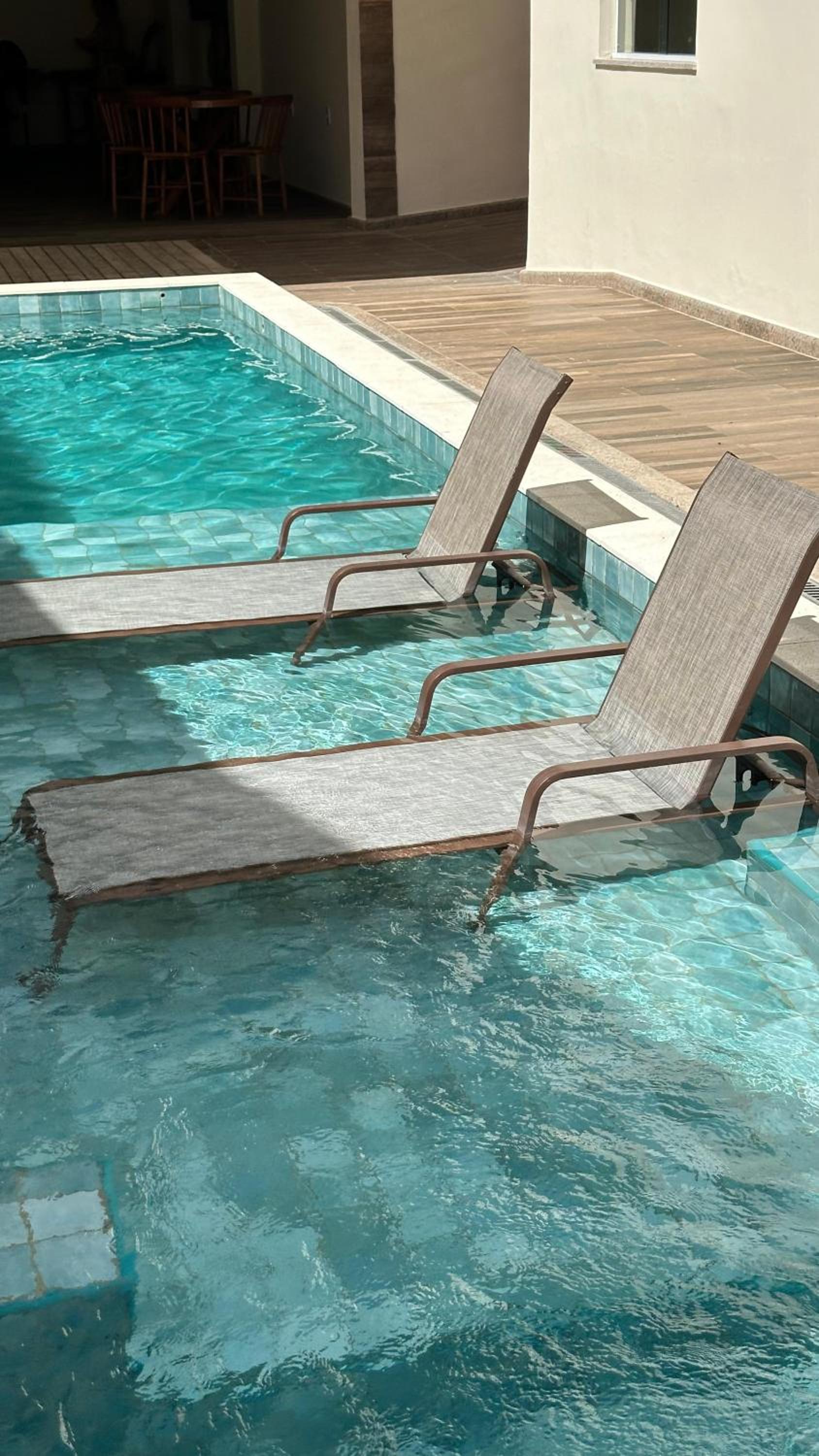 O pessoal saía da piscina e entrava molhado pelos corredores e hall, deixando rastros pelo caminho — quase uma instalação artística espontânea.