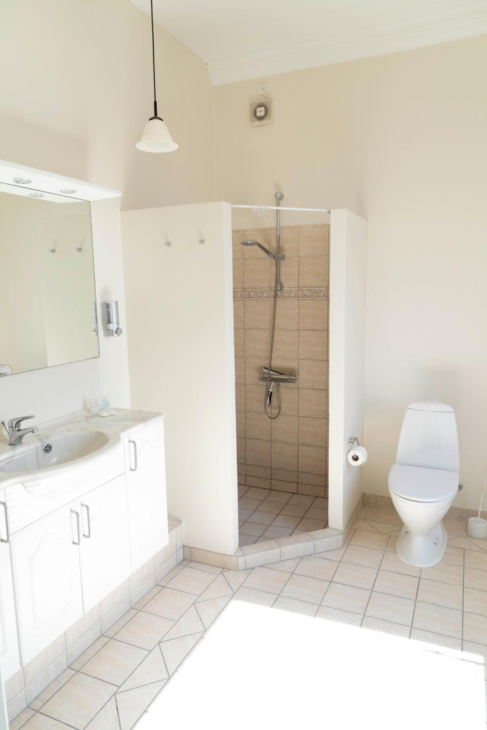 Dejligt værelse og toilet/bade rum, men der kunne godt være noget udsugning på toilettet.