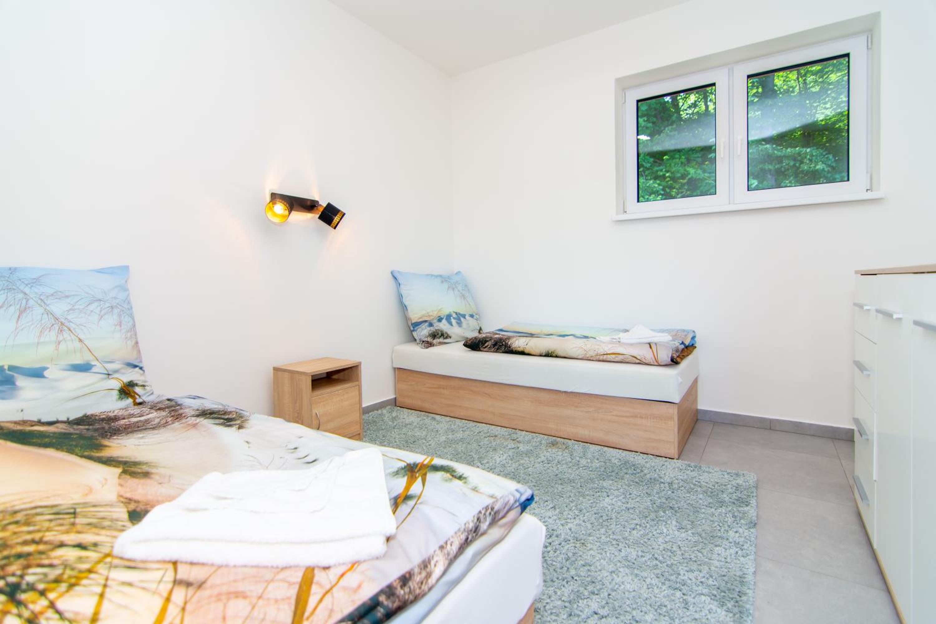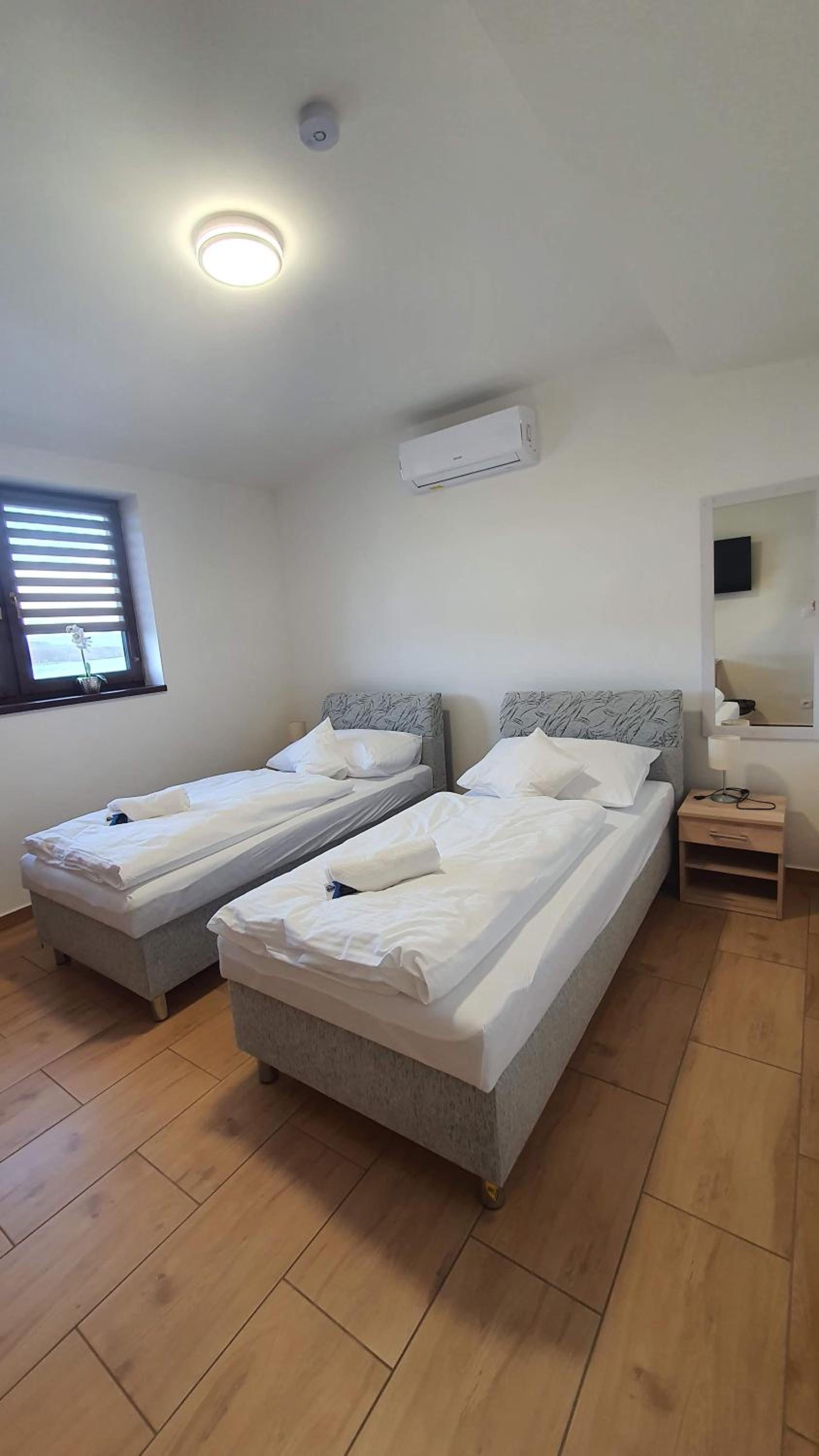 Bardzo wygodne materace i duża ilość gniazdek w pokojach.
