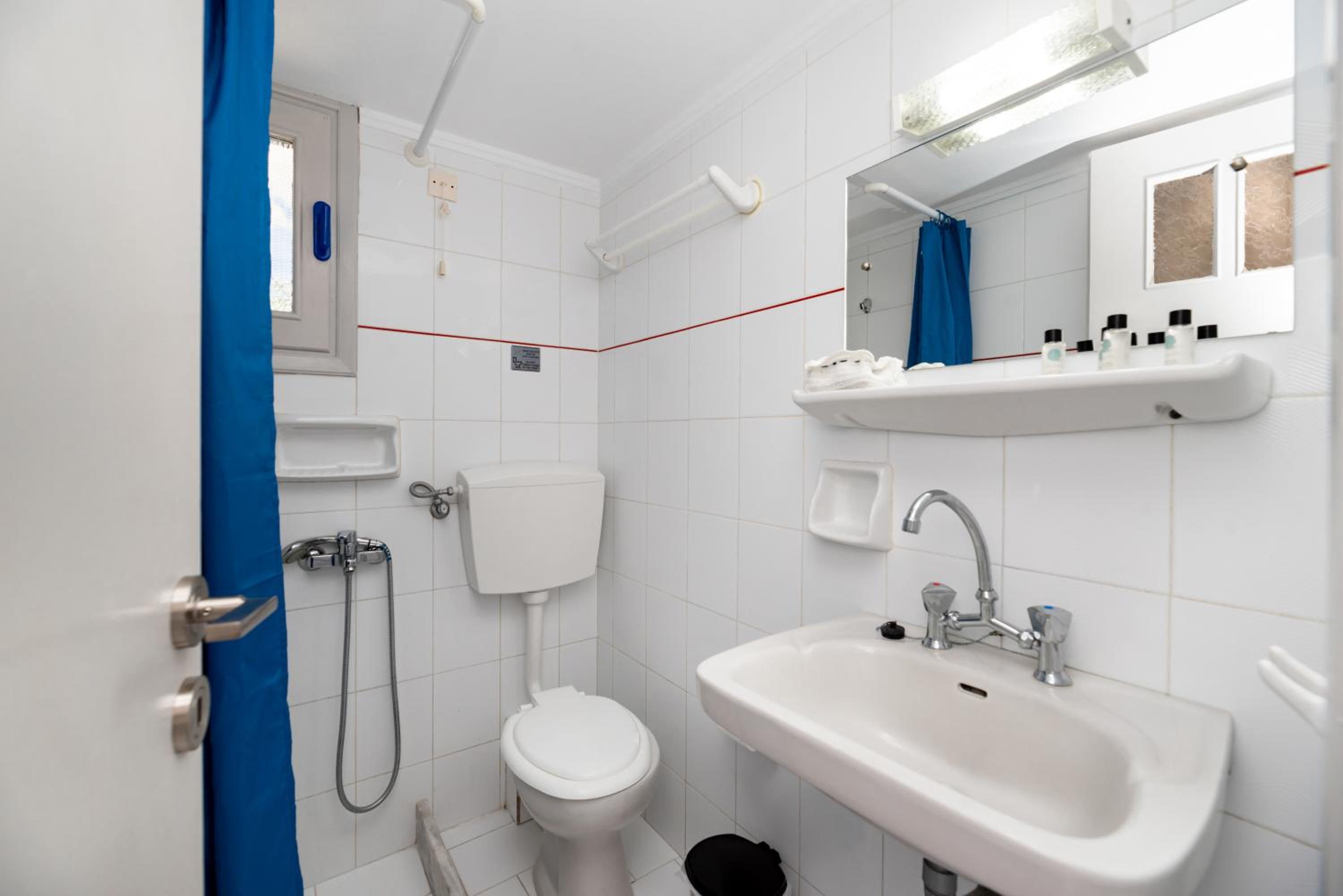 Τέλος η ντουζιέρα είναι τόσο στενή και μικρή που ενώ κανείς ντουζ η κουρτίνα κολλάει στο σώμα σου . Αυτή η κουρτίνα ακουμπάει σε κάθε κορμί που κάνει ντους και βέβαια δεν έχει πλυθεί ποτέ γιατί μύριζε μούχλα .
