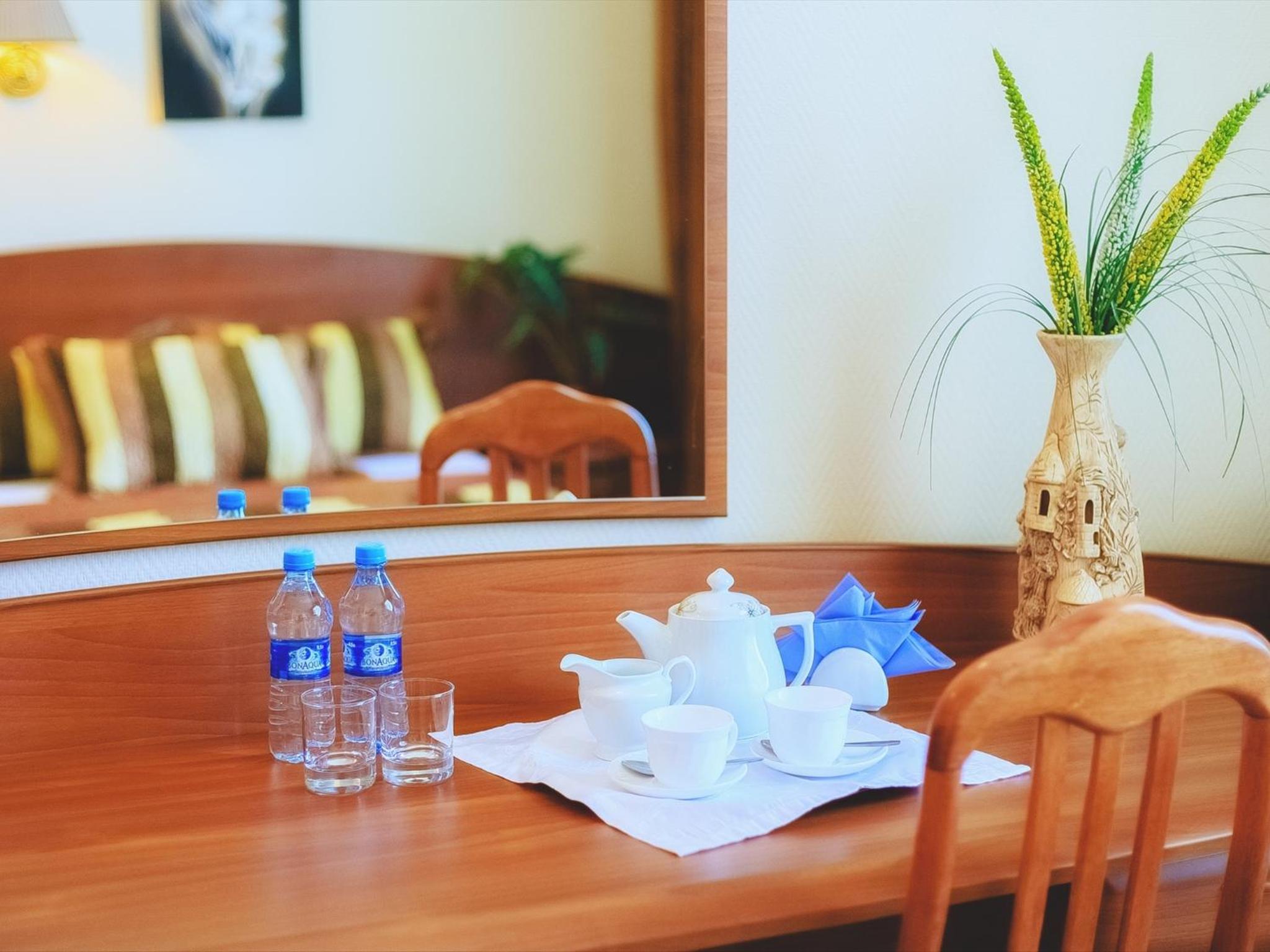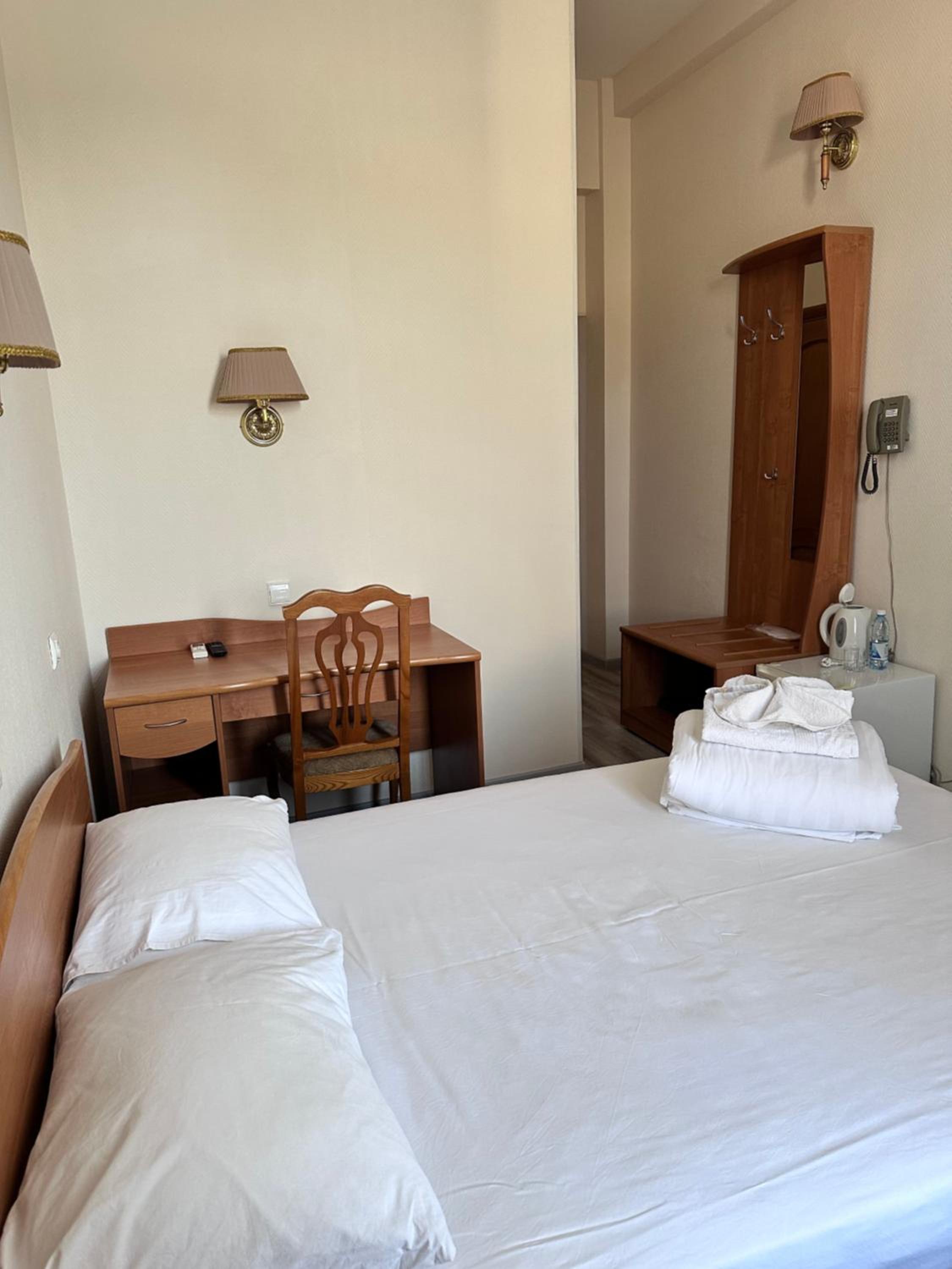 A room on the ground floor with 3m high ceilings, the ceiling height is really matters, it gives you a feeling of an expensive hotel and comfort also. Wide bed was very cozy, dont want to get up of it, especially pillows were perfect: of ideal density and size. There were disposable slippers, tooth brush/pasta, liquid soap. The room was warm