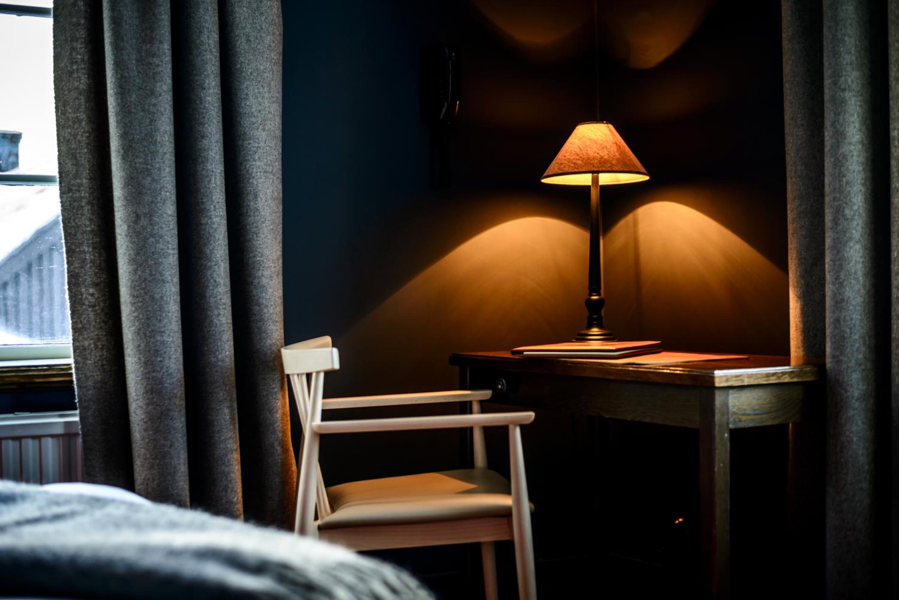 Rummet saknar stol för den som behöver arbeta med t.ex. laptop vid skrivbordsytan. Belysning är lite dunkel. Sänglampa är lågt placerad på bord bredvid sängen vilket inte är optimalt som läsbelysning.