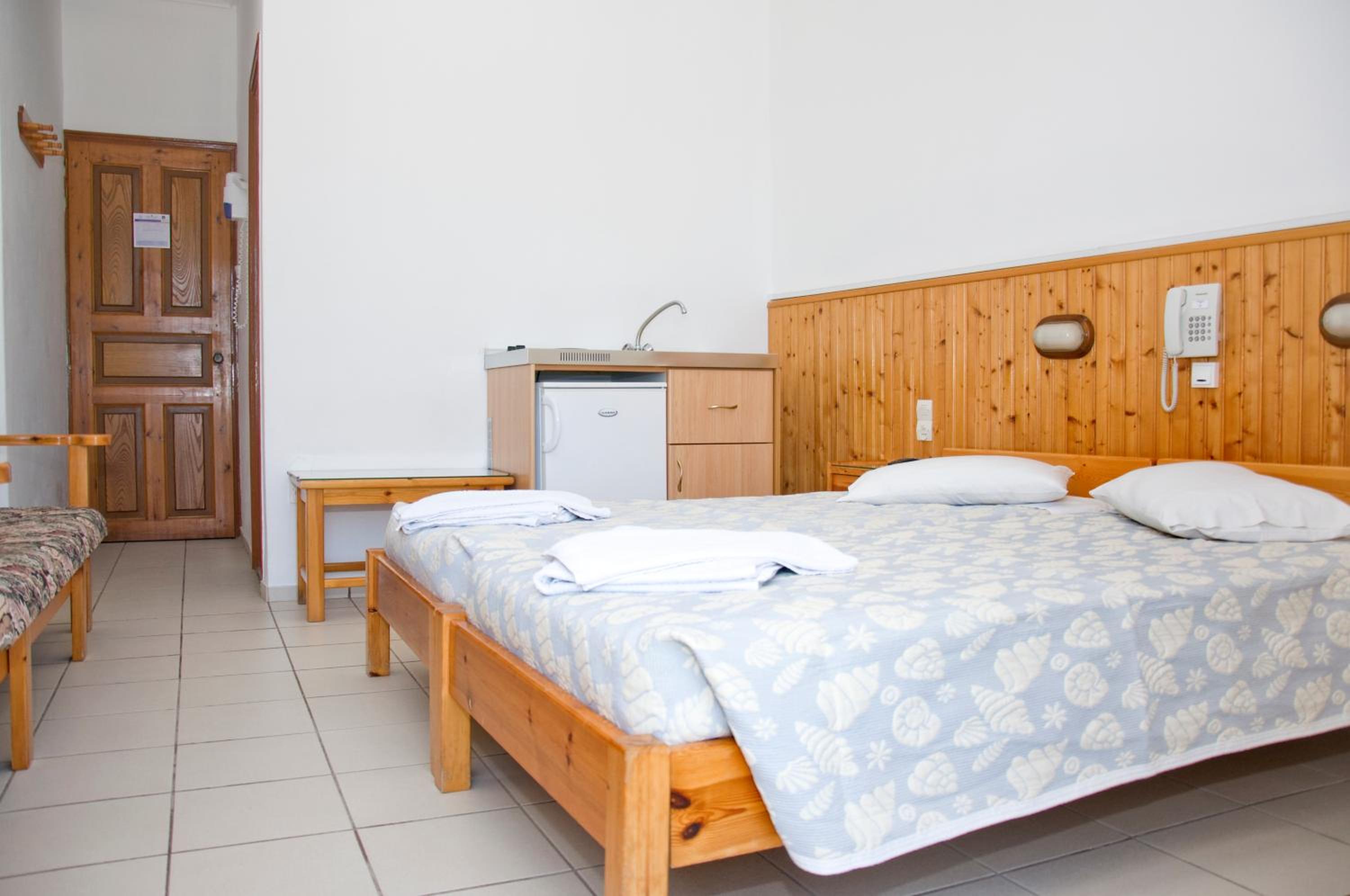 Fint værelse med lille køleskab og en rigtig god madras i sengen.