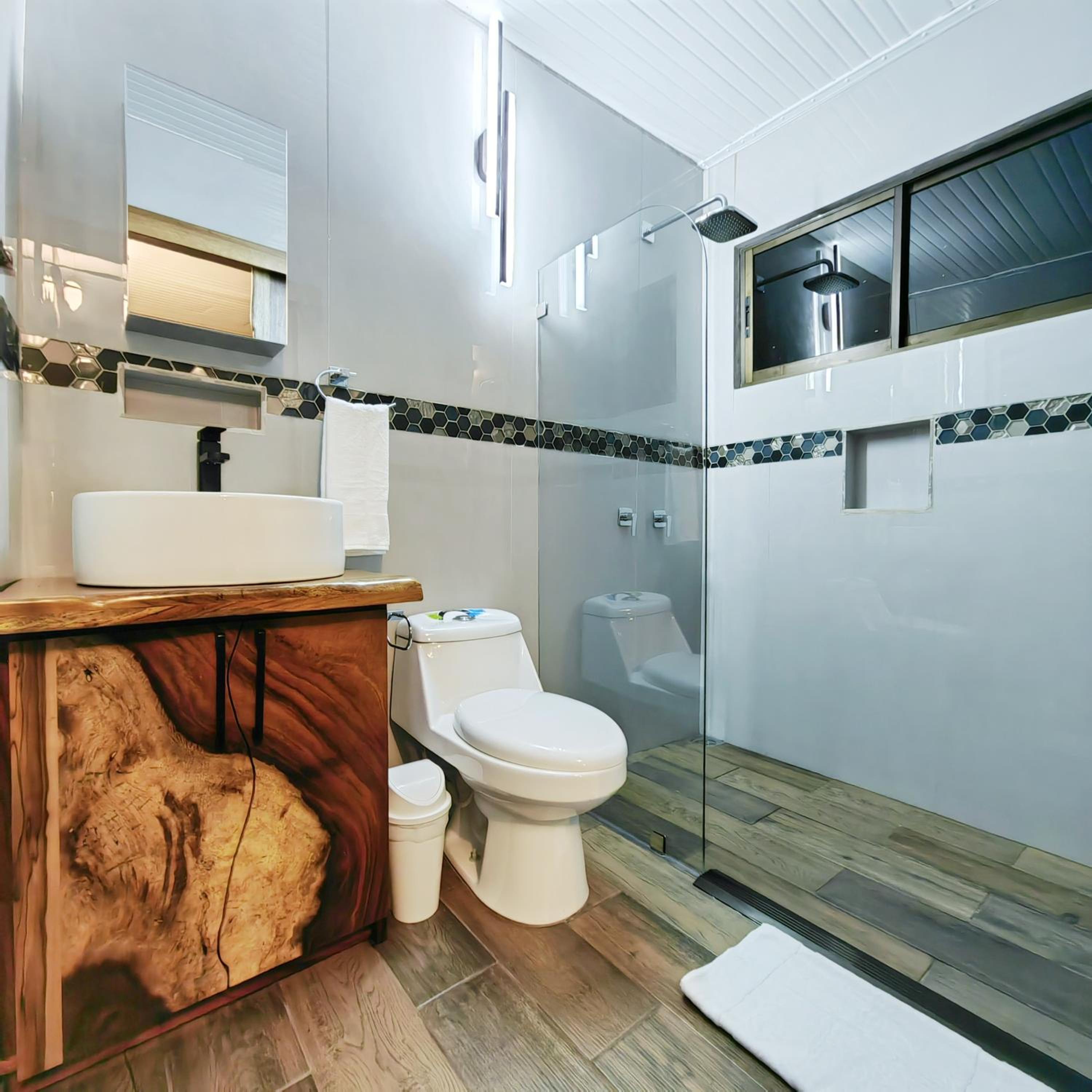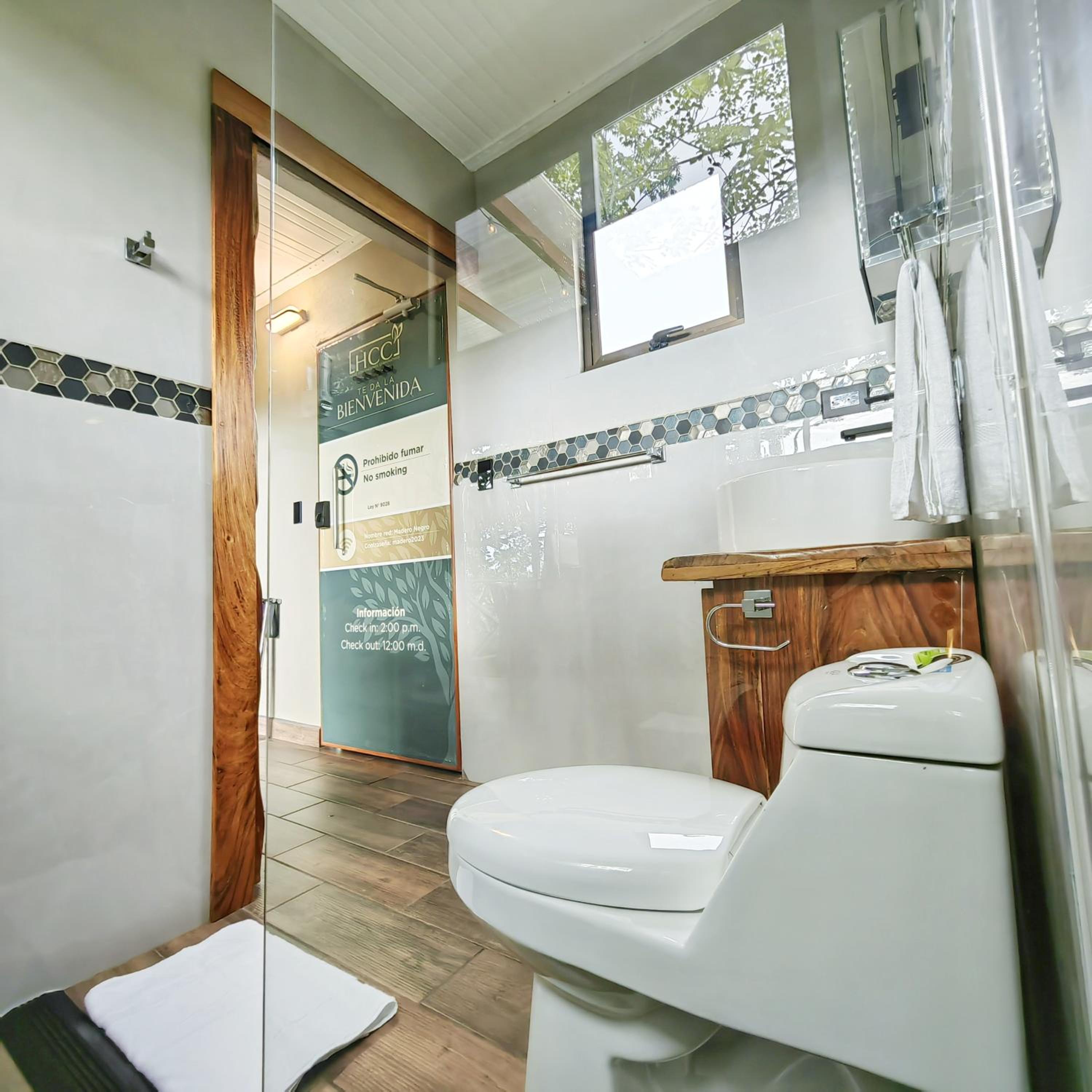 Room was super clean. Beautifully finished container conversion. Cozy little balcony in the back over looking a nice wooded area. Considering the room is only about 100 meters from a main road and a couple of bar-restaurants it is Super quiet. Room is perfect for an individual or a couple. It is equipped with a very comfortable queen size bed, Wi-fi, a desk to work if needed, a coffee maker, coffee, sugar, cream, a small fridge, good size TV, A/C, plenty of plug ports to charge your devices and a beautiful size bathroom. Room is also pretty eco friendly. Pre-check in was great, They provide you with a code to open the door so all you do is park and walk right in.