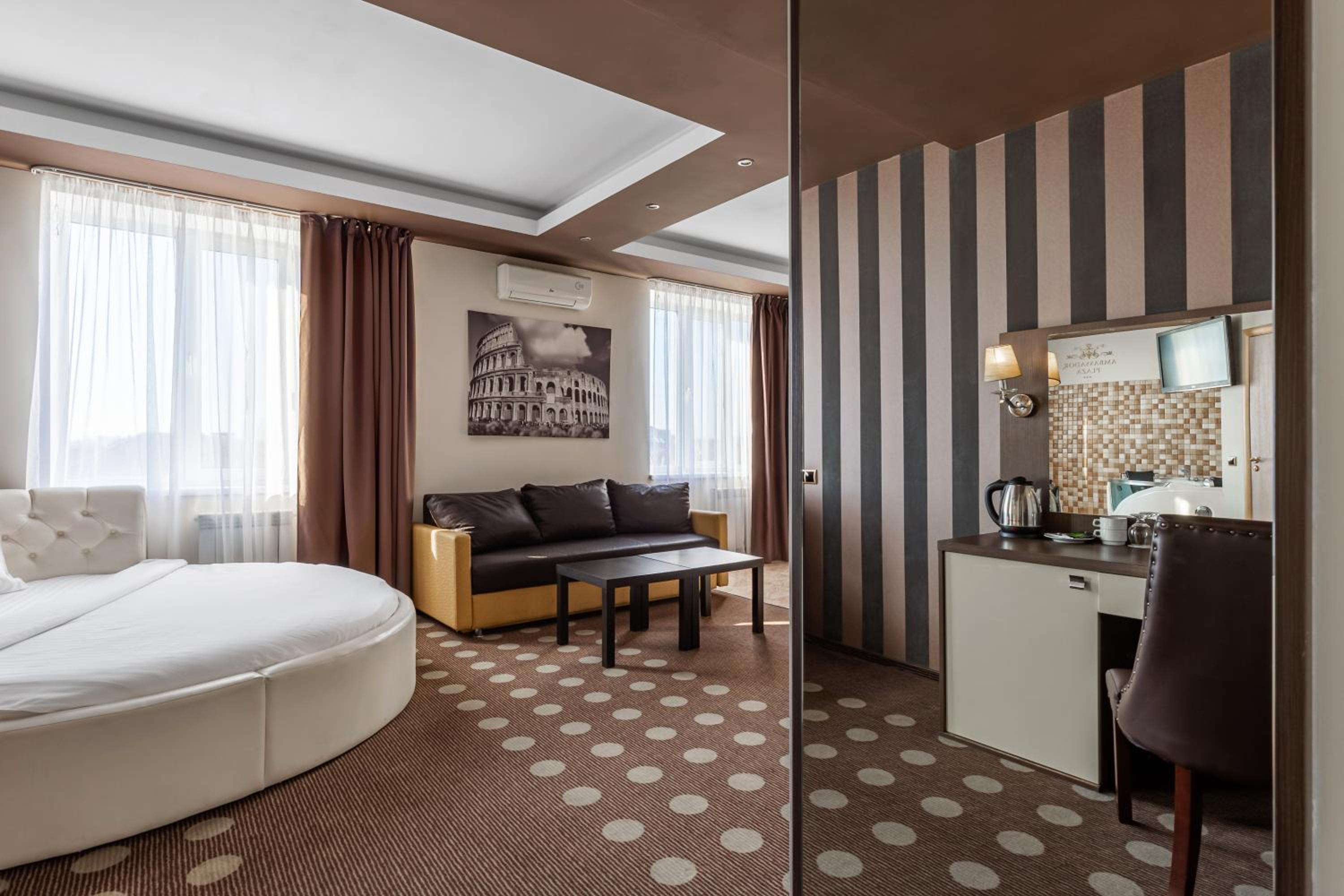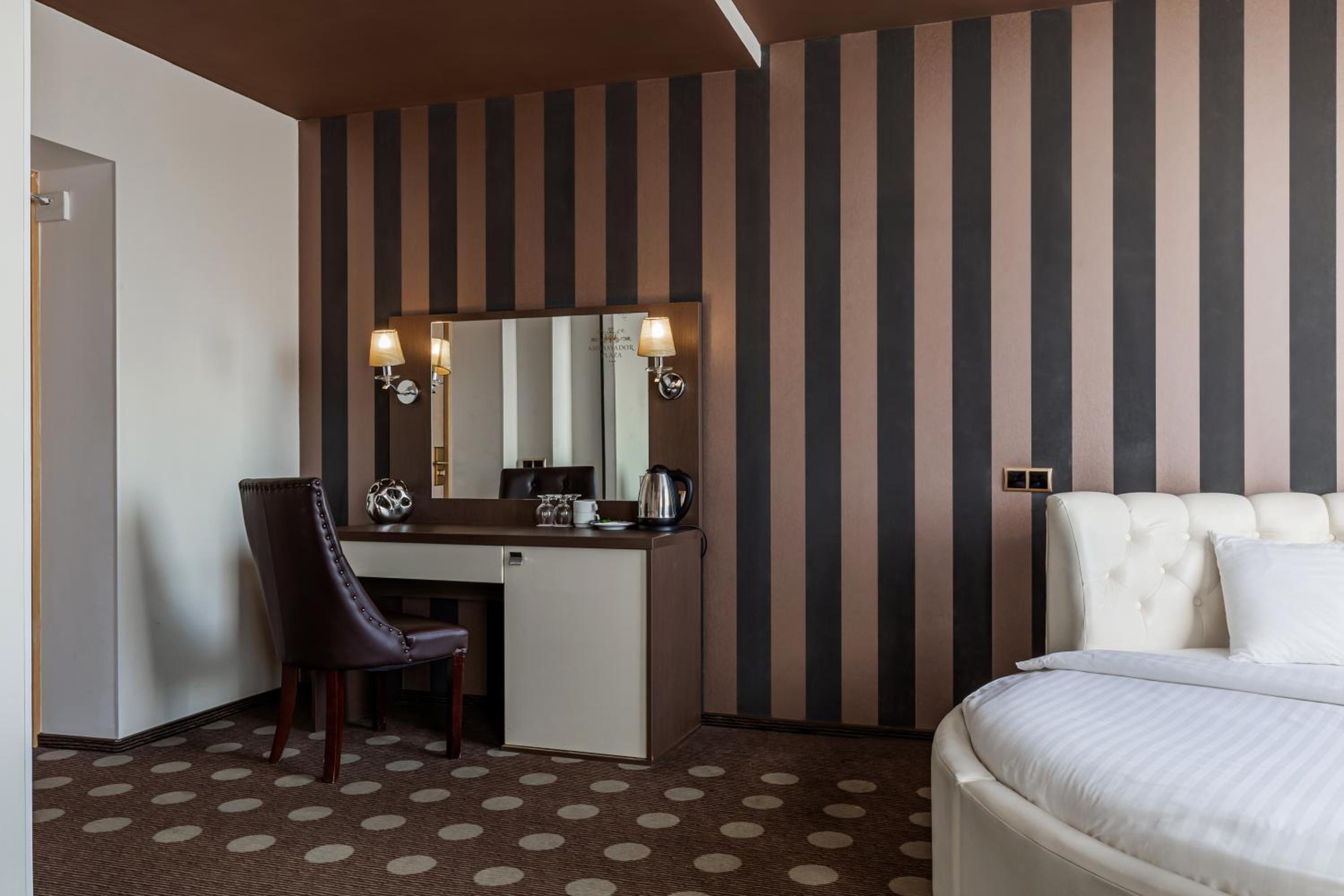 Luxurious Rooms: Experience contemporary-style rooms with elegant furnishings, flat-screen TVs, minibars, and private bathrooms at Ambassador Plaza.