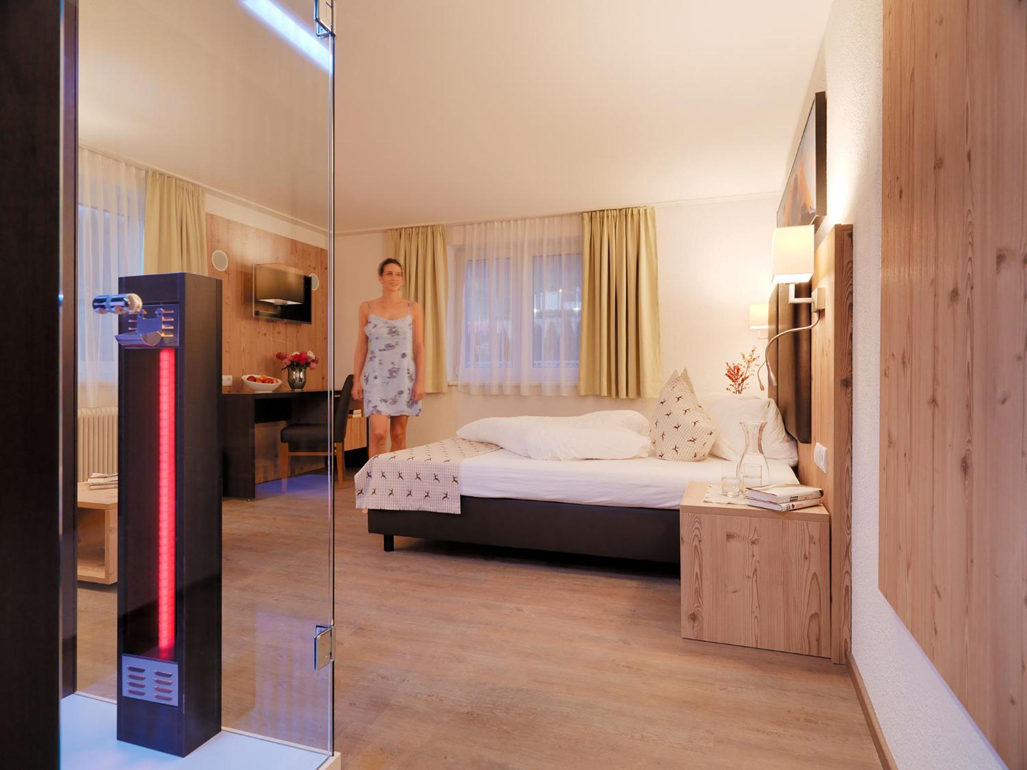 Tolles Hotel mit perfekter Lage zur Gondelbahn, schönes Zimmer mit viel Holzapplikationen,