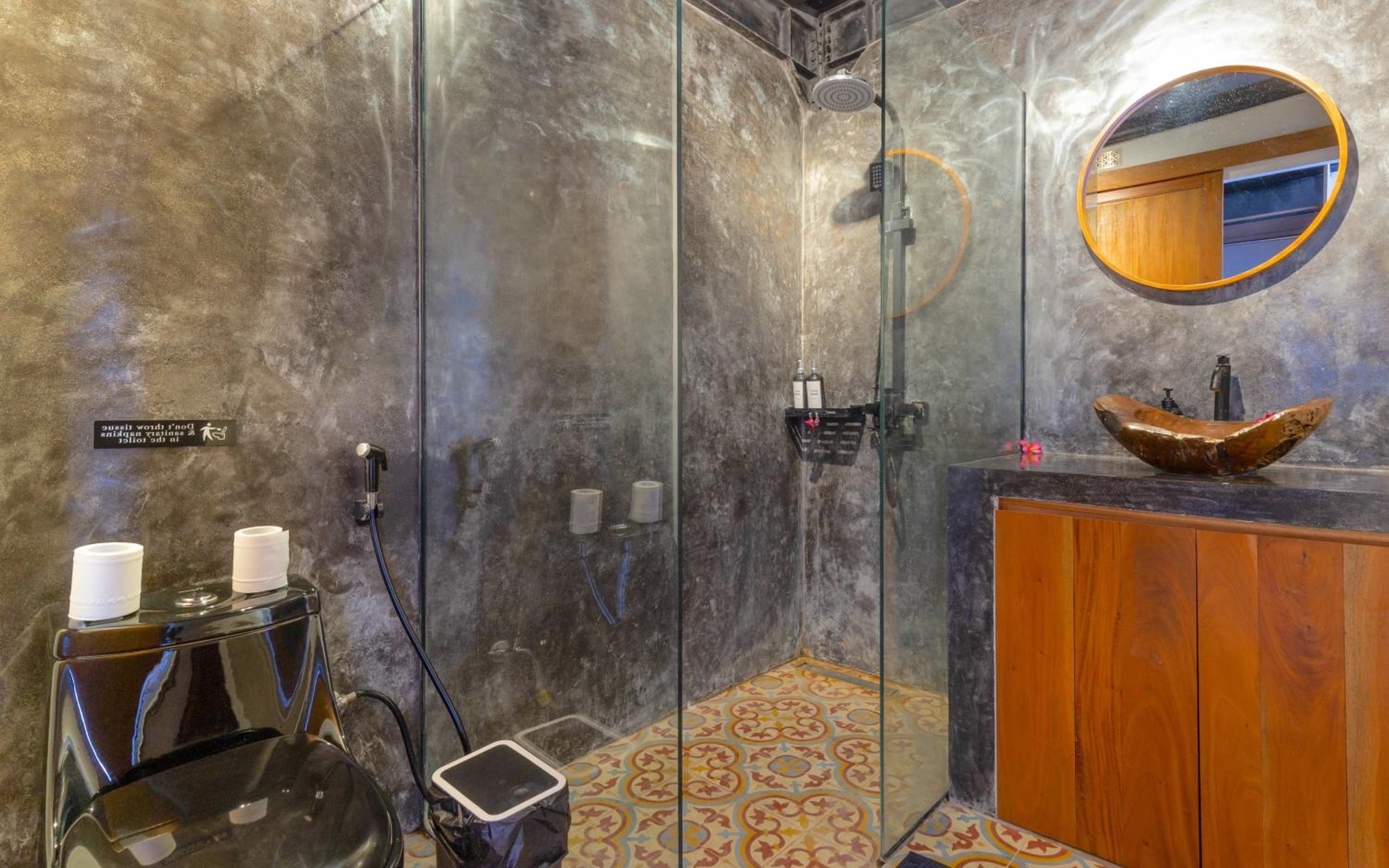 There are design flaws that makes it impossible to clean certain areas of the unit. For instance glass shower wall next to the sink table with very narrow gap so dirt and trash gets there and impossible to clean. The black decor attracts mosquitoes and makes the whole room gloomy. Very thin walls you can hear everything clearly next door. Smell from the septic tank goes up. Very cheap quality black toilet.