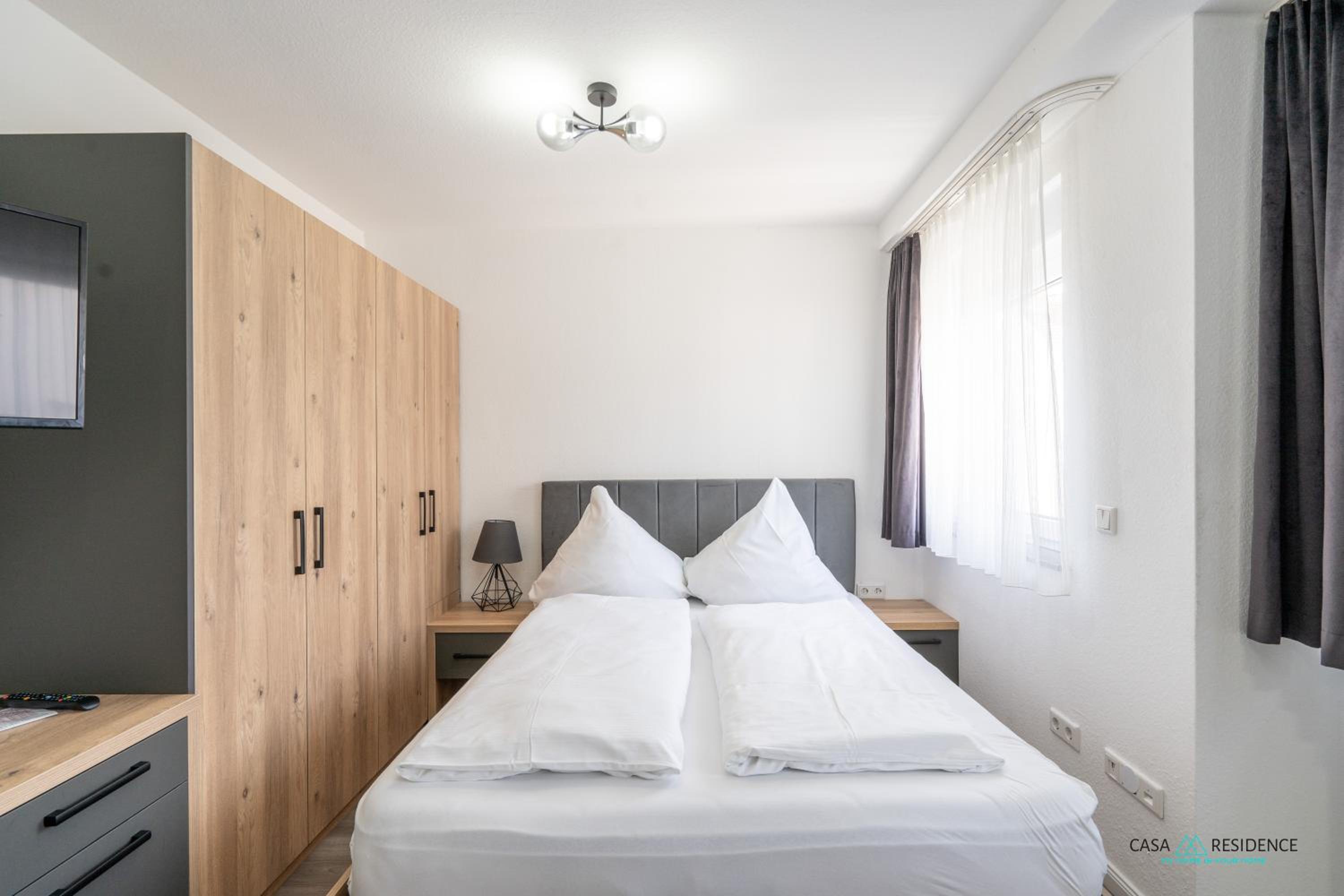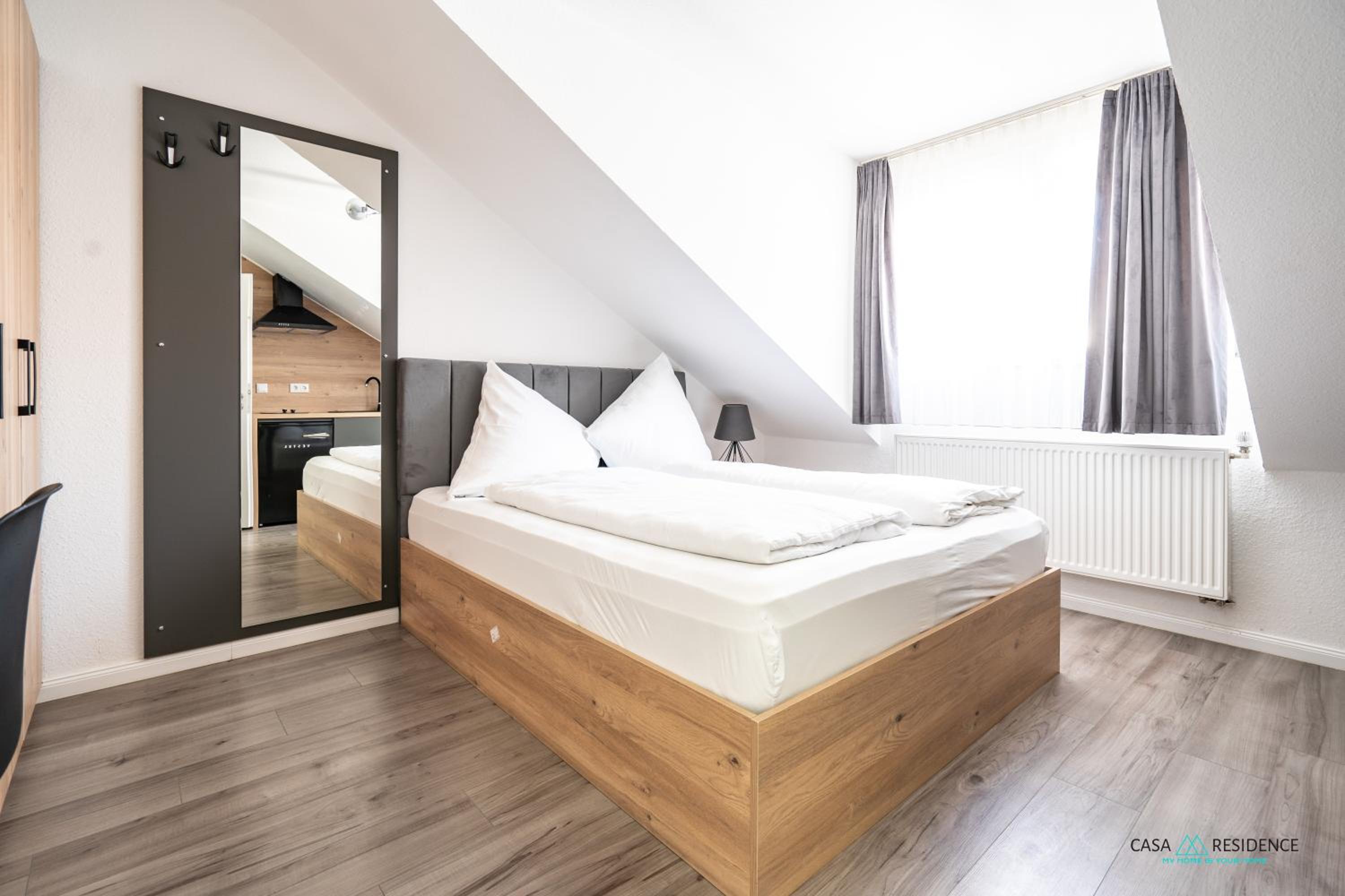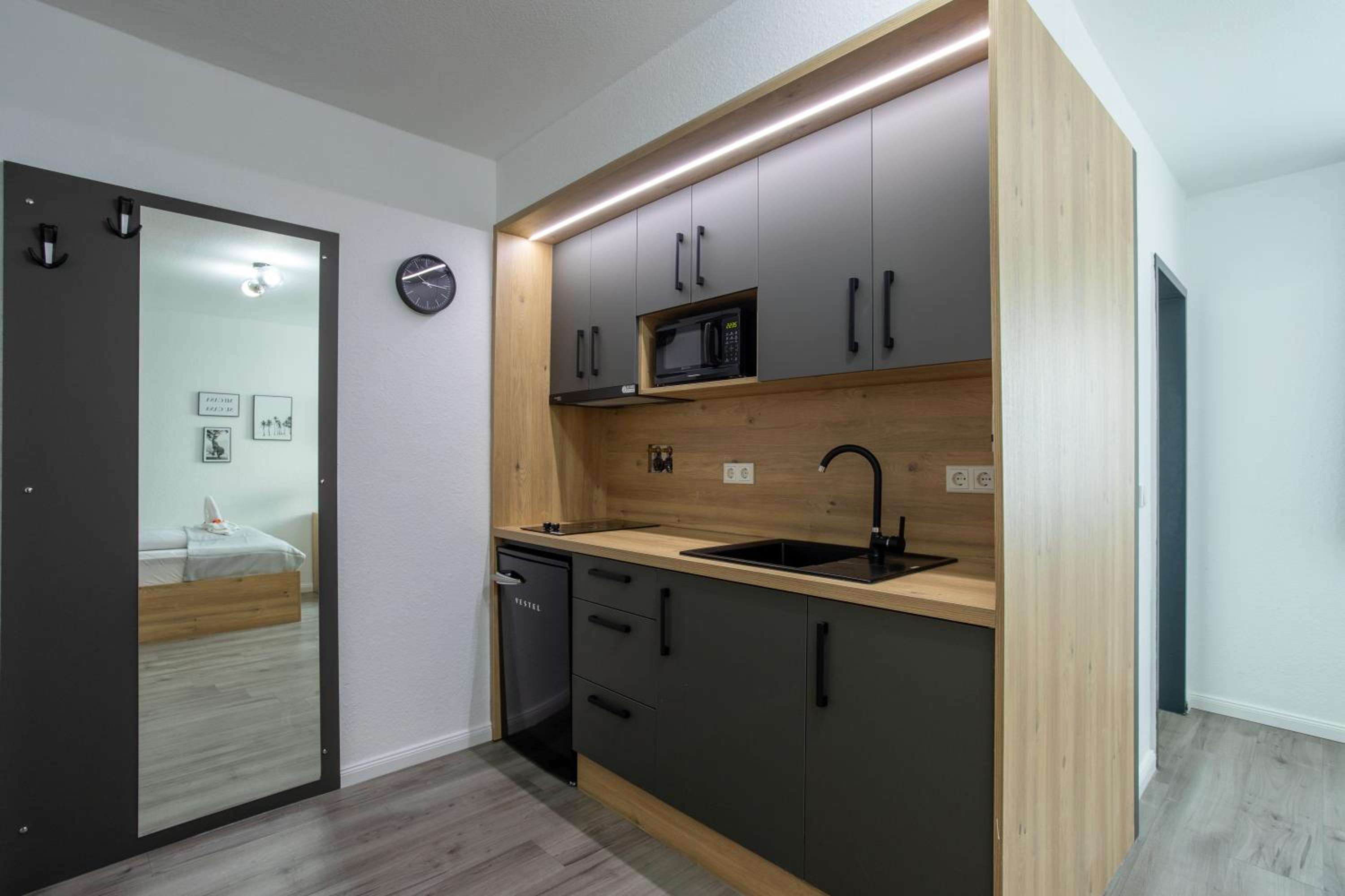 Modern eingerichtetes kleines Appartement mit Mini-Küchezeile, franz. Bett, Duschbad. Überschaubar, funktionell und für einen kurzen Aufenthalt wunderbar.