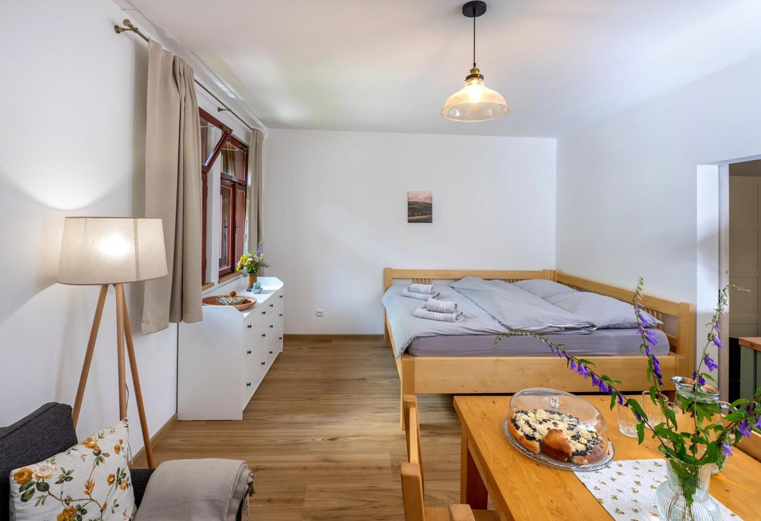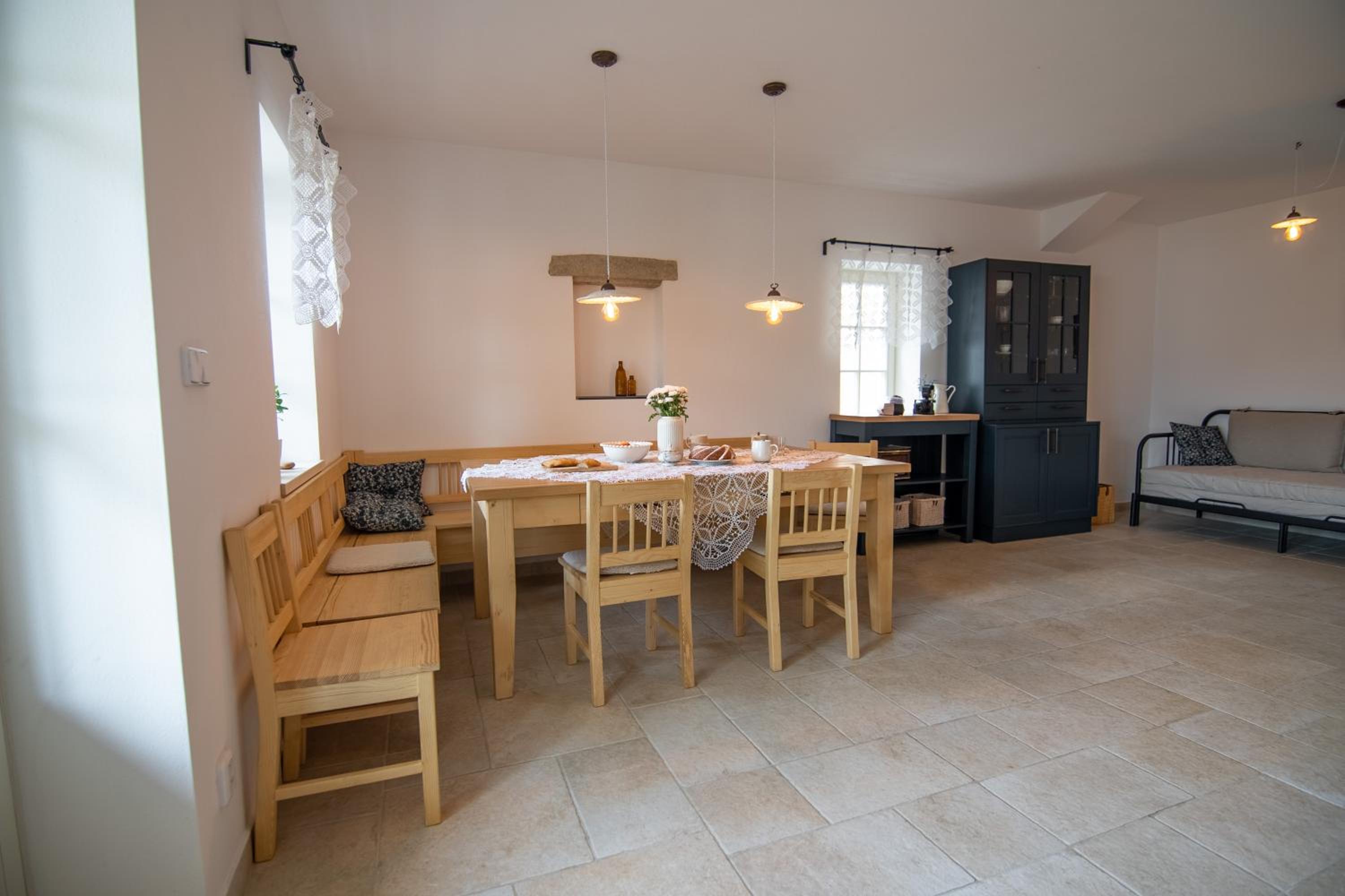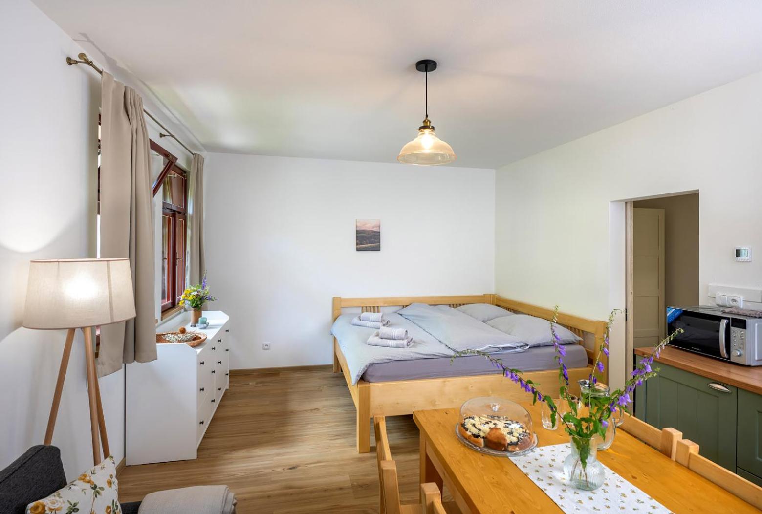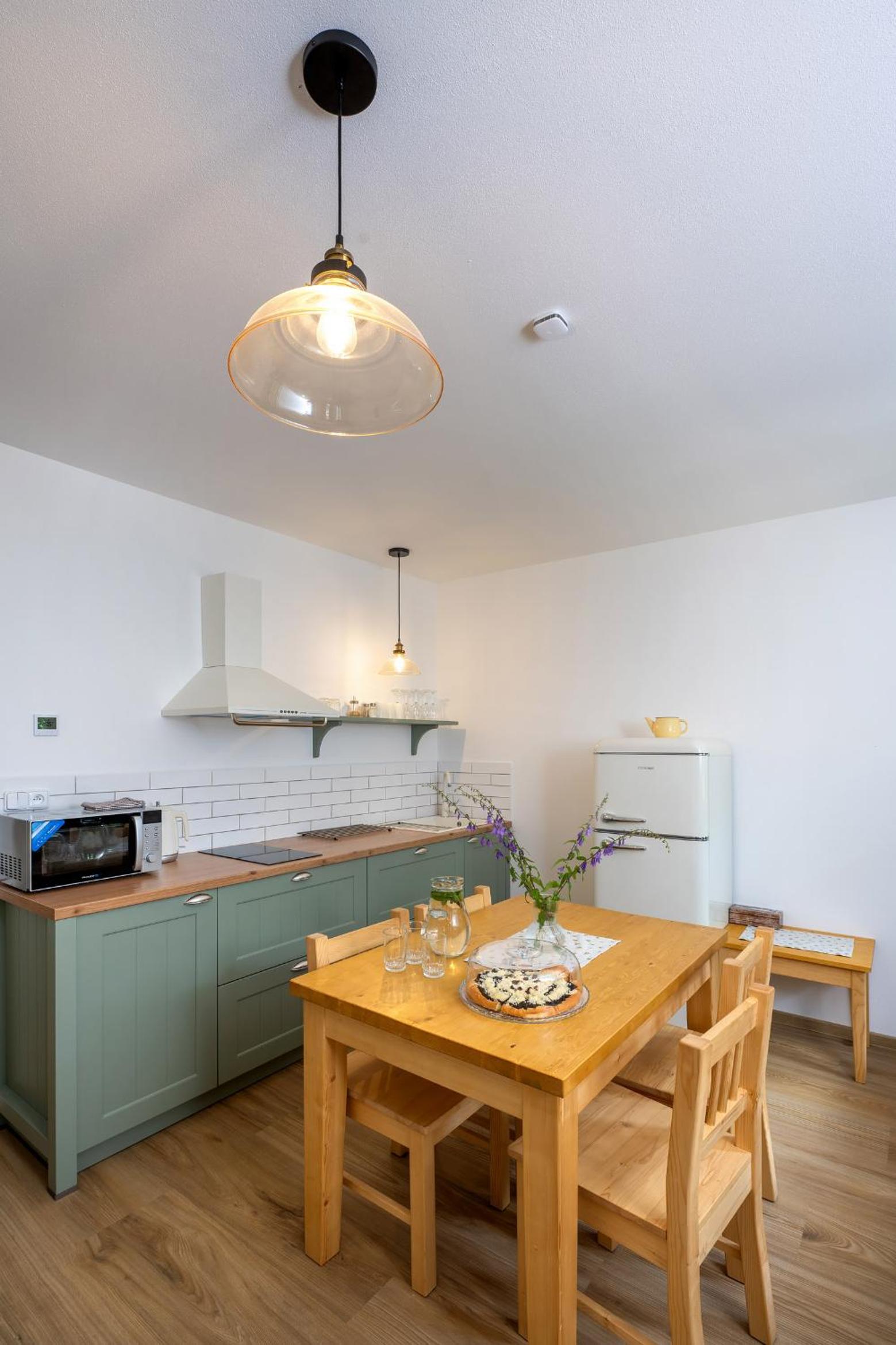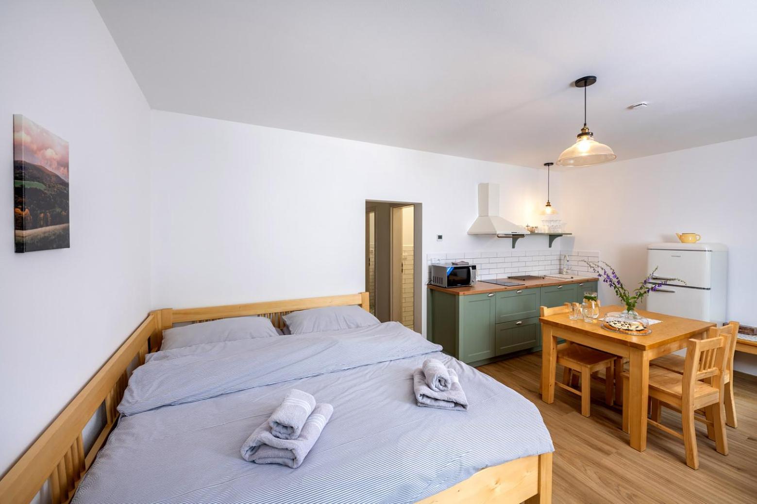 Úžasný, luxusní apartmán. Byli jsme tam s rodinou a pejskem. Krásné prostředí, příjemní majitelé. A ještě úžasnější koláčky od babičky. Nic nám nechybělo. Samoobslužný bar s točeným pivem. Na výběr i víno, limonáda, zmrzlina a jiné pochutiny. Určitě se vrátíme.