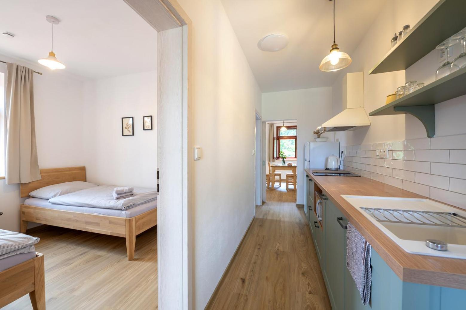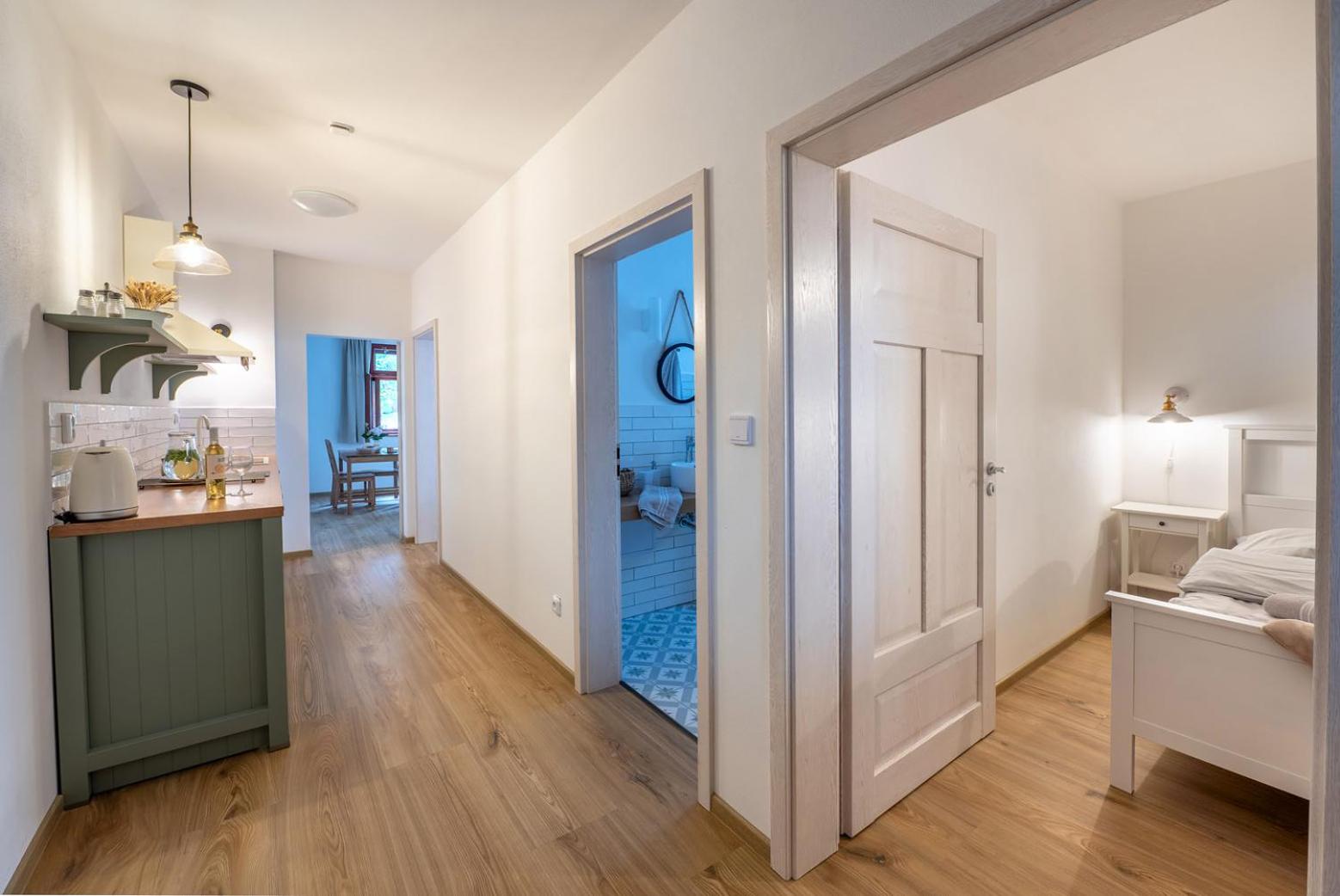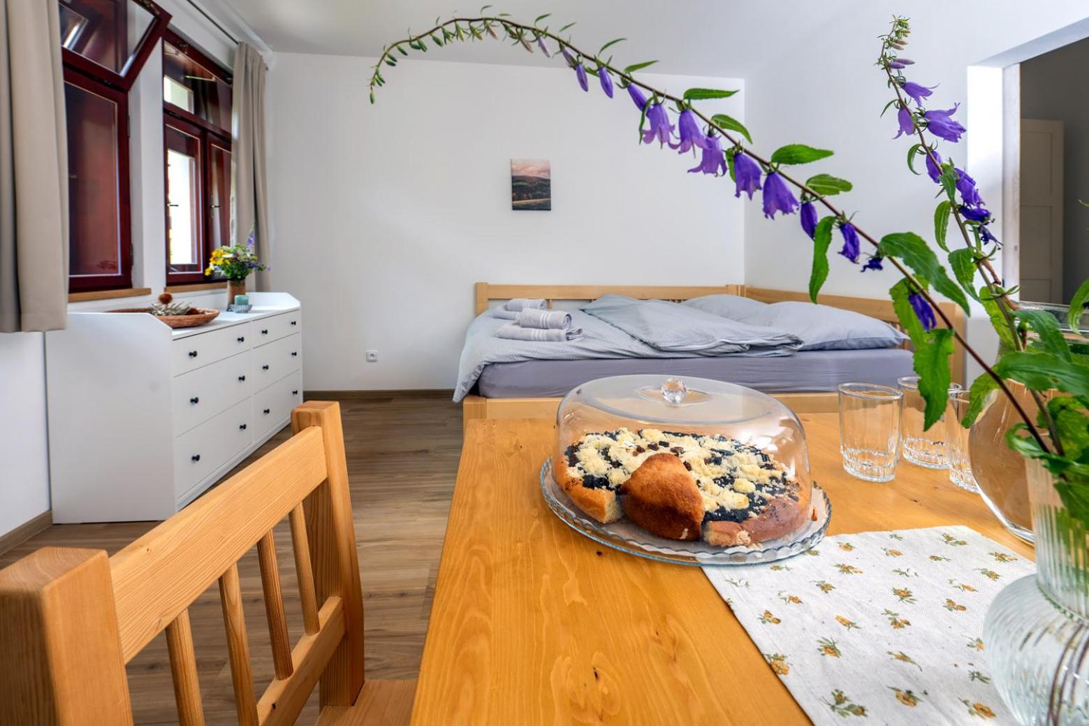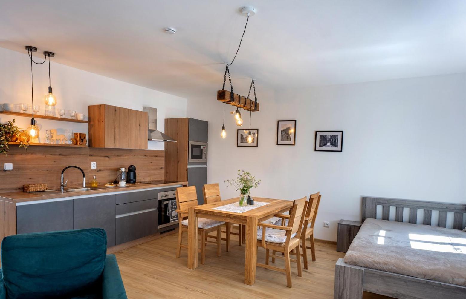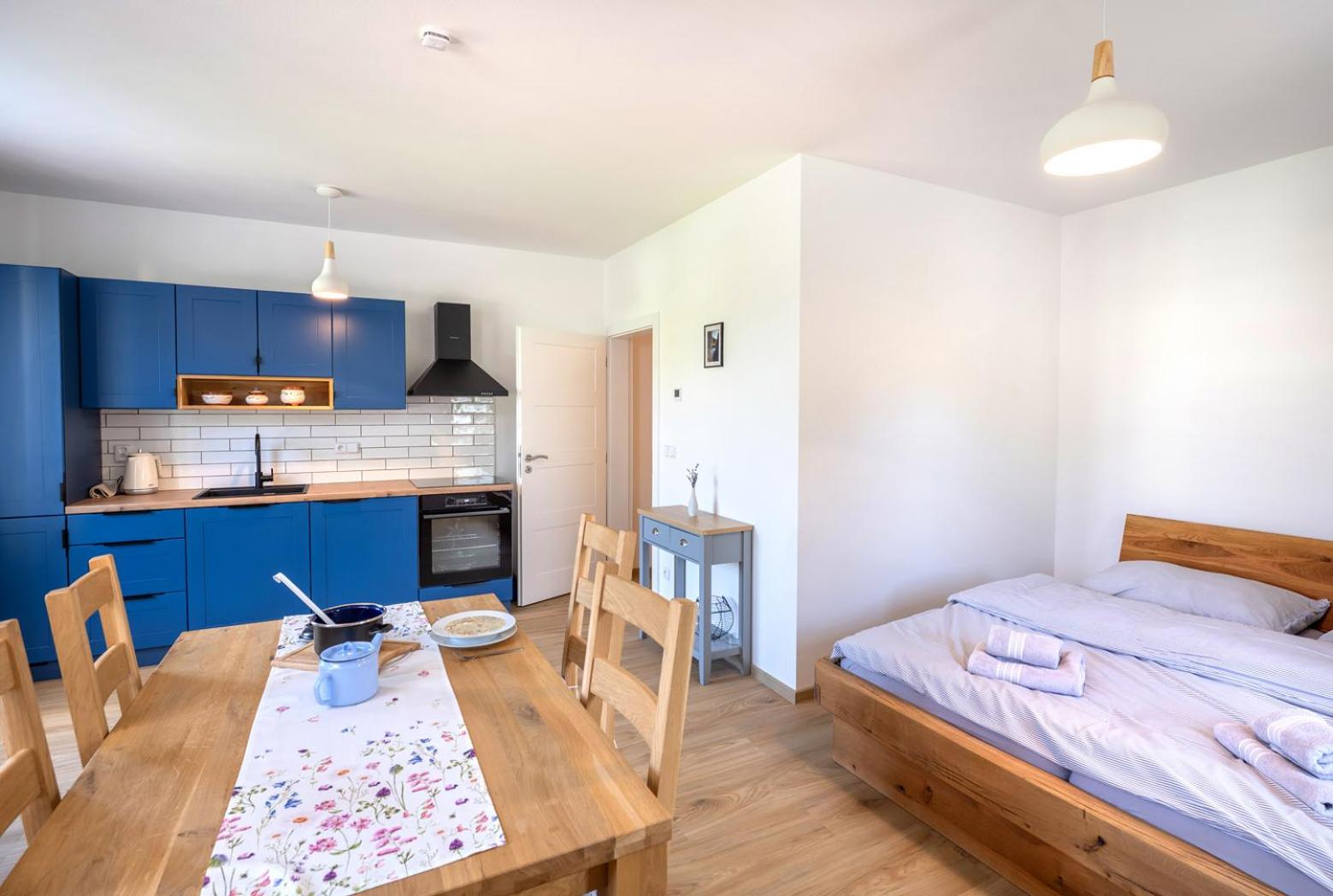 Úžasný, luxusní apartmán. Byli jsme tam s rodinou a pejskem. Krásné prostředí, příjemní majitelé. A ještě úžasnější koláčky od babičky. Nic nám nechybělo. Samoobslužný bar s točeným pivem. Na výběr i víno, limonáda, zmrzlina a jiné pochutiny. Určitě se vrátíme.