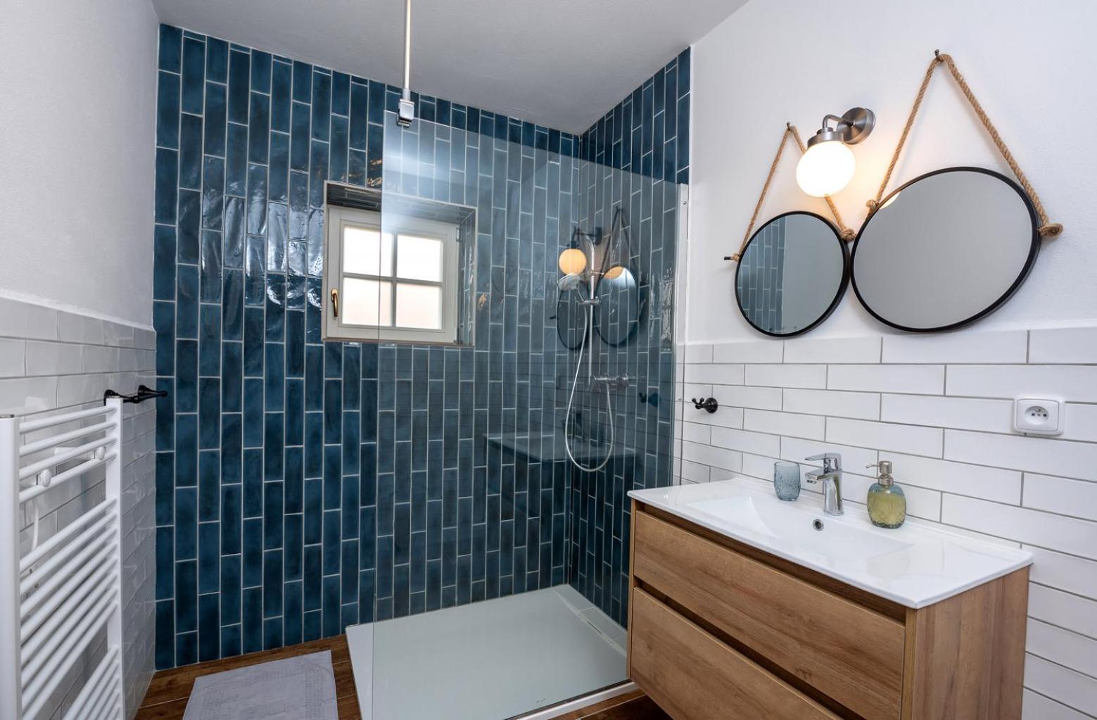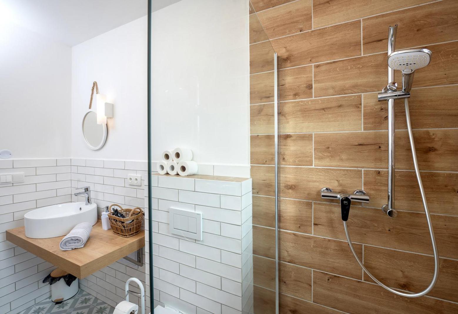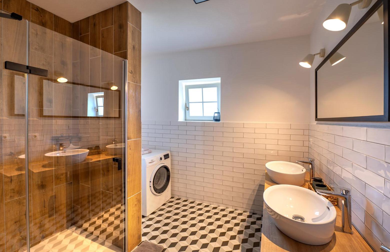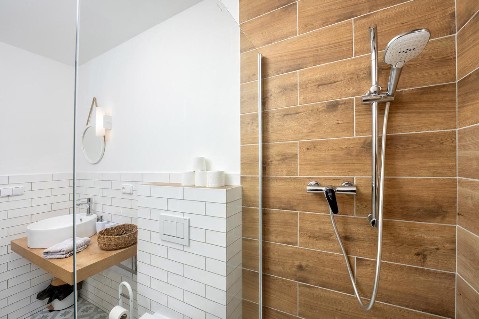 Weak water flow from the small shower heads. No shower soap or laundry powder/capsules provided.