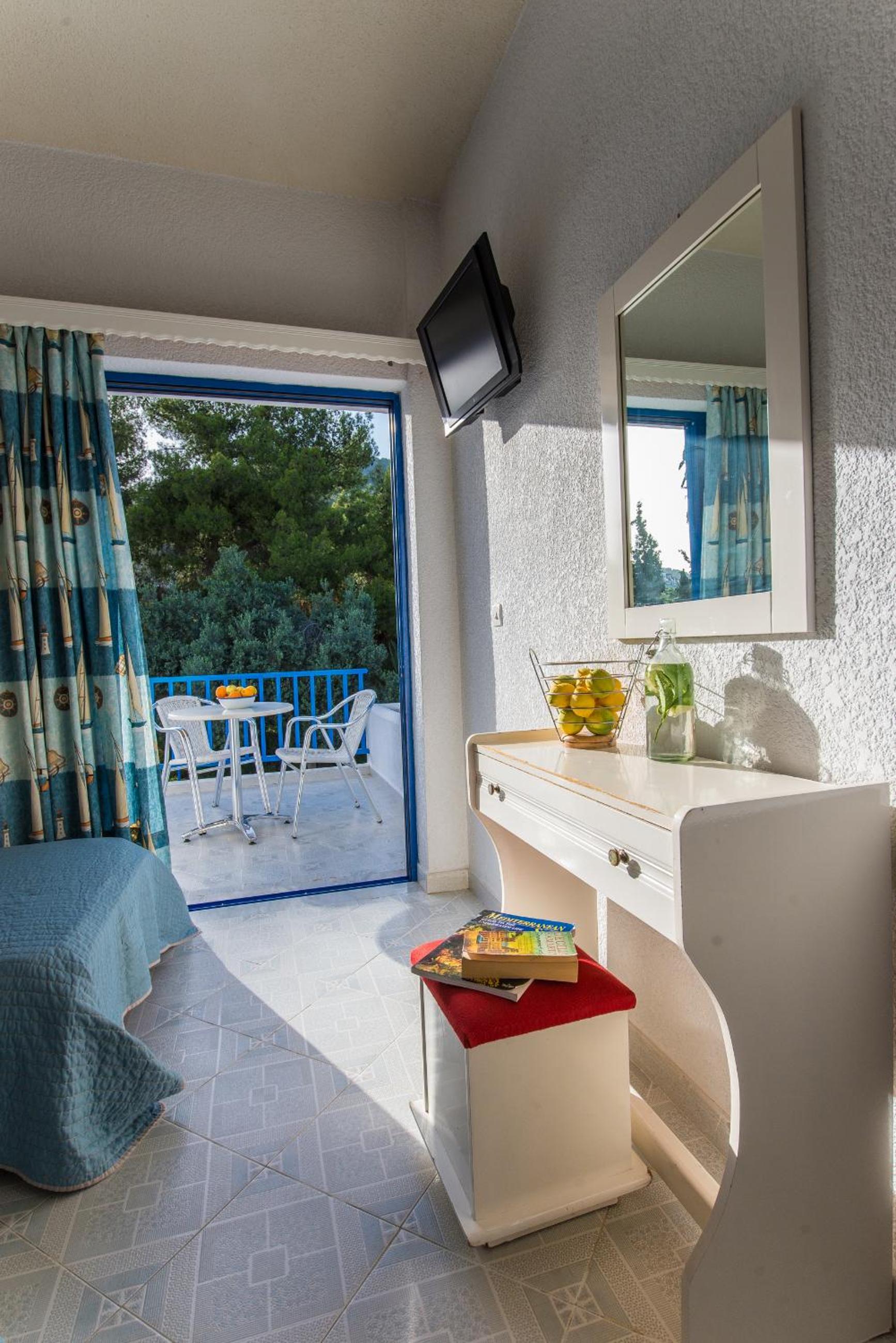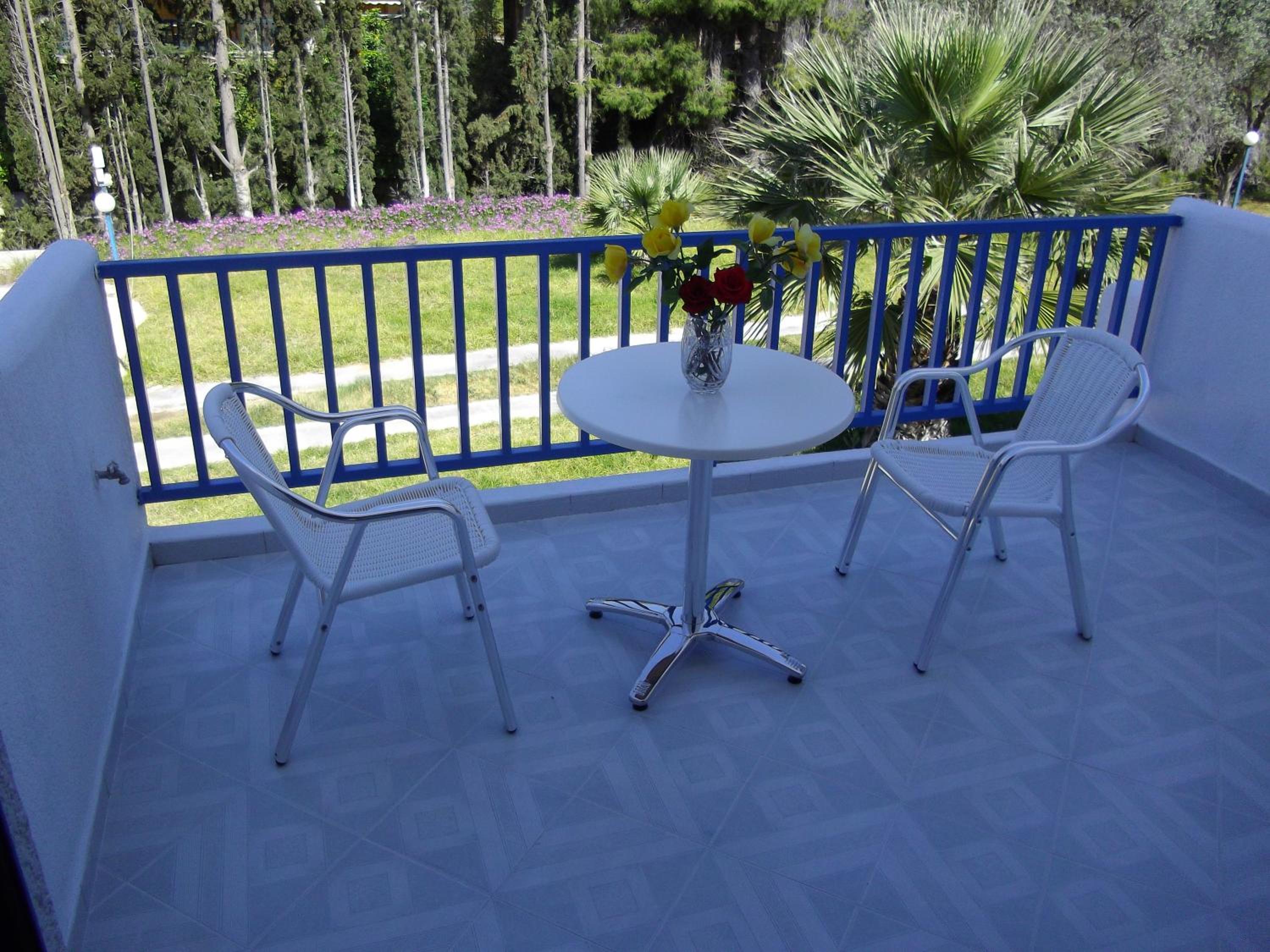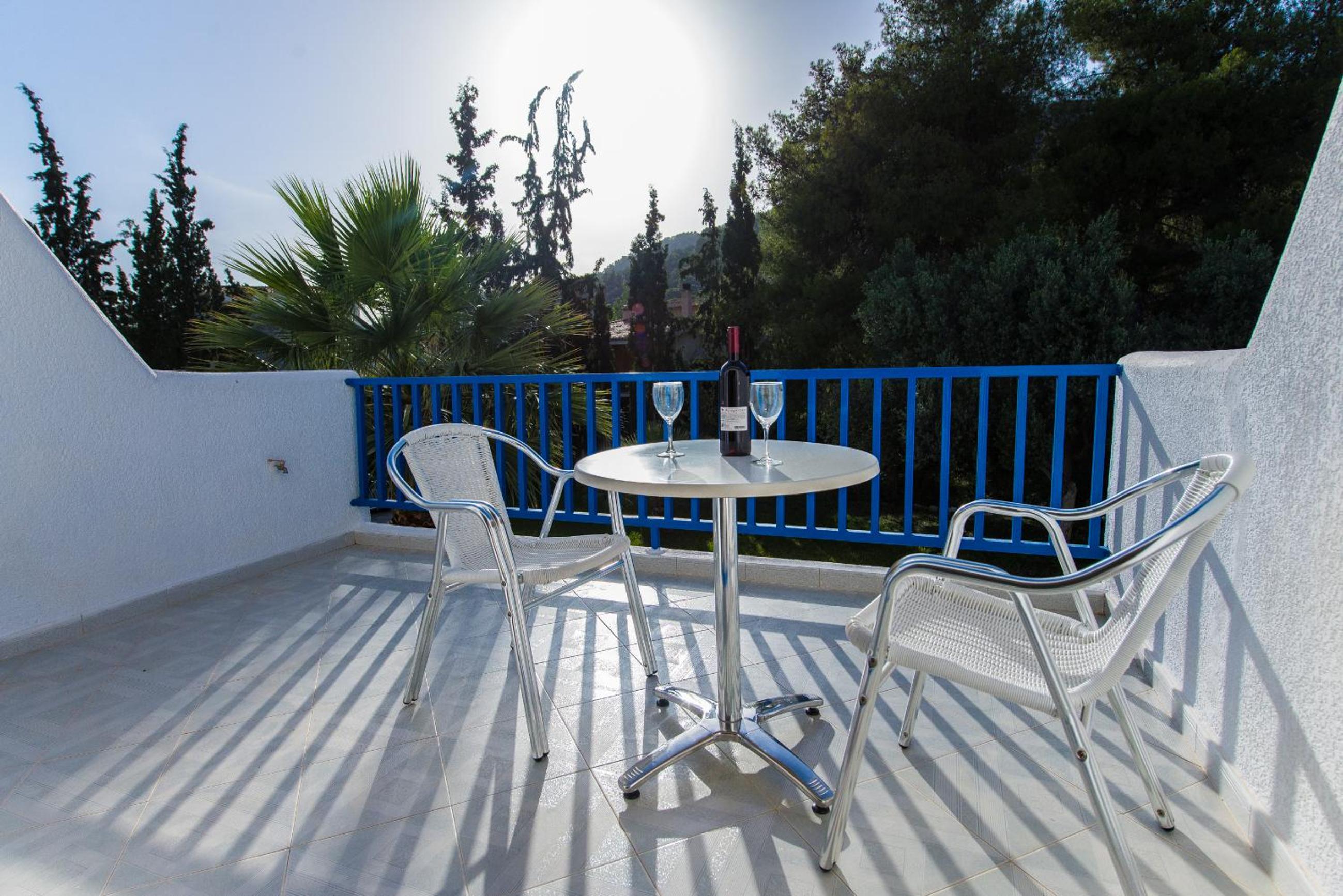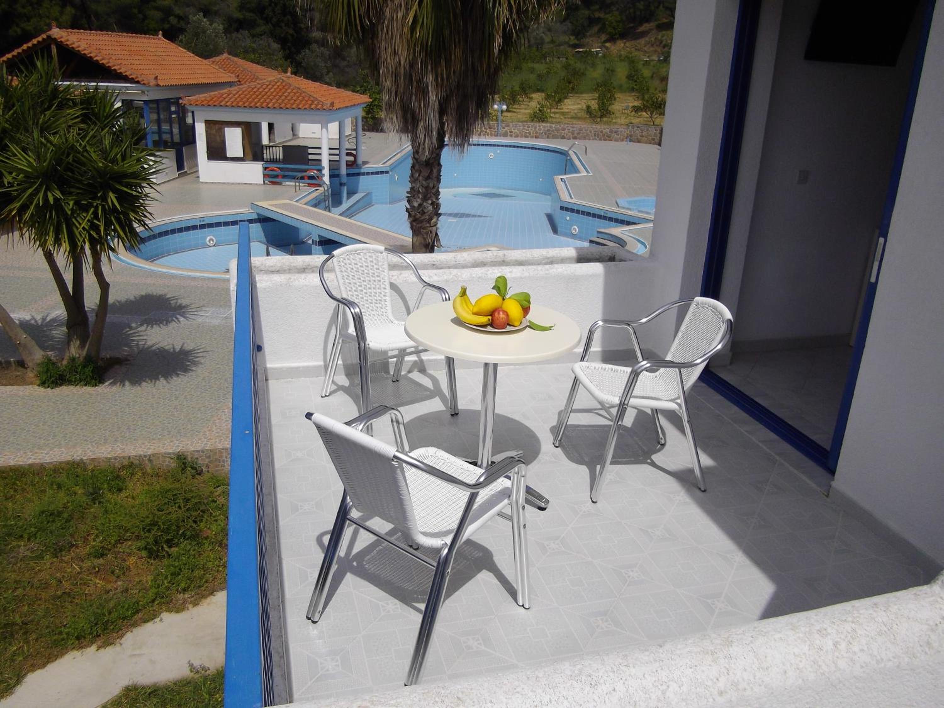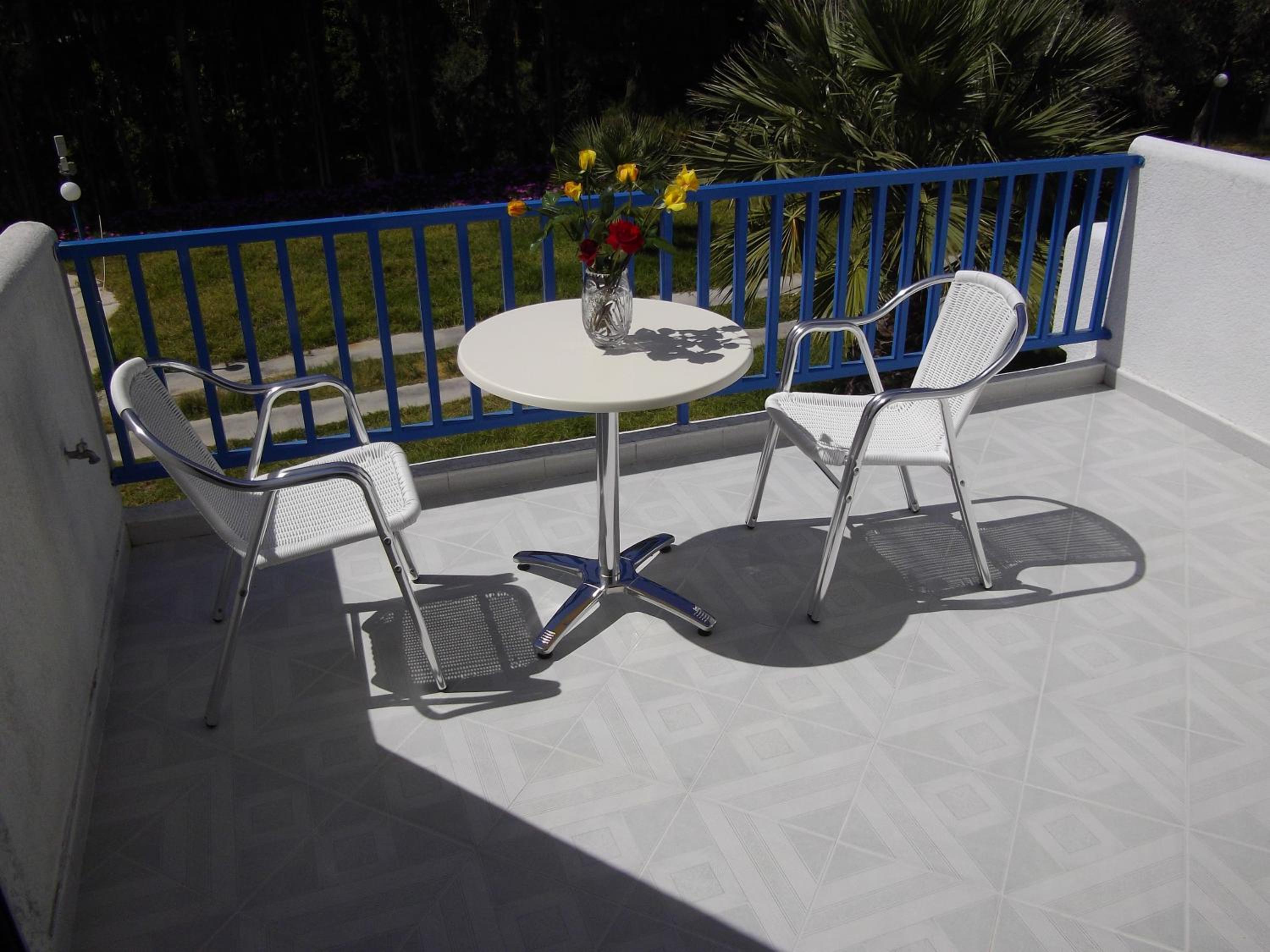 Cozy Studios with Views: Our air-conditioned studios boast furnished balconies overlooking the sun terrace, providing a perfect spot to unwind and soak in the tranquil atmosphere.