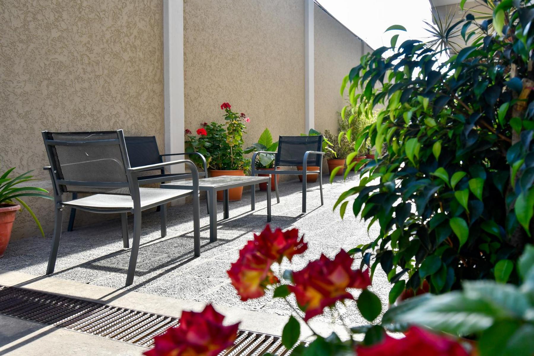 Frente al apto, segundo piso, apenas cabe una silla entonces para sentarse fuera comodamente tocaba bajar a las areas comunes. Ubicacion algo lejos del centro.