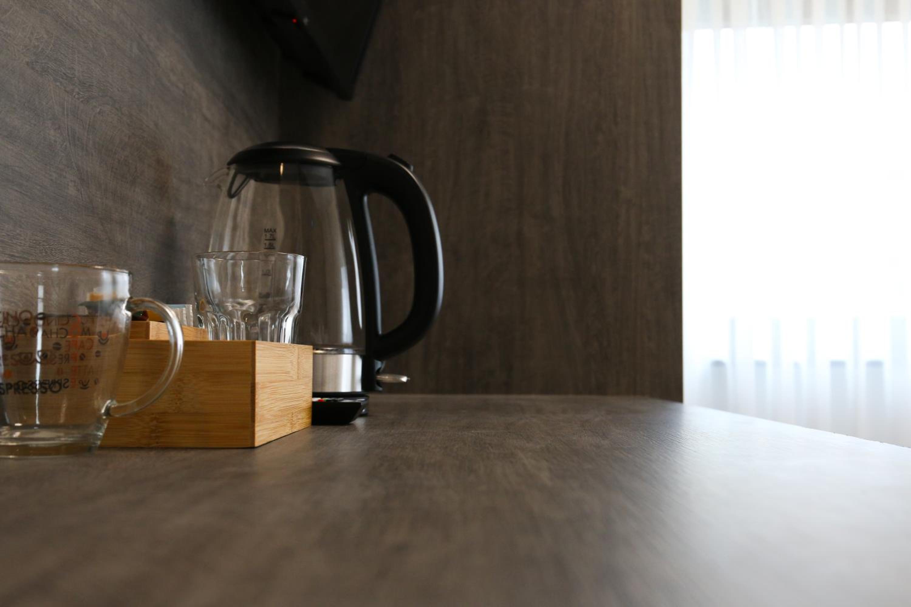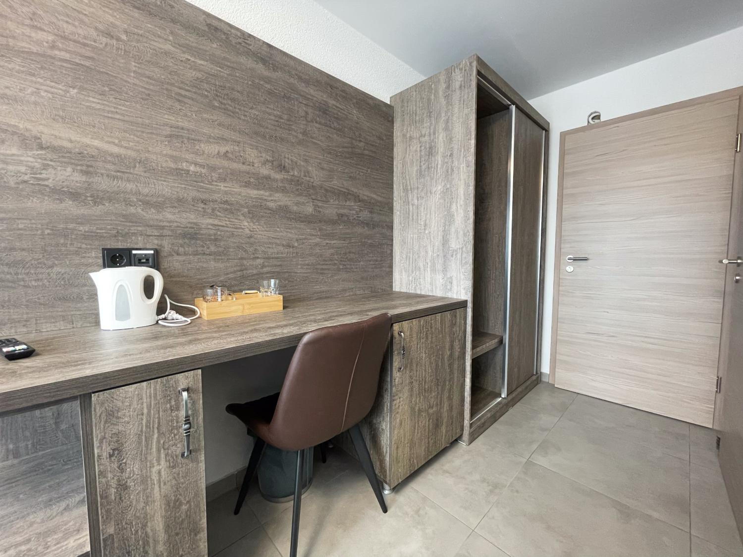 Im Zimmer gab es einen Wasserkocher sowie Tee und Kaffee. Außerdem stand ein Kühlschrank mit einer Flasche Wasser zur Verfügung. Es gab auch ein Reiserasierset sowie eine Zahnbürste mit Zahnpasta auch eingepackt.