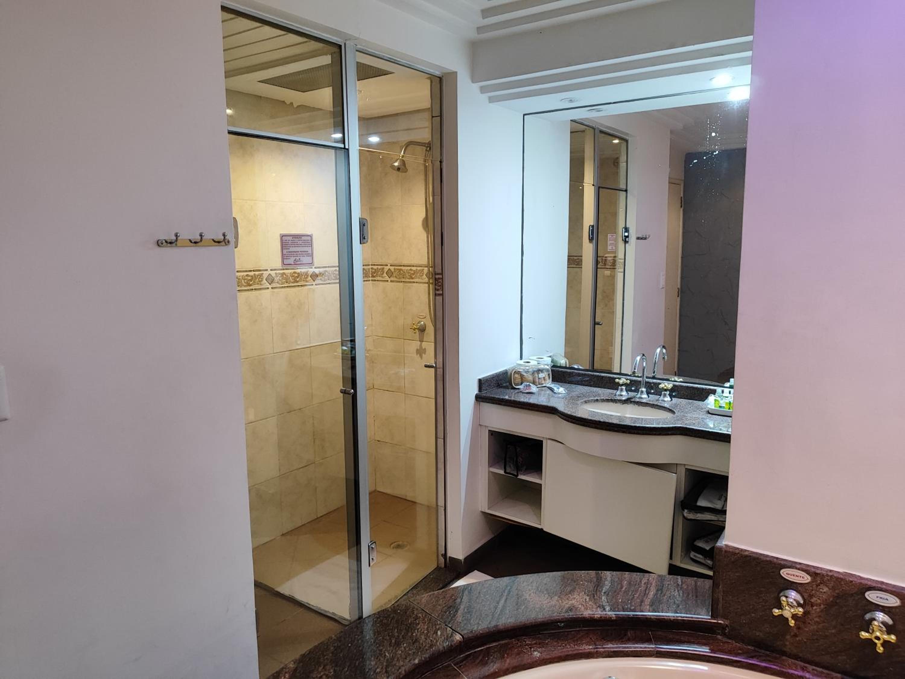 Está bem desgastado o quarto, descascando, registro da privada caindo e ralo do chuveiro entupido.