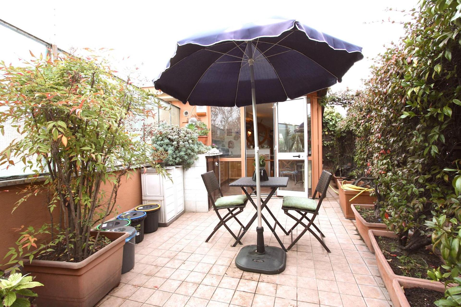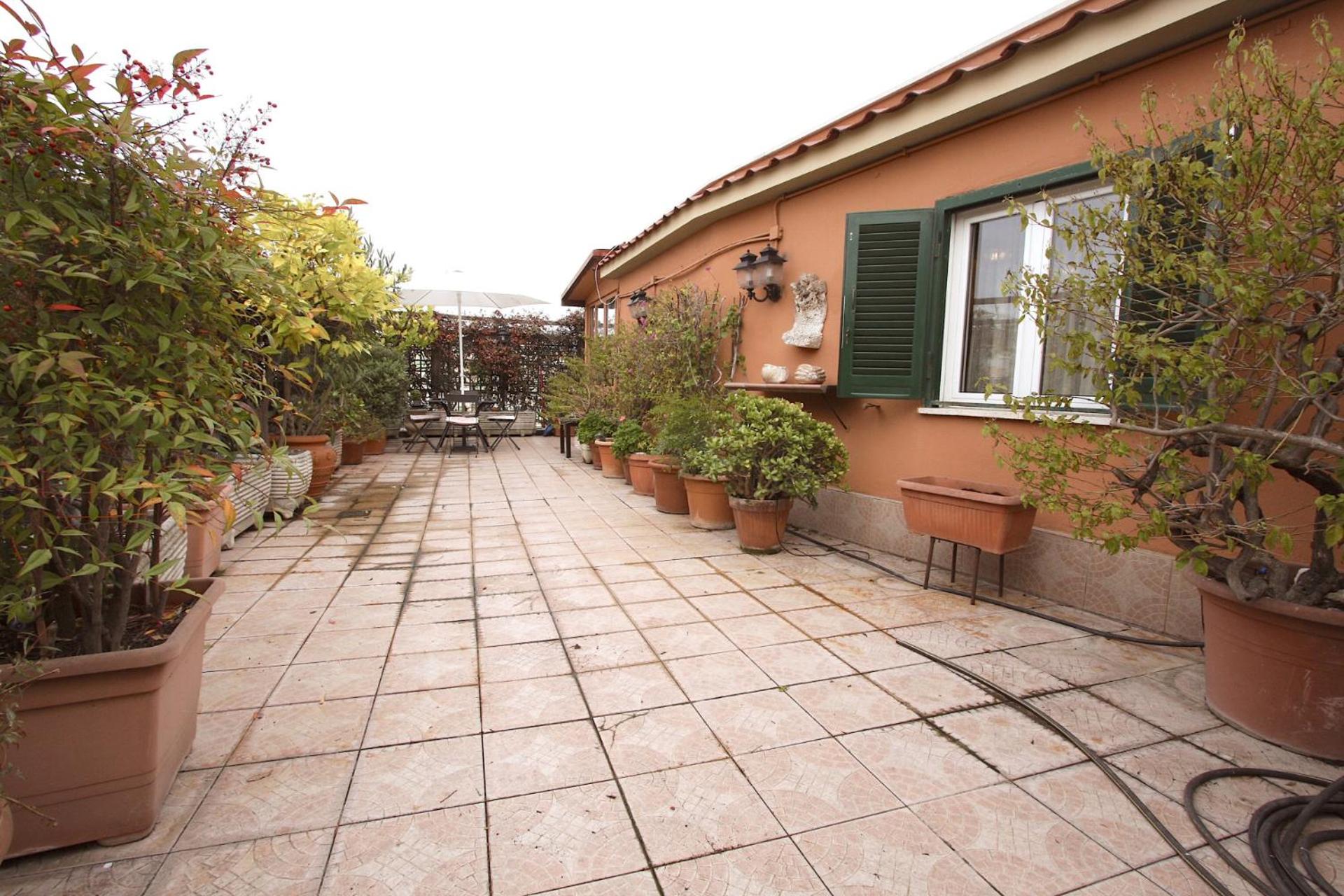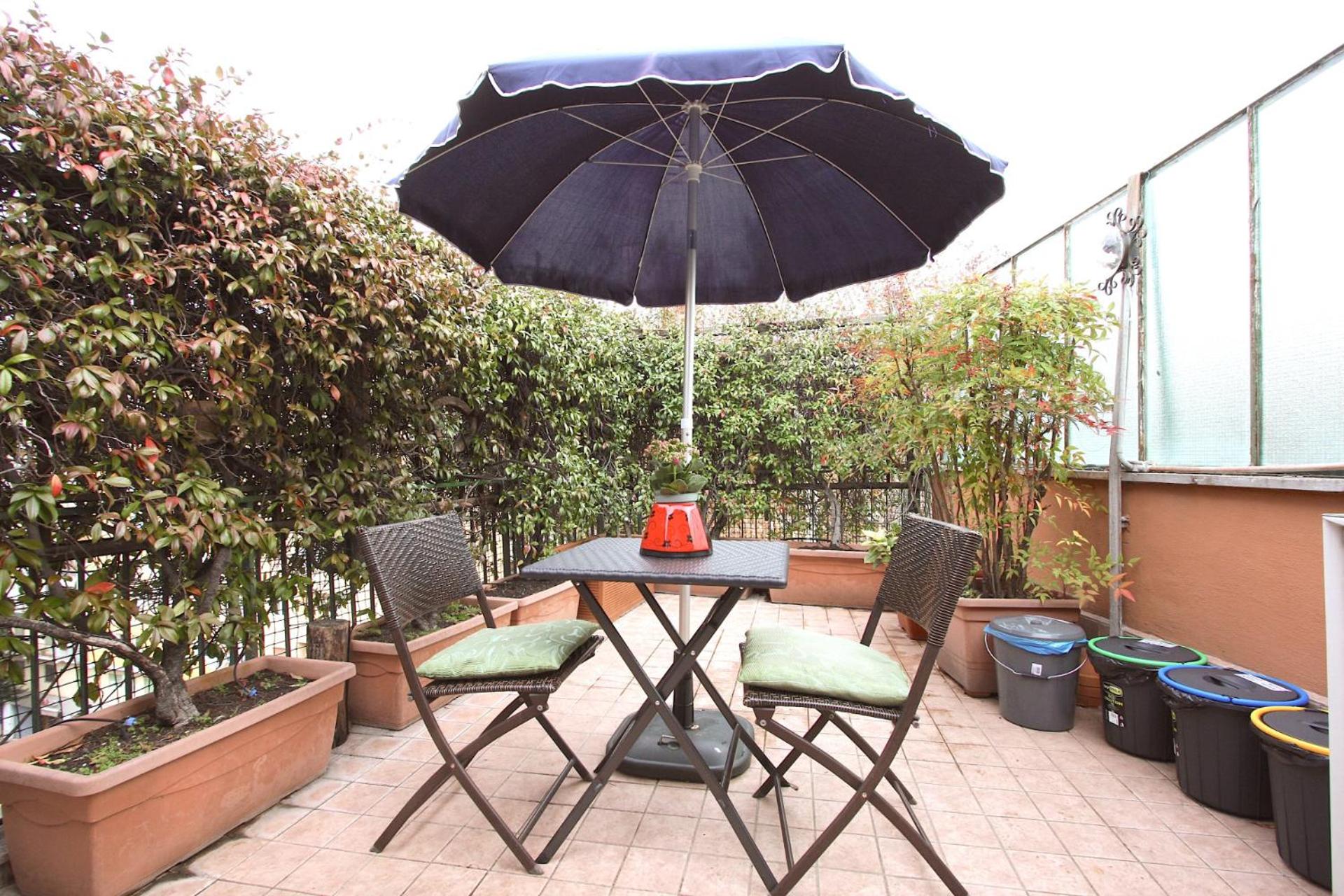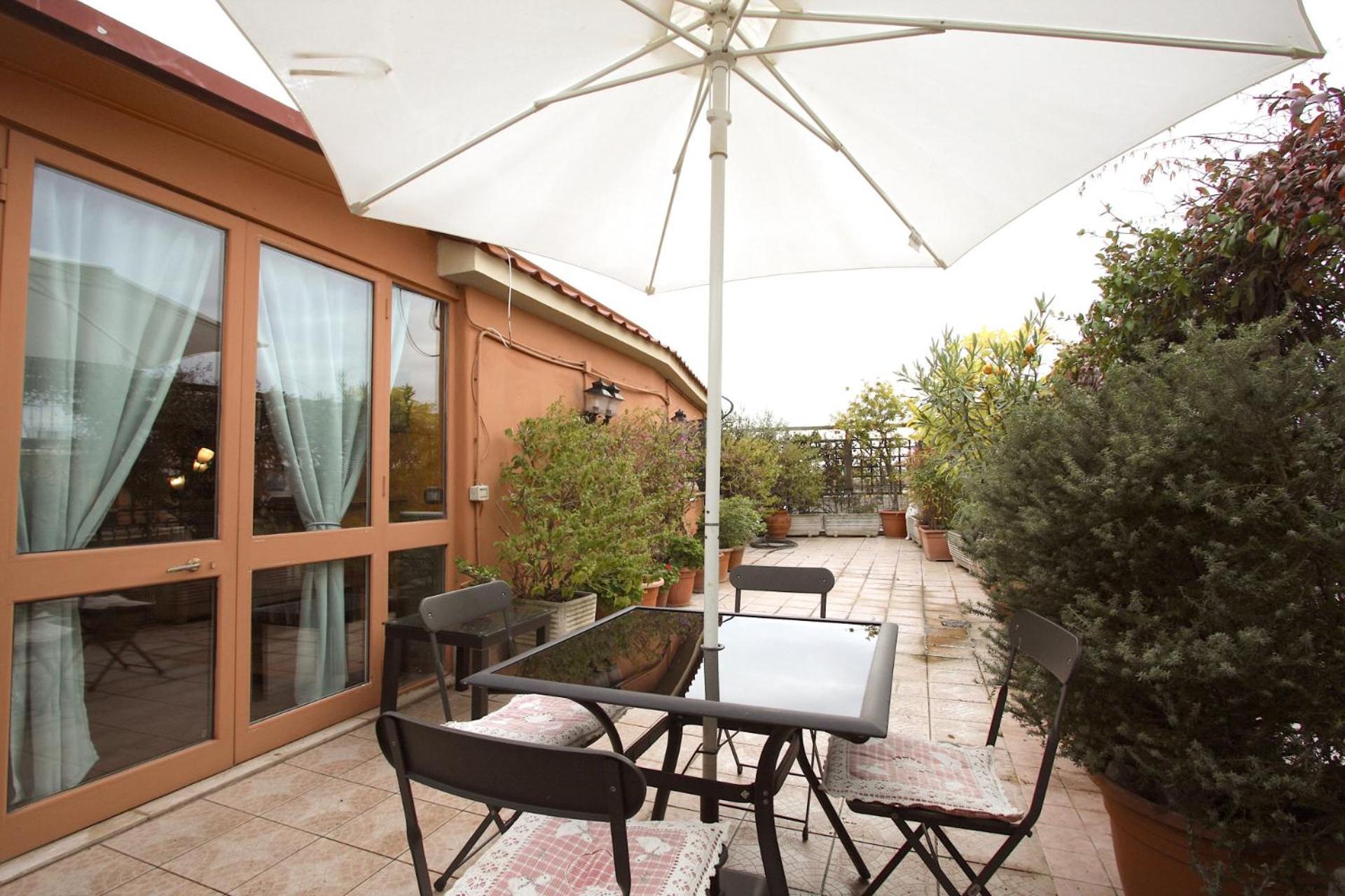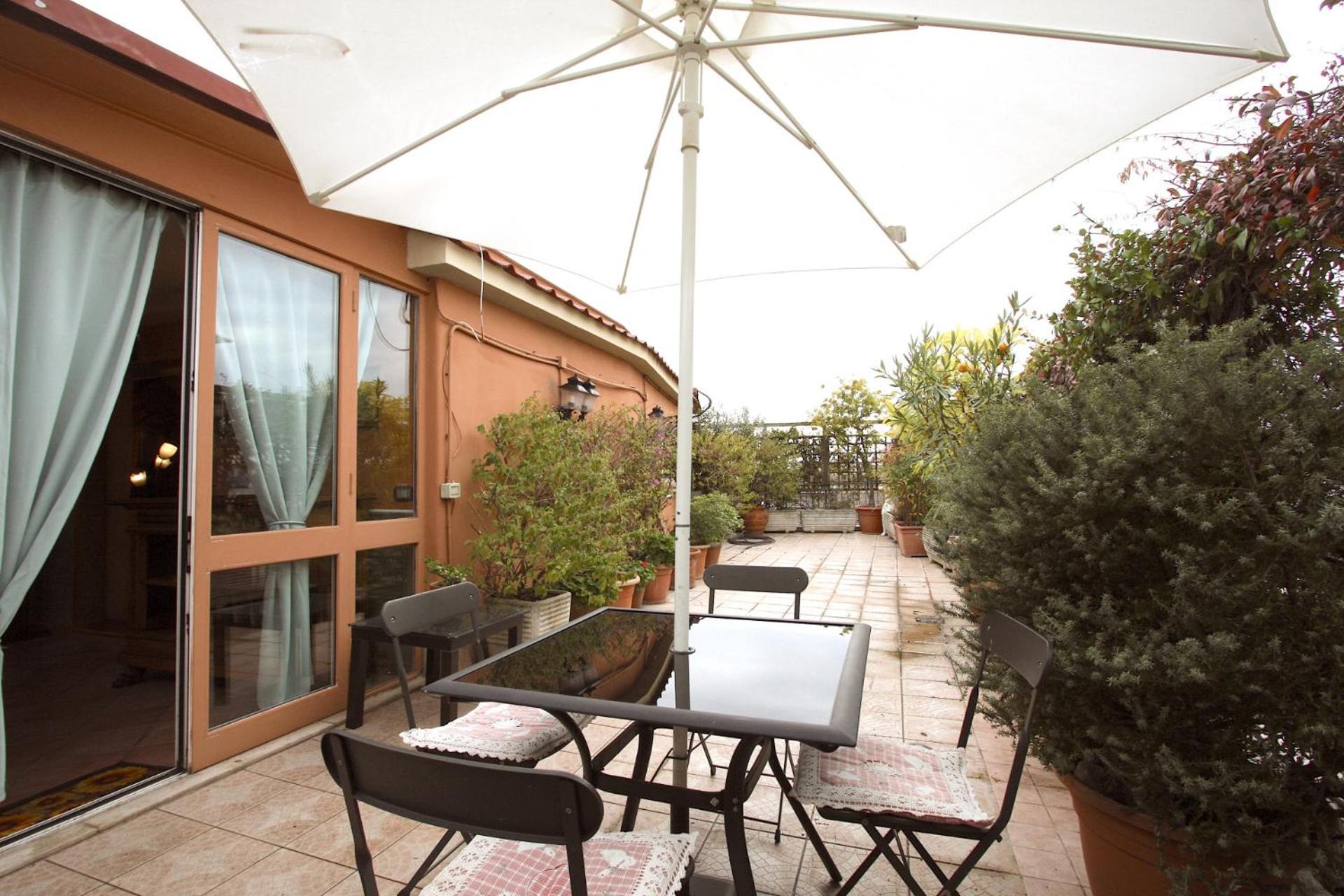 Experience a spacious 1-bedroom penthouse with a terrace in Rome, featuring modern amenities like air conditioning, free WiFi, and a fully equipped kitchen for your comfort.