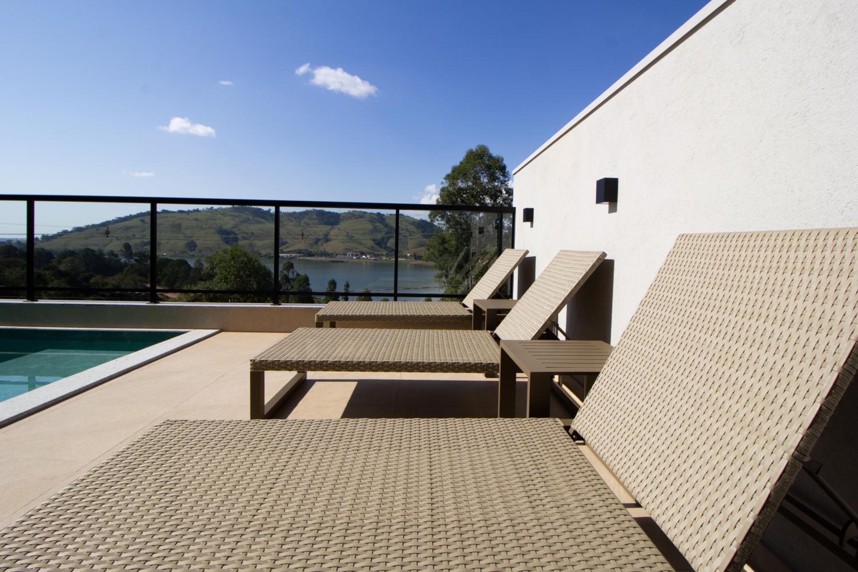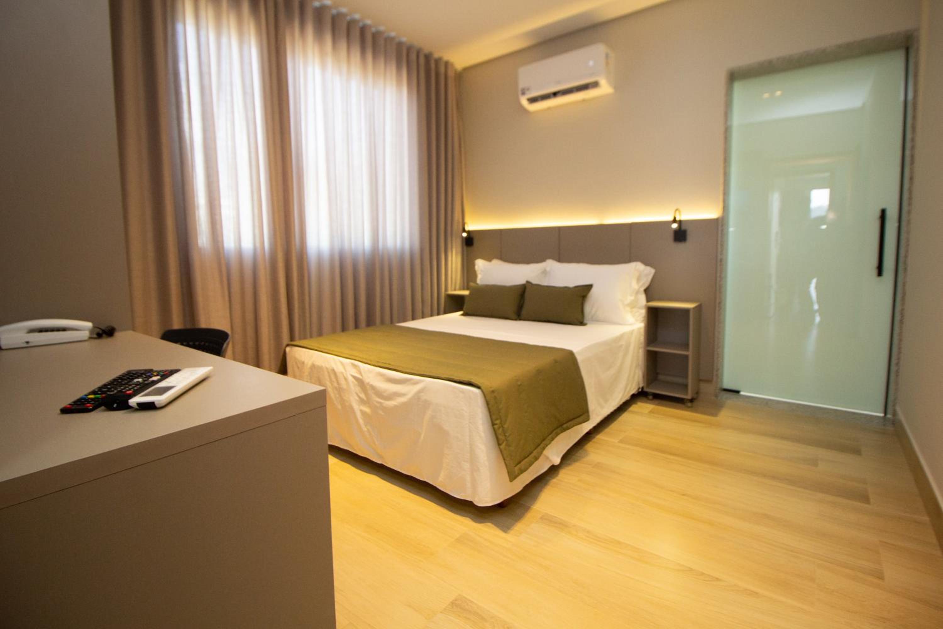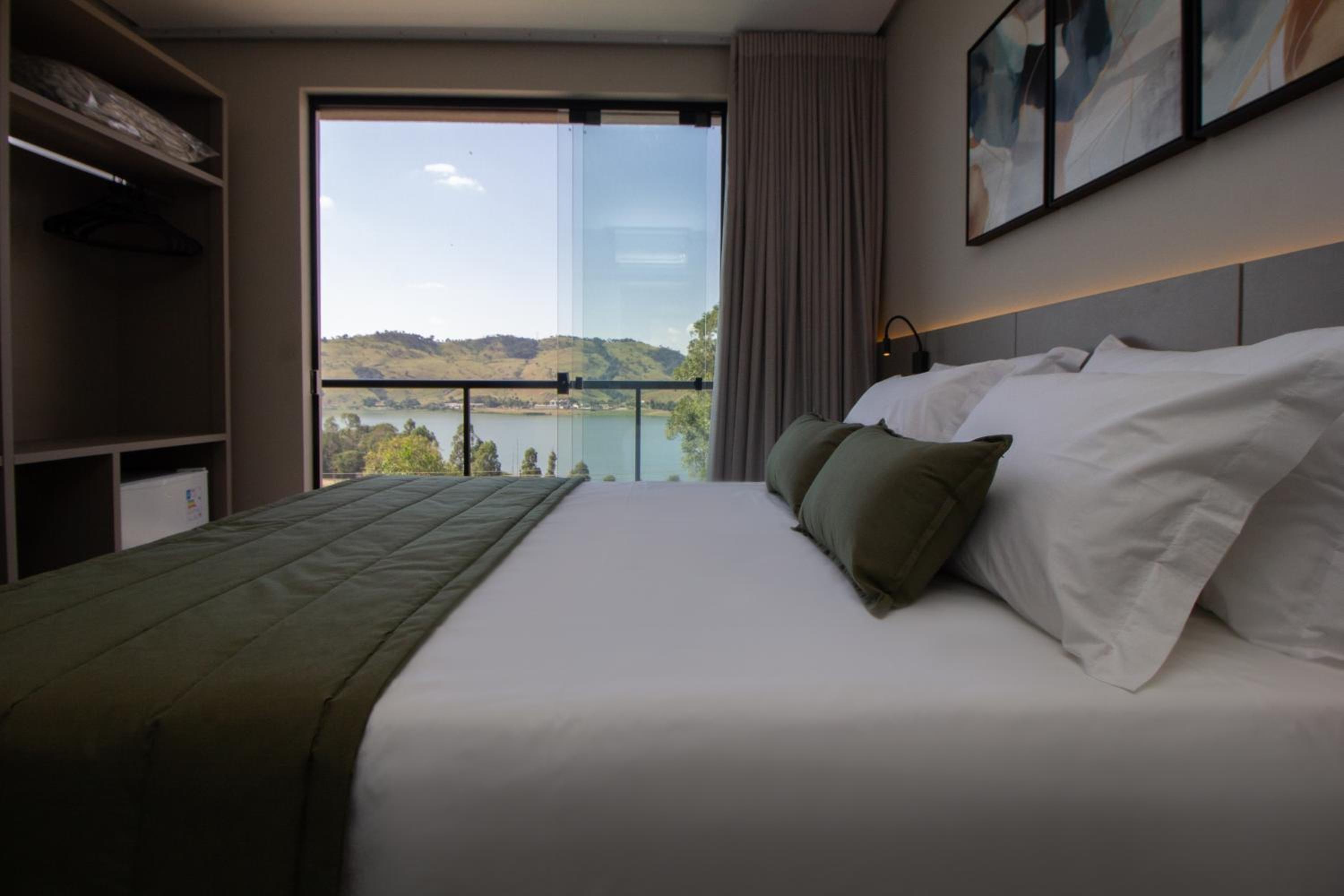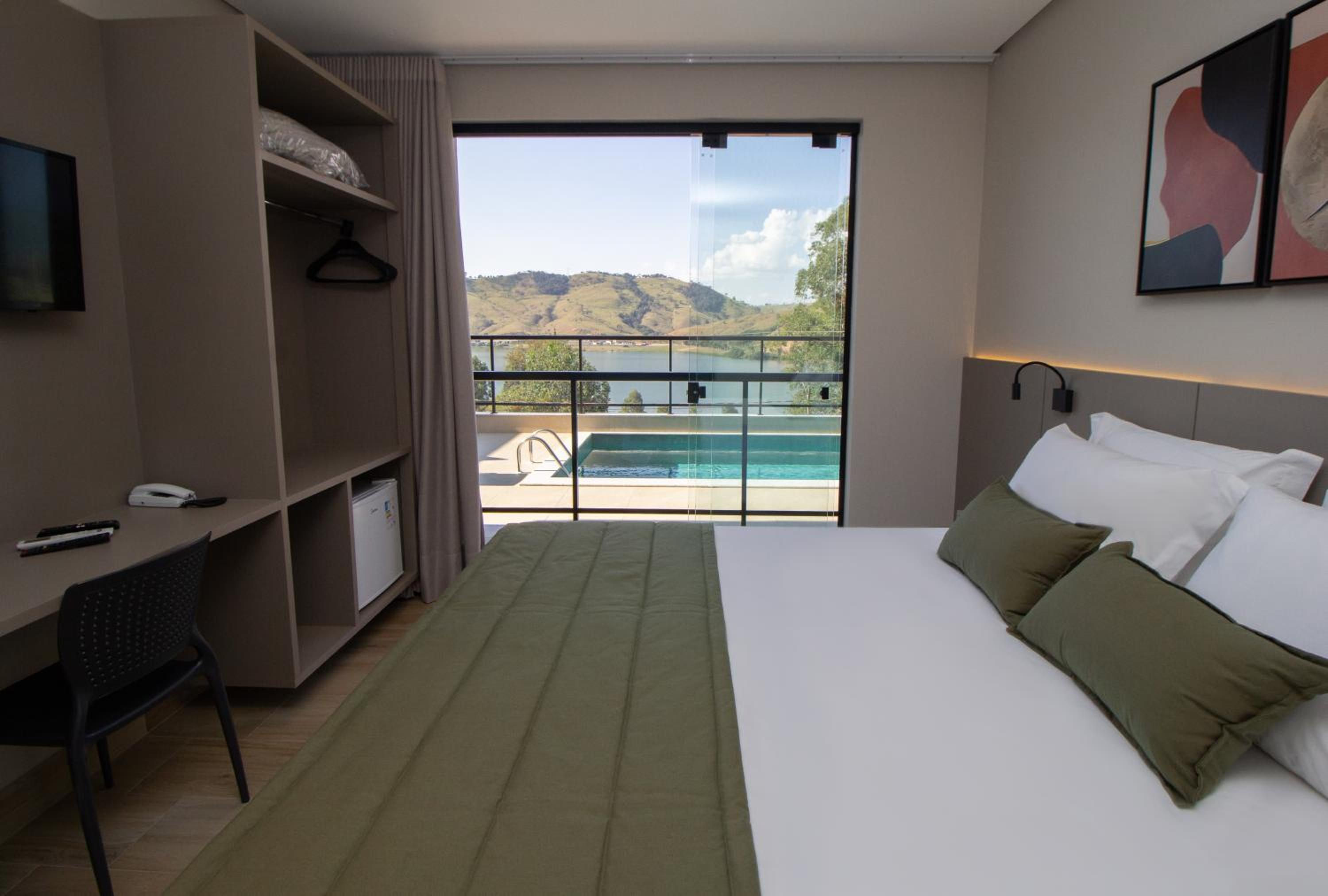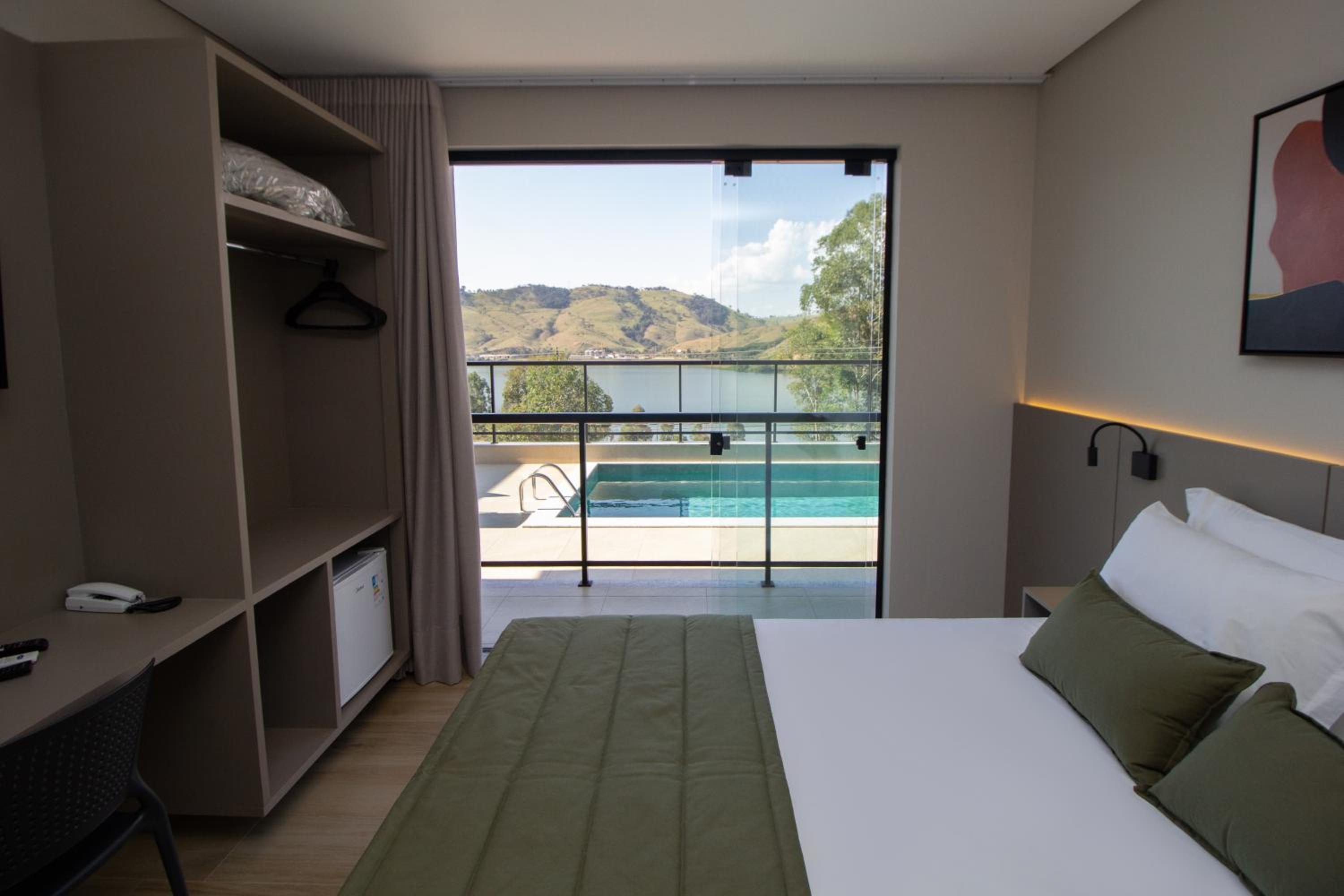 O quarto tem um tamanho ótimo, lugar para acomodar a bagagem, mesas de cabeceira, iluminação ótima, excelente roupa de cama e banho. Chuveiro potente e quente. Ar condicionado funcionando perfeitamente. Amei cada detalhe. A piscina tem vista para o lago. Tudo muito bem pensado.