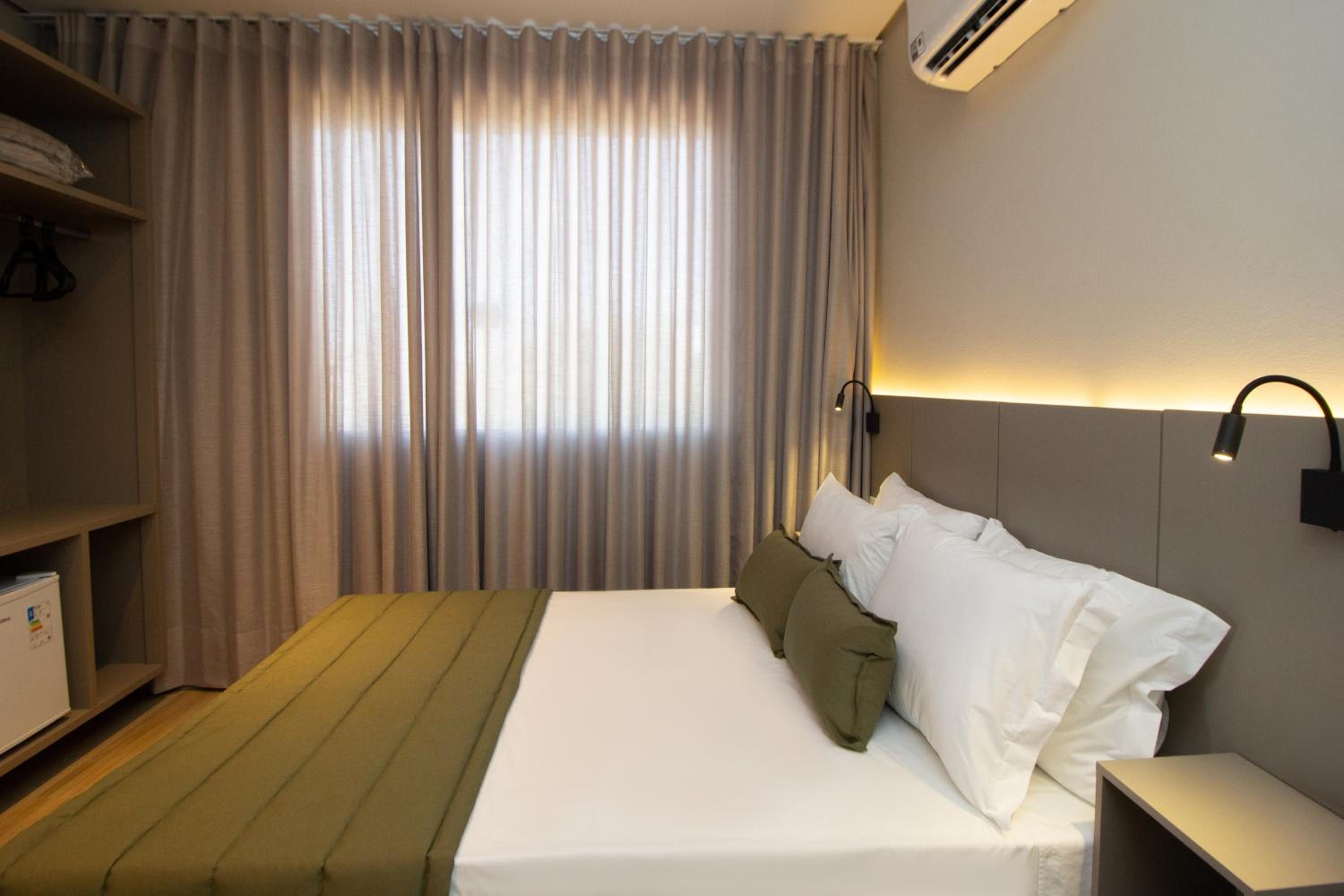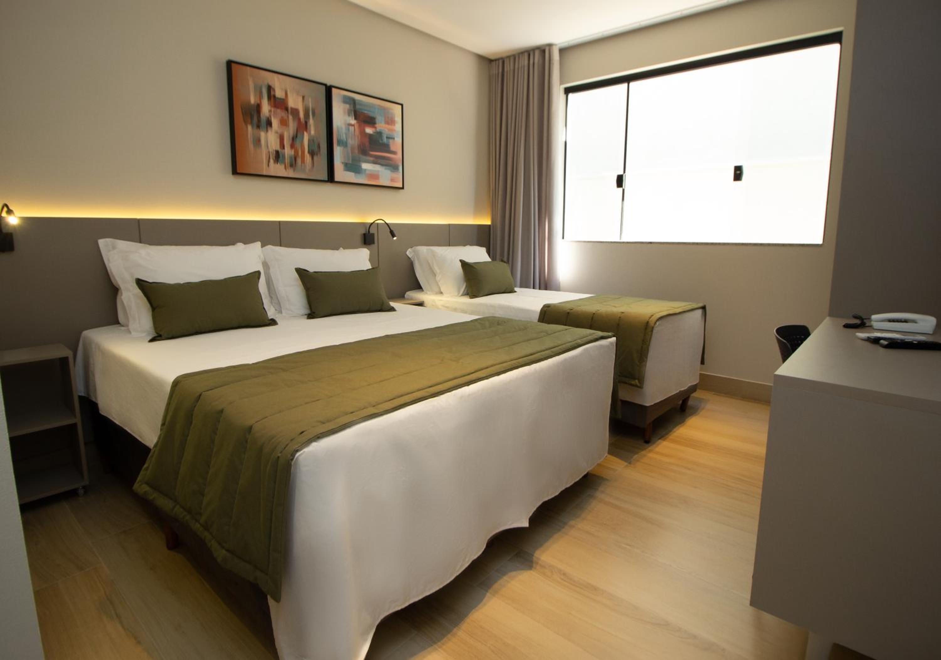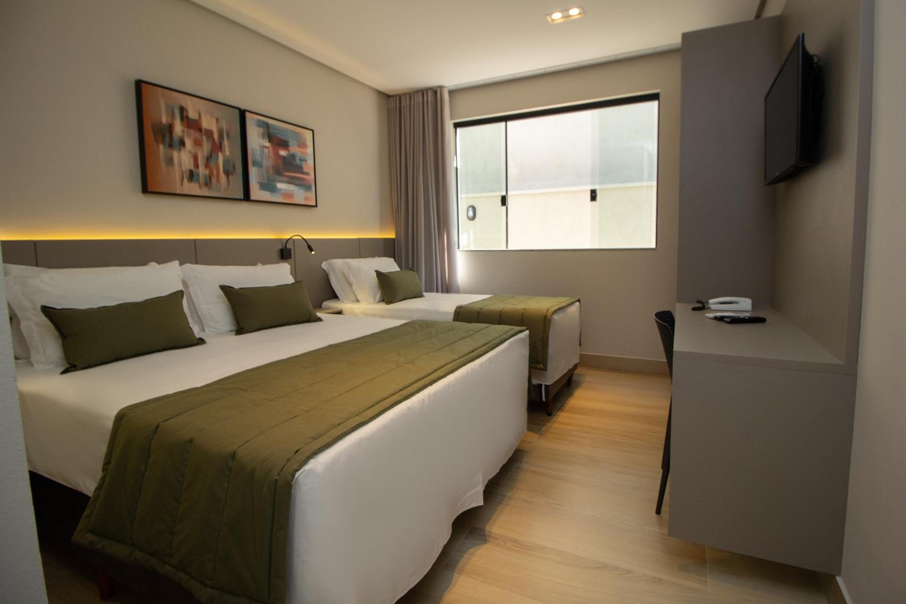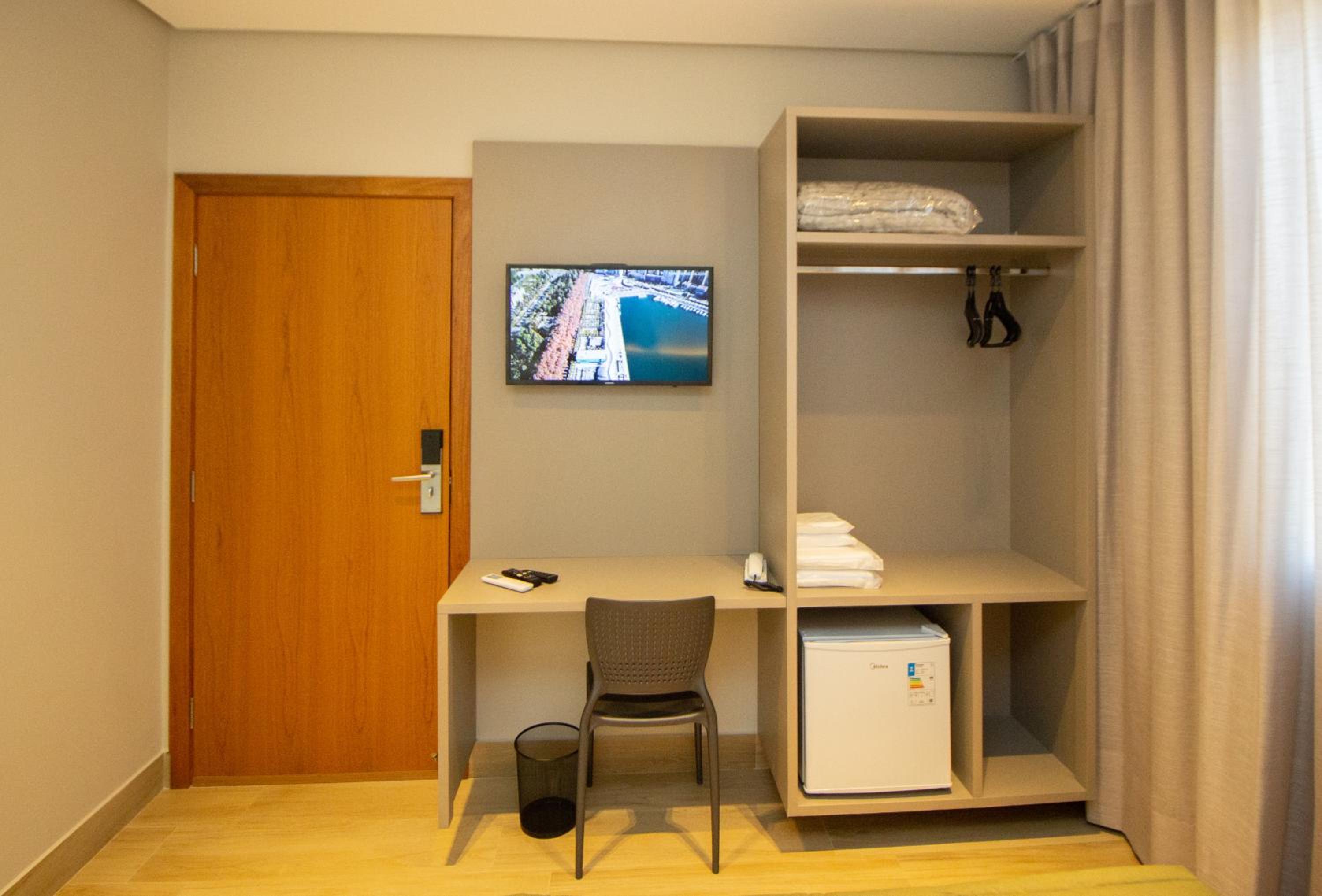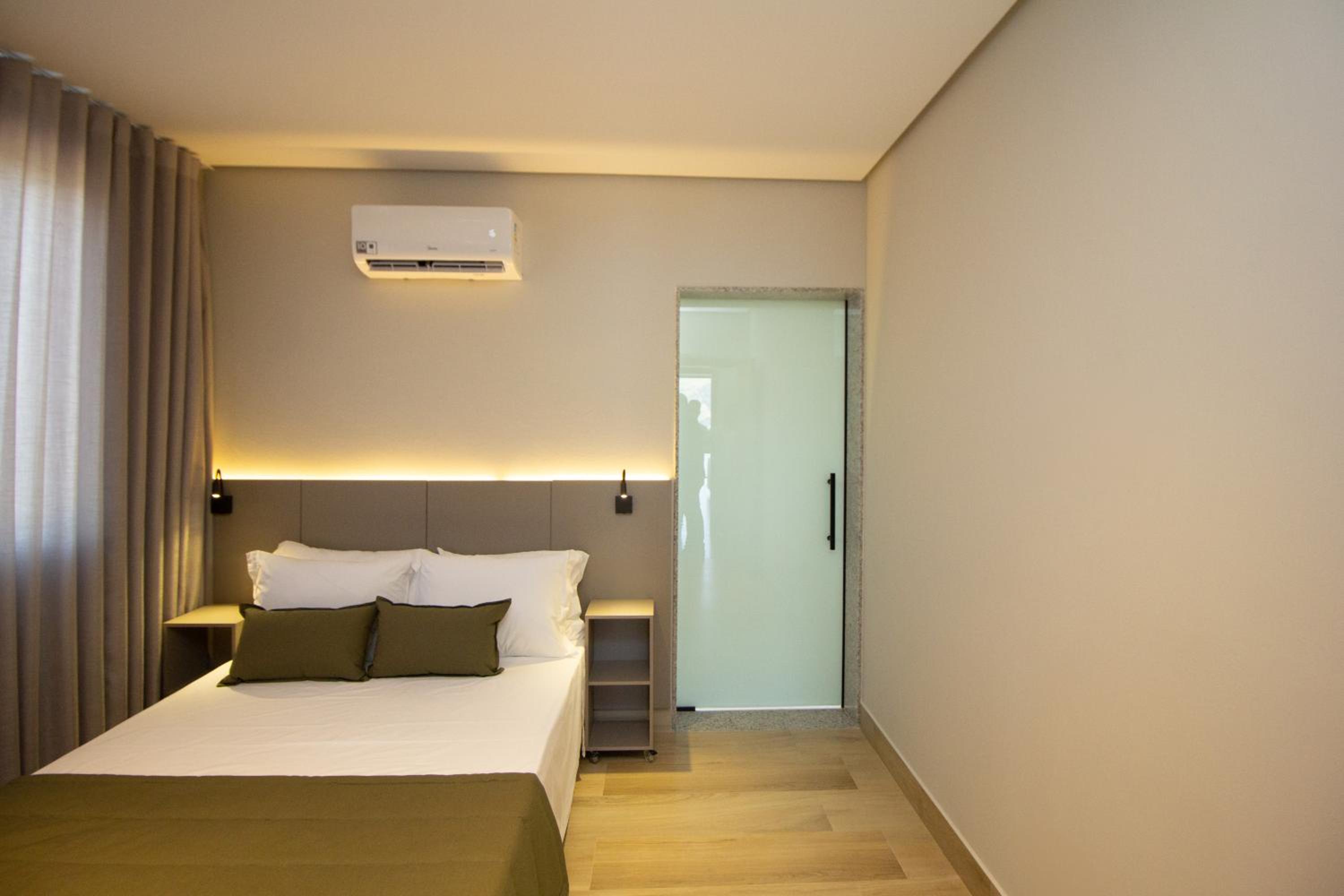 O quarto tem um tamanho ótimo, lugar para acomodar a bagagem, mesas de cabeceira, iluminação ótima, excelente roupa de cama e banho. Chuveiro potente e quente. Ar condicionado funcionando perfeitamente. Amei cada detalhe. A piscina tem vista para o lago. Tudo muito bem pensado.