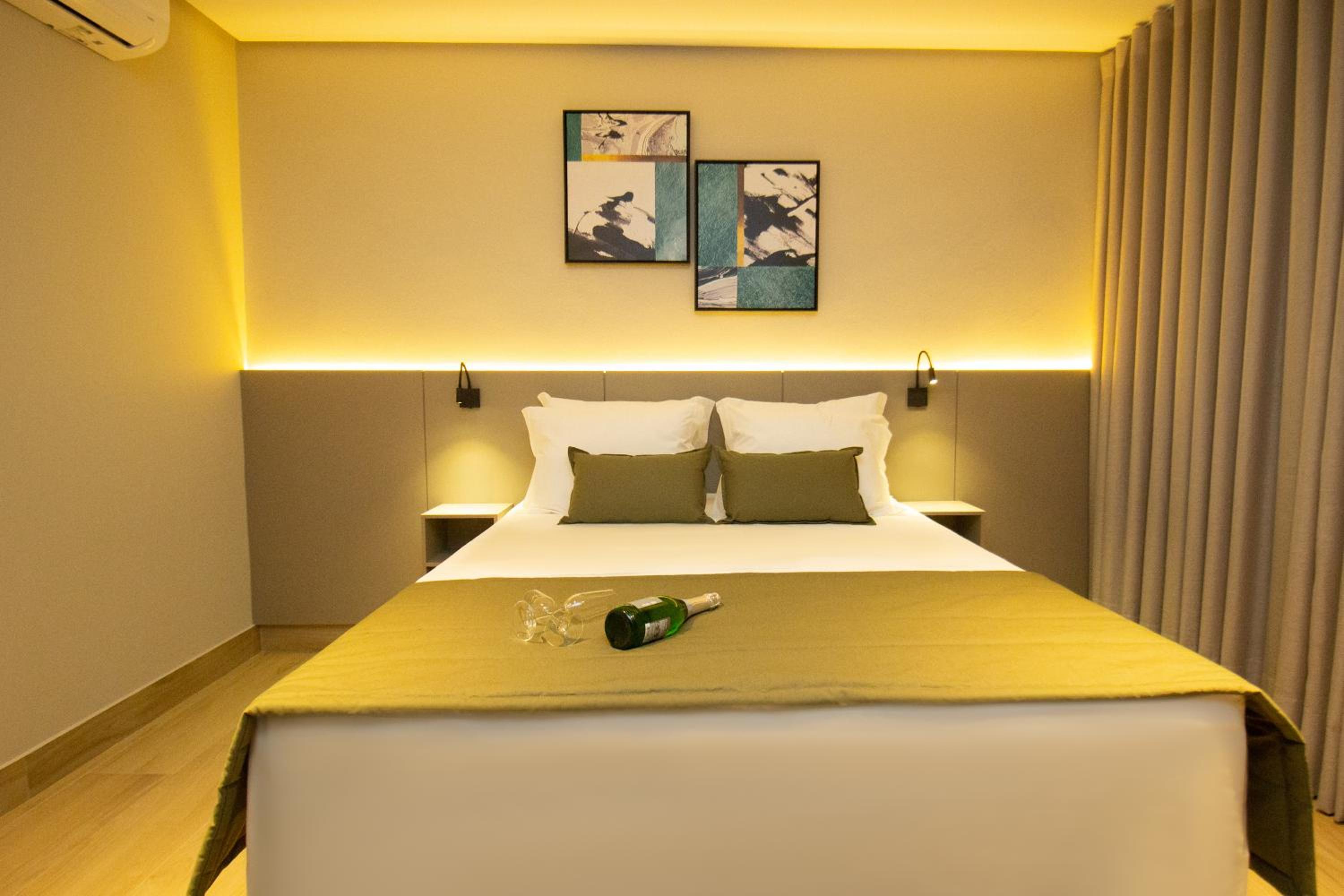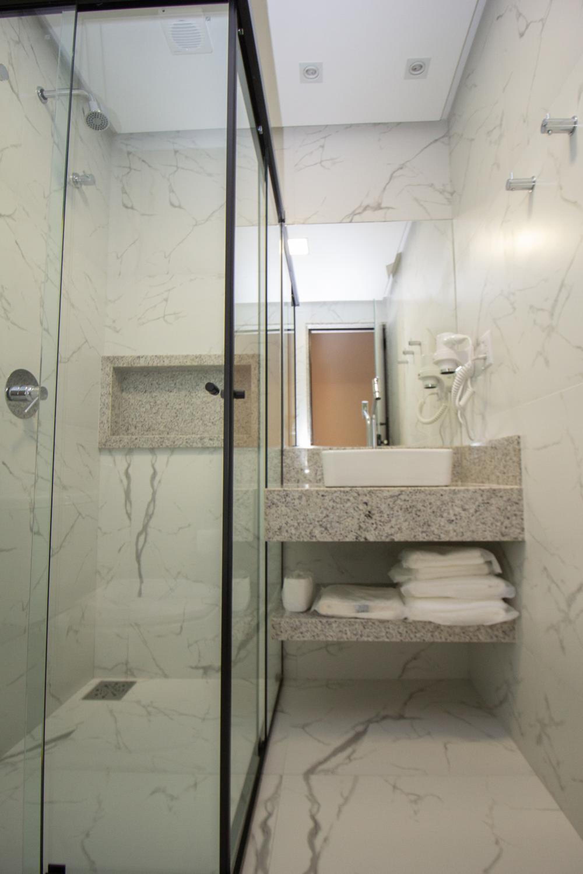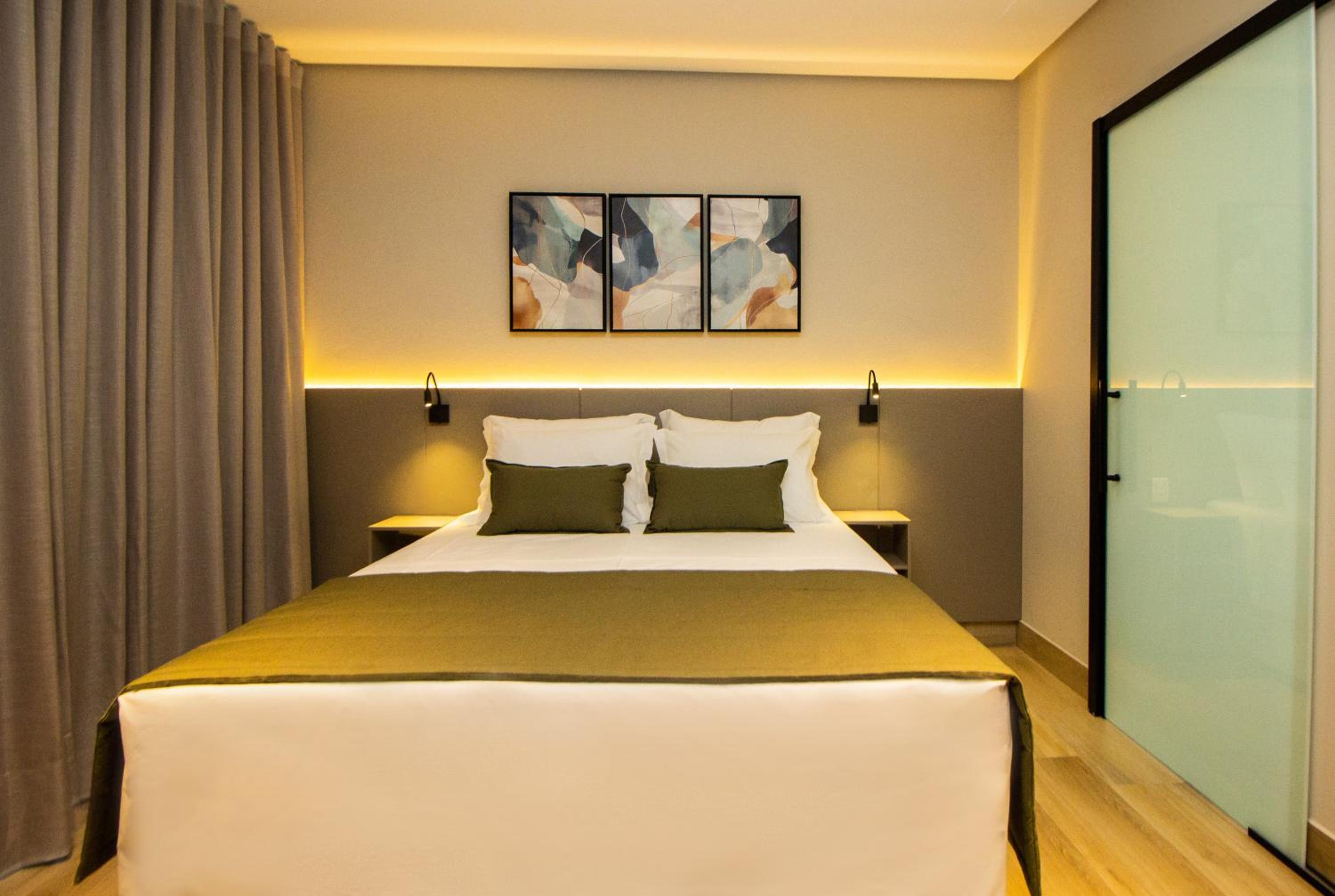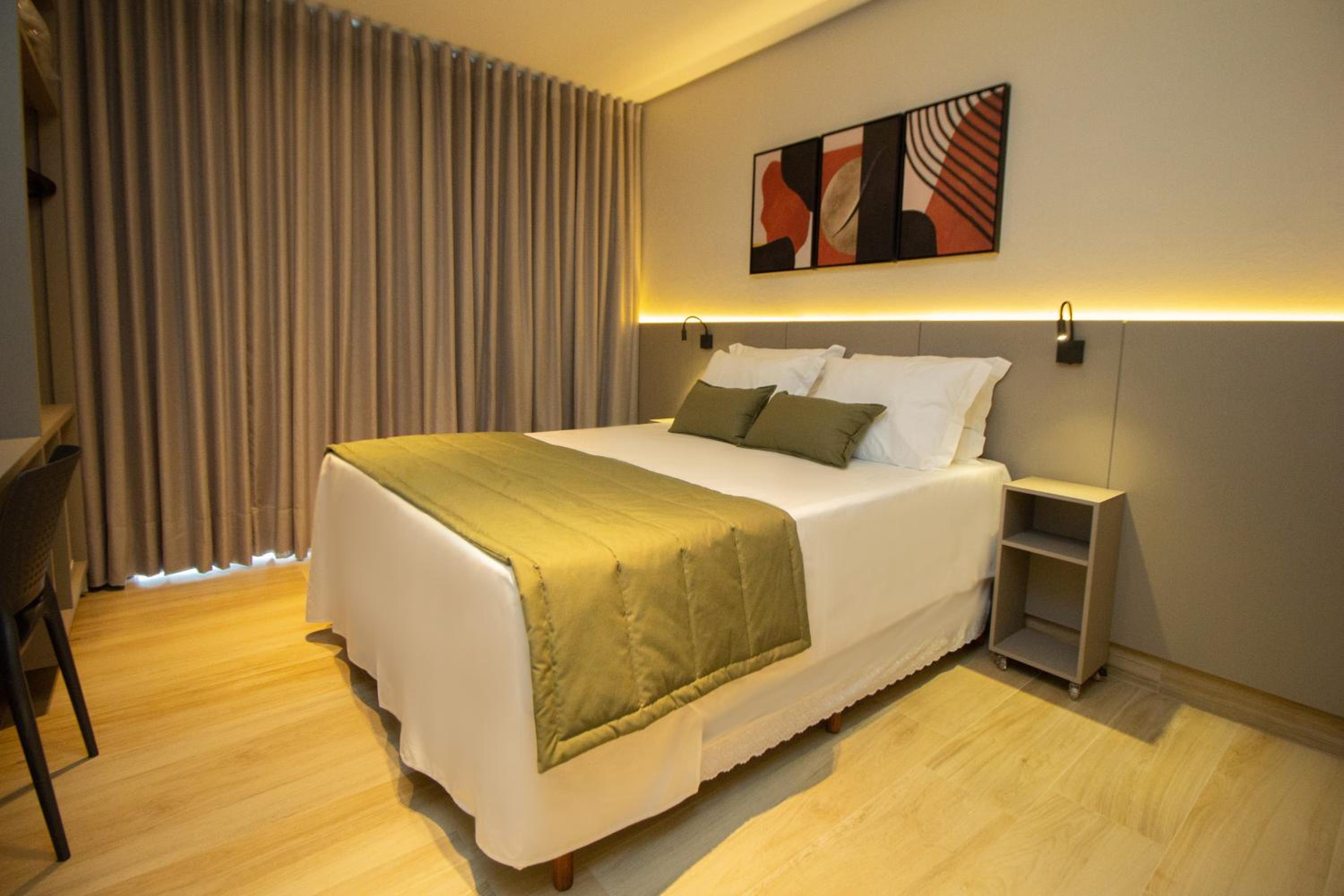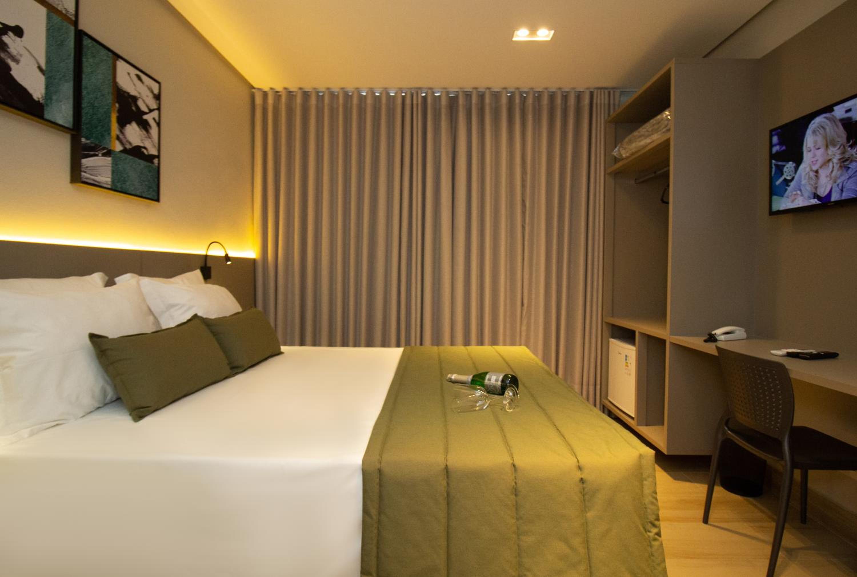 O quarto tem um tamanho ótimo, lugar para acomodar a bagagem, mesas de cabeceira, iluminação ótima, excelente roupa de cama e banho. Chuveiro potente e quente. Ar condicionado funcionando perfeitamente. Amei cada detalhe. A piscina tem vista para o lago. Tudo muito bem pensado.