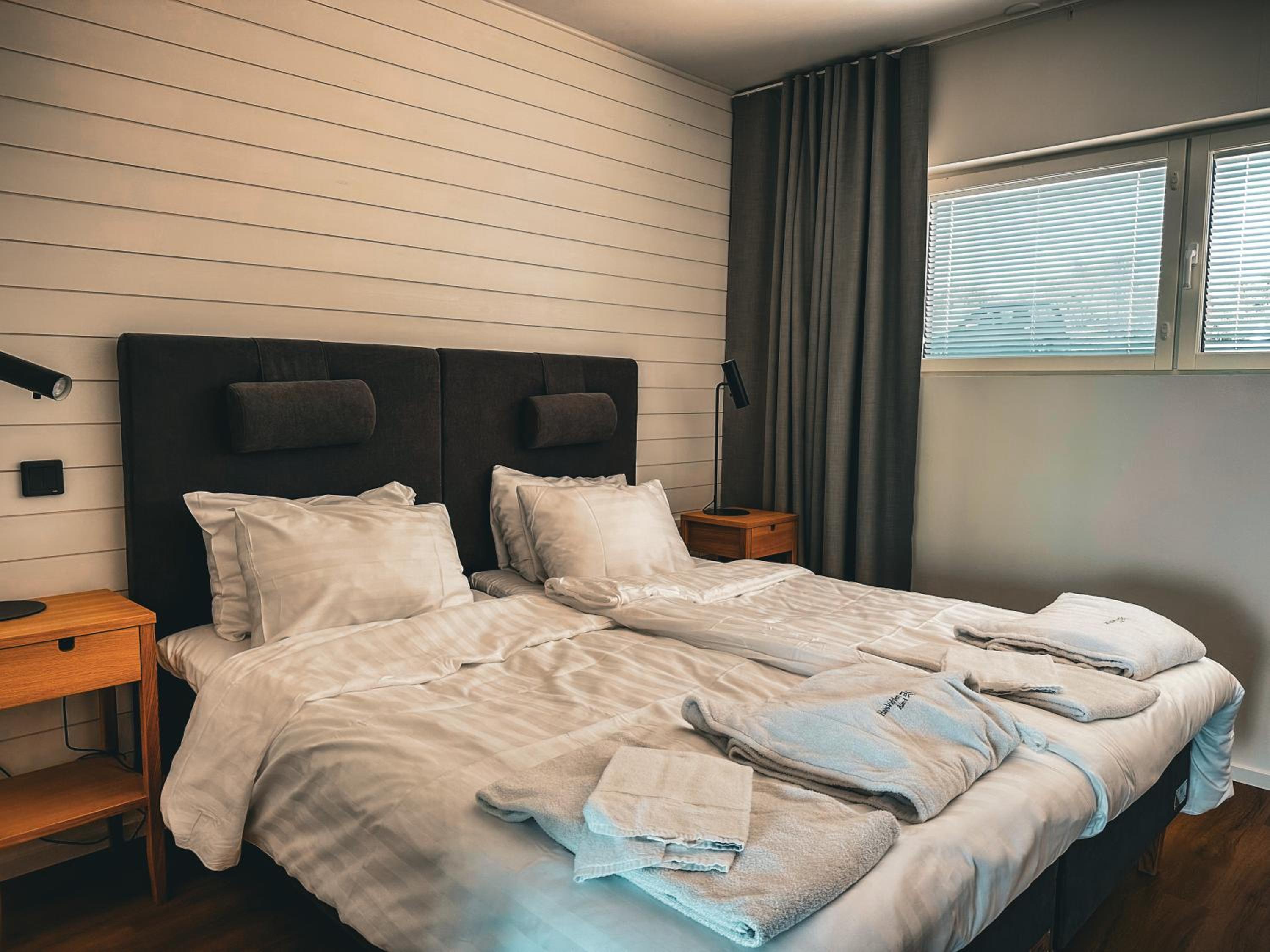 Ulkona satoi ja tuuli kovaa yön aikana ja heräilimme vähän väliä paukkeeseen. Aamulla huomasimme, että sviitin takan ovet paukkuivat ilmankierrosta johtuen. Huone oli myös todella kylmä illalla/yöllä.
