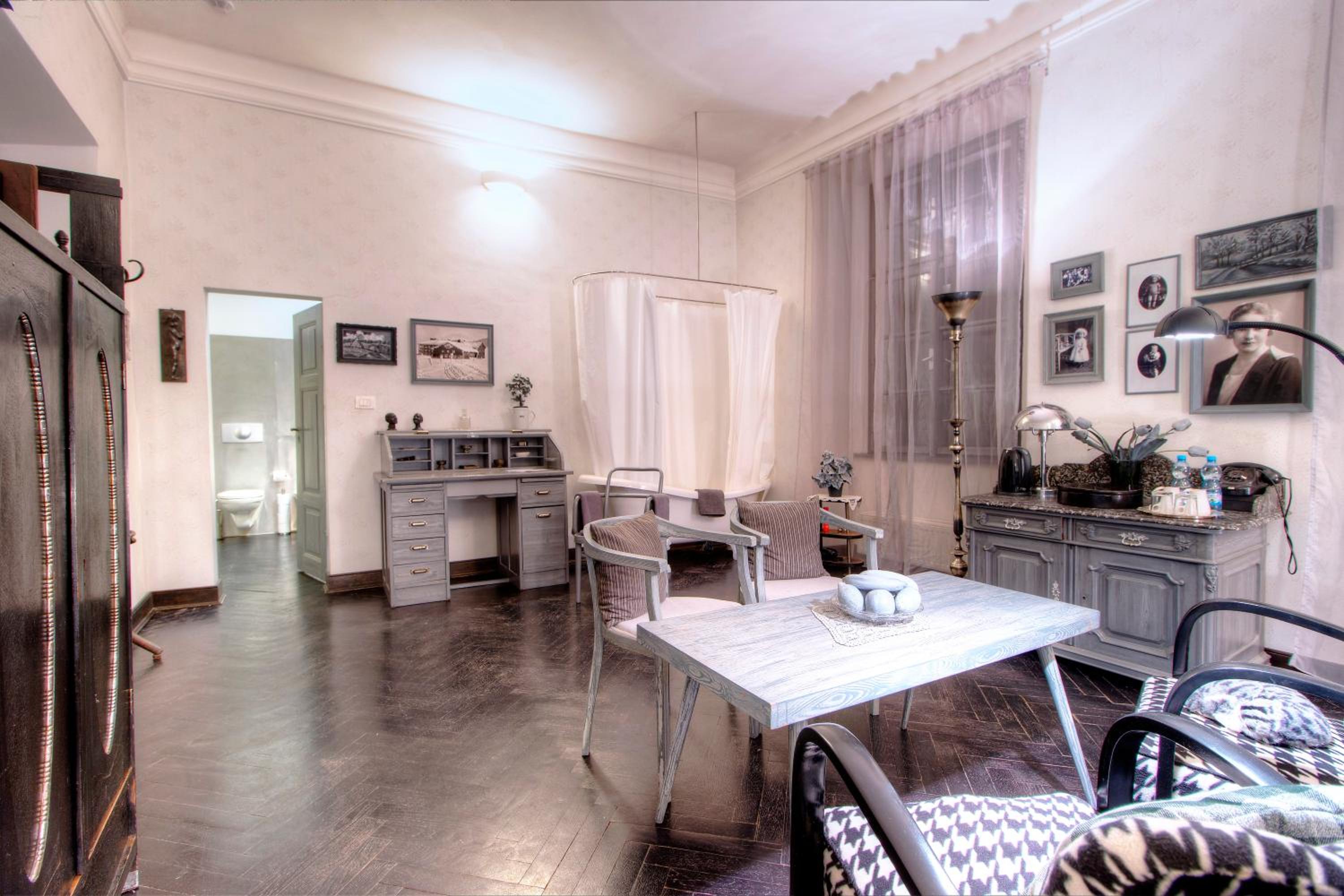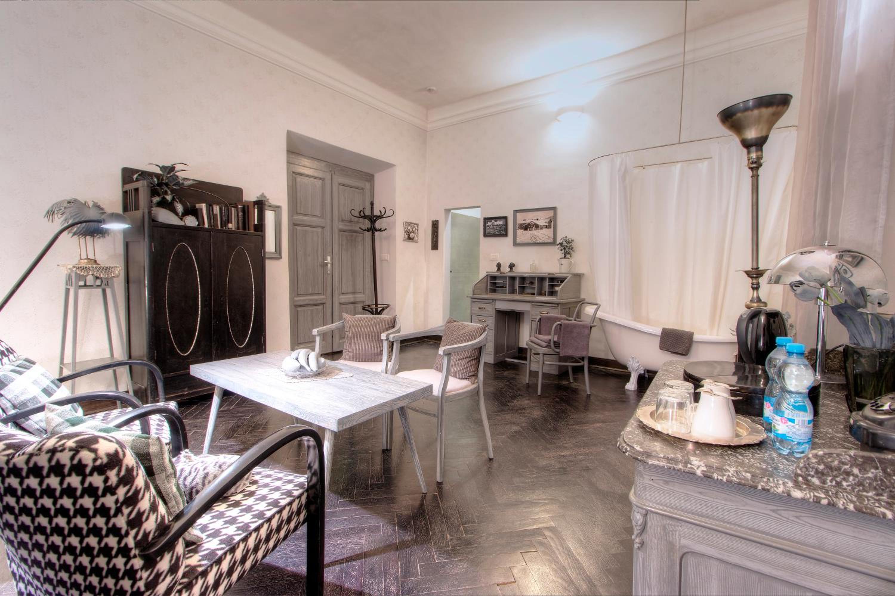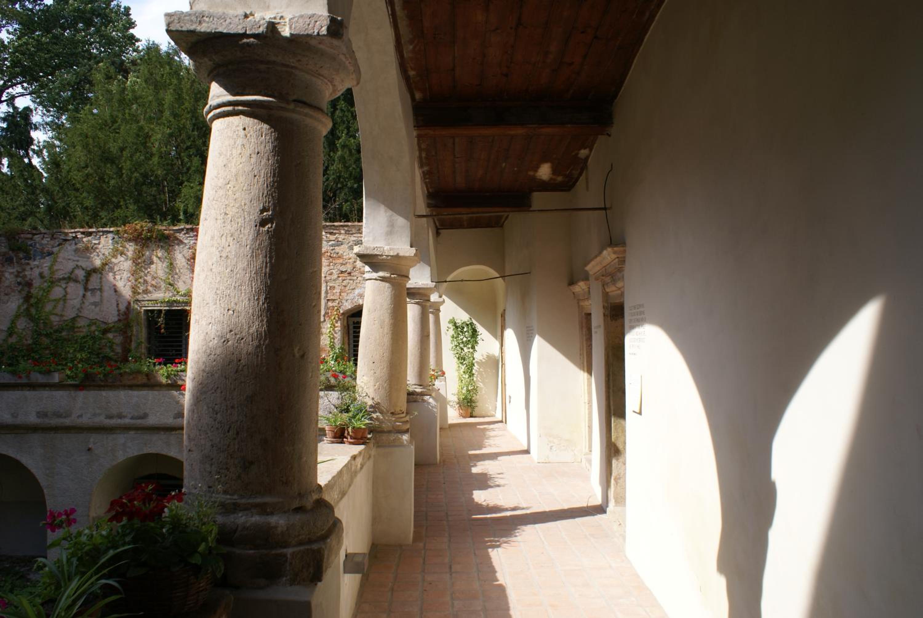 Večeři předcházel amuse bouche v podobě toho nejlevnějšího předkrájeného baleného chleba Šumava, který zdobila ne příliš ušlechtilá plíseň. Tomu říkám italské delikatesy a prémiovost. Jídlo bylo ucházející, i když al dente risotto si představuji jinak. Jako třešnička na dortu byl fakt, že pokoj nebyl obyvatelný a byl nám nabídnut jiný pokoj — Prezidentský. Tam nás čekal přímotop v koupelně, který někdo — vzhledem k délce šňůry — chytře postavil na umyvadlo. No nic, bezpečnost stranou… Dáme si vanu, zklidníme rozjitřenou mysl… To by ta vana však nesměla být z kovu, který rád přijímá teplo. Takže vzhledem k okolní teplotě byly ty dva centimetry vody, co se napustily, úplně studené a když jsem sáhla do proudu vody, tekla velice vlažná. Na mou zprávu, jak je to v zámku s vodou, Alberto odpověděl, že tam na to měli odborníka a ten sám nevěděl, čím to je. Tomu říkám přístup. Místo komody, kam si můžete uložit věci, byla komoda plná kabelů, CDček, myší a jiných artefaktů, které tam nejspíš majitelé schraňují pro další Kinterovu uměleckou instalaci. Během dvou dní jsme měli šanci okusit 3 z nabízených pokojů, jelikož druhý den jsme se slavně přesunuli do Zlatého pokoje, který má vlastní karmu — teplé vodě zdar!