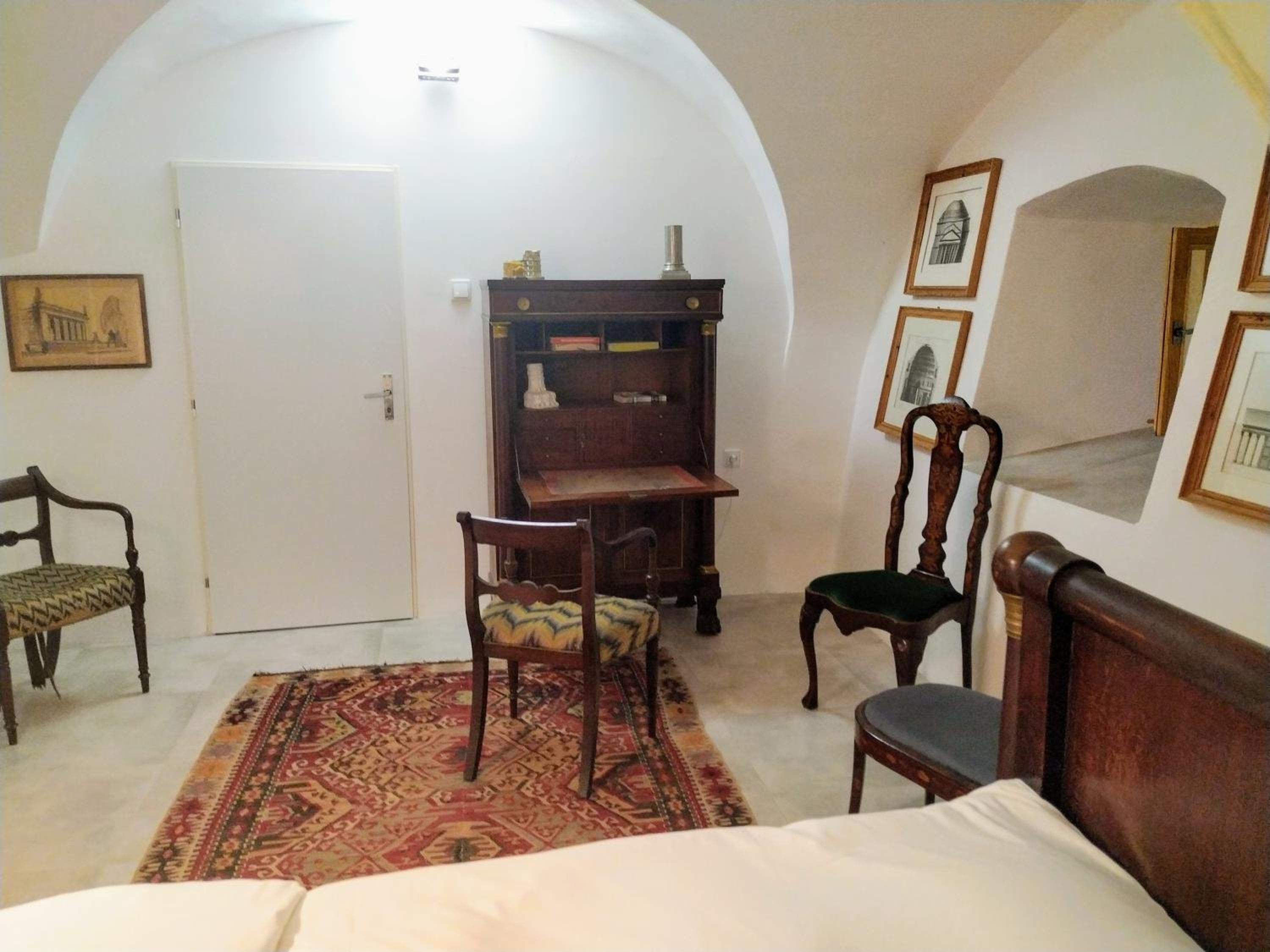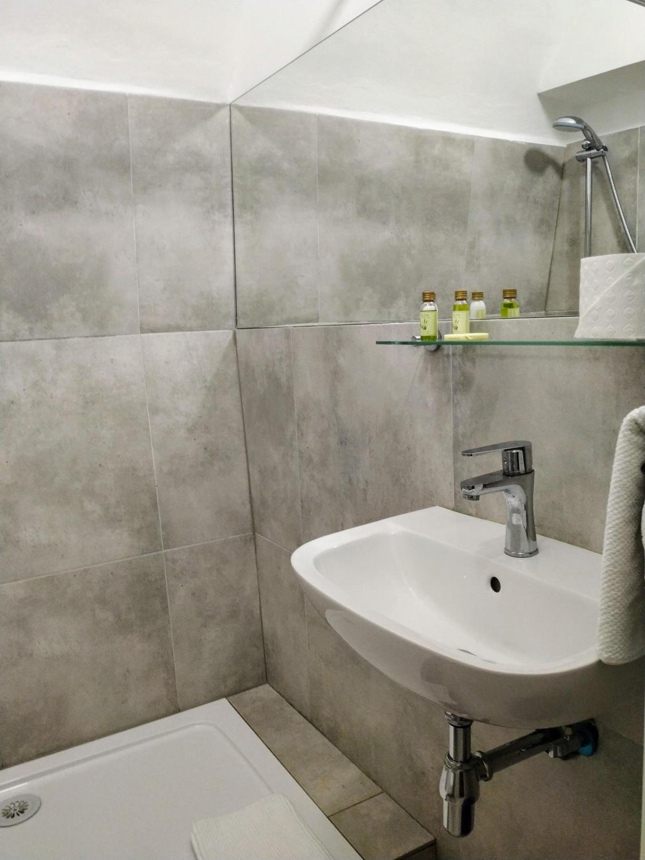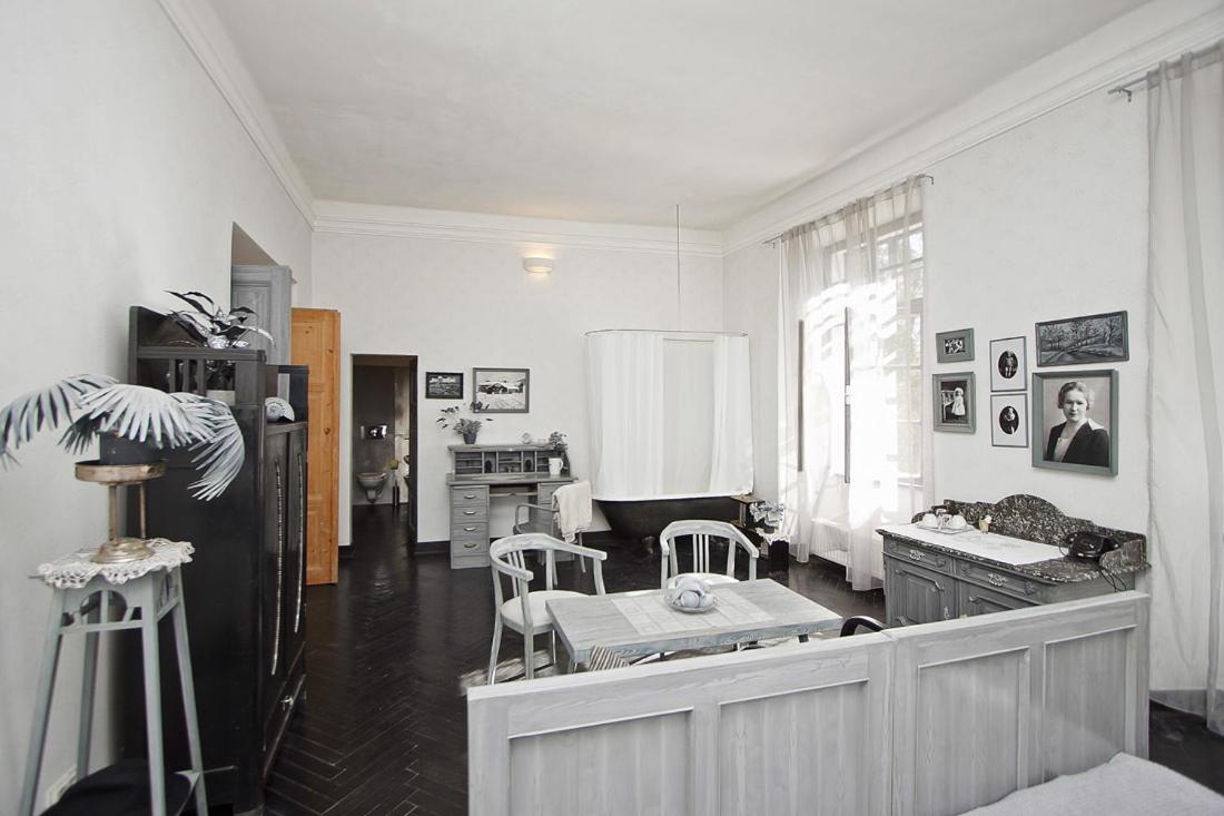 Večeři předcházel amuse bouche v podobě toho nejlevnějšího předkrájeného baleného chleba Šumava, který zdobila ne příliš ušlechtilá plíseň. Tomu říkám italské delikatesy a prémiovost. Jídlo bylo ucházející, i když al dente risotto si představuji jinak. Jako třešnička na dortu byl fakt, že pokoj nebyl obyvatelný a byl nám nabídnut jiný pokoj — Prezidentský. Tam nás čekal přímotop v koupelně, který někdo — vzhledem k délce šňůry — chytře postavil na umyvadlo. No nic, bezpečnost stranou… Dáme si vanu, zklidníme rozjitřenou mysl… To by ta vana však nesměla být z kovu, který rád přijímá teplo. Takže vzhledem k okolní teplotě byly ty dva centimetry vody, co se napustily, úplně studené a když jsem sáhla do proudu vody, tekla velice vlažná. Na mou zprávu, jak je to v zámku s vodou, Alberto odpověděl, že tam na to měli odborníka a ten sám nevěděl, čím to je. Tomu říkám přístup. Místo komody, kam si můžete uložit věci, byla komoda plná kabelů, CDček, myší a jiných artefaktů, které tam nejspíš majitelé schraňují pro další Kinterovu uměleckou instalaci. Během dvou dní jsme měli šanci okusit 3 z nabízených pokojů, jelikož druhý den jsme se slavně přesunuli do Zlatého pokoje, který má vlastní karmu — teplé vodě zdar!