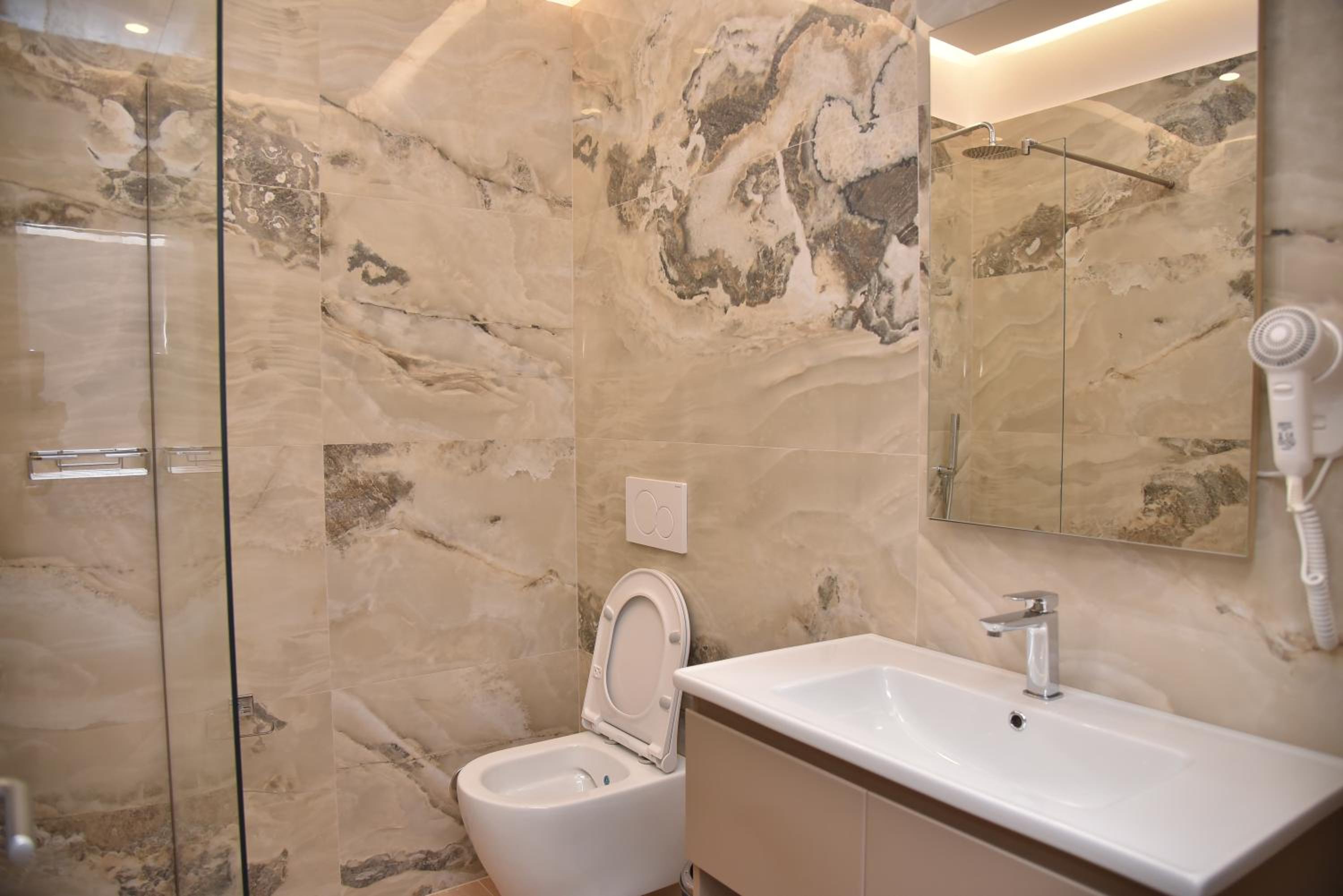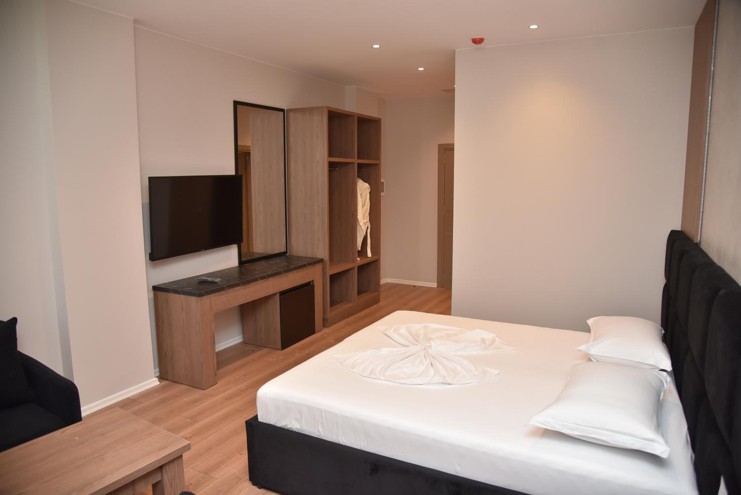 Nie polecam! Najlepiej ten hotel wygląda z zewnątrz i na zdjęciach, wewnątrz nie jest już tak kolorowo, poza recepcją. Wzieliśmy 3 pokoje 2 osobowe. W dwóch pokojach na 4 piętrze klimatyzacja ok, ale brak internetu w pokojach, zasięg tylko na korytarzu. Natomiast w pokoju na 2 piętrze internet ok, ale za to centralna klimatyzacja potrzebowała 2-3 h żeby w nagrzanym pokoju temperatura spadła do około 25 stopni C. Dodatkowo poza odpadającym tynkiem i grzybem w pokojach na 4 piętrze, to mrówki były wszędzie, ale najwięcej w pokoju na 2 piętrze (wchodziły nawet na łóżko plus taki, że przynajmniej nie gryzły). Poza tym, jeśli ktoś myśli o chodzeniu na plażę to mimo, że w linii prostej jest około 500 m to trzeba iść na około i robi się grubo ponad kilometr drogą w części bez chodnika, a gdy zapragnie ktoś (a warto) dostać się do części turystycznej Durres z promenadą to jest około 3 km, a droga raczej nie zachęca do spacerów, szczególnie po zmroku. Śniadania bardzo słabe, mały wybór i monotonne przez 4 dni zmieniały się tylko grzanki.