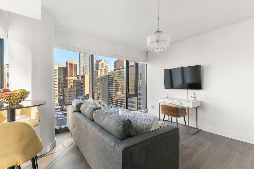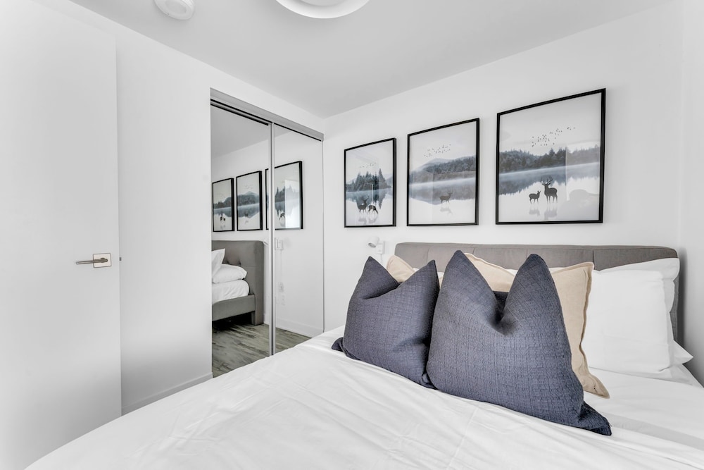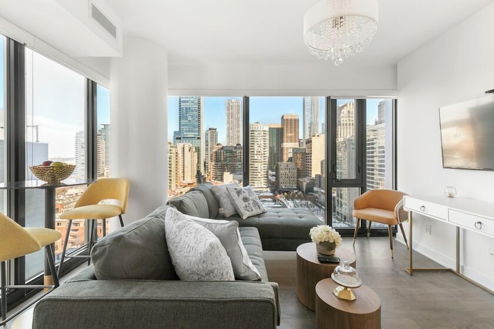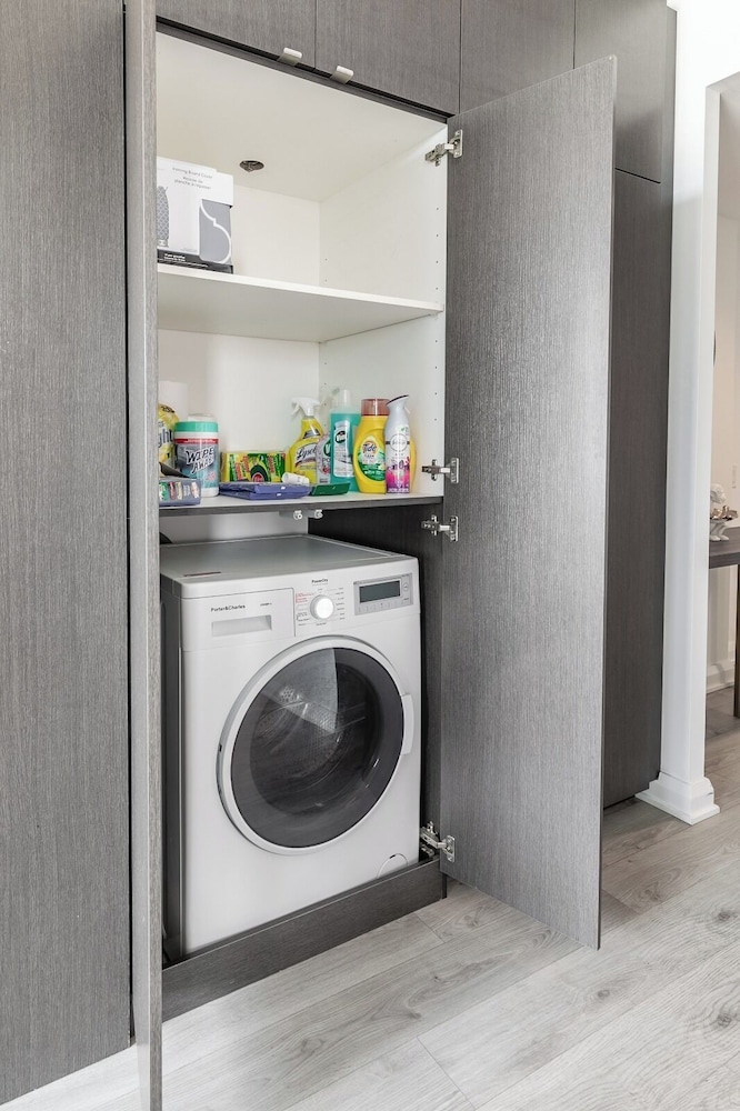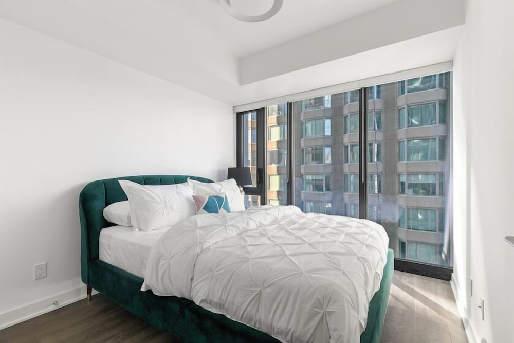 Clean, functional space, comfortable with a fabulous city view quiet.The unit includes a washer, dryer, good size flat screen TV (the amount of quality channels is incredible), stove, microwave, oven, fridge/ freezer, dishwasher, toaster, coffee maker with filters (bring grounds) and plenty of pots, pans, glassware, full set of knives, measuring cups, nice cooking utensils, etc. WIFI is excellent. There is no counter space for getting food ready, but a standard above stove microwave would remedy this or a rolling table for the microwave. There is no strainer and pasta spoon, making cooking pasta challenging. Safety is 100% with fobs needed for the elevator and entrance and a solid deadbolt on the door. All the staff were friendly and professional. A nice man took us up to our unit showing us the fob / security system. ENTER by the parking at 188 Cumberland (The first door on Cumberland when coming from Avenue is ok once you have your key and fob. You could buzz the lobby desk from here to initially get in maybe) It would be beneficial to give better information then just stating, “enter through the lobby” Close to subway St. George stop. There is a good grocery store (Whole Foods Market) and plenty of good places to eat around. Bring a few spices and spray / oil if you are cooking here as just salt / pepper. The OUTDATED bed headboard could be replaced with a thin headboard thus moving the bed forward allowing SAFE space for a 2nd person to get to the other side safely.