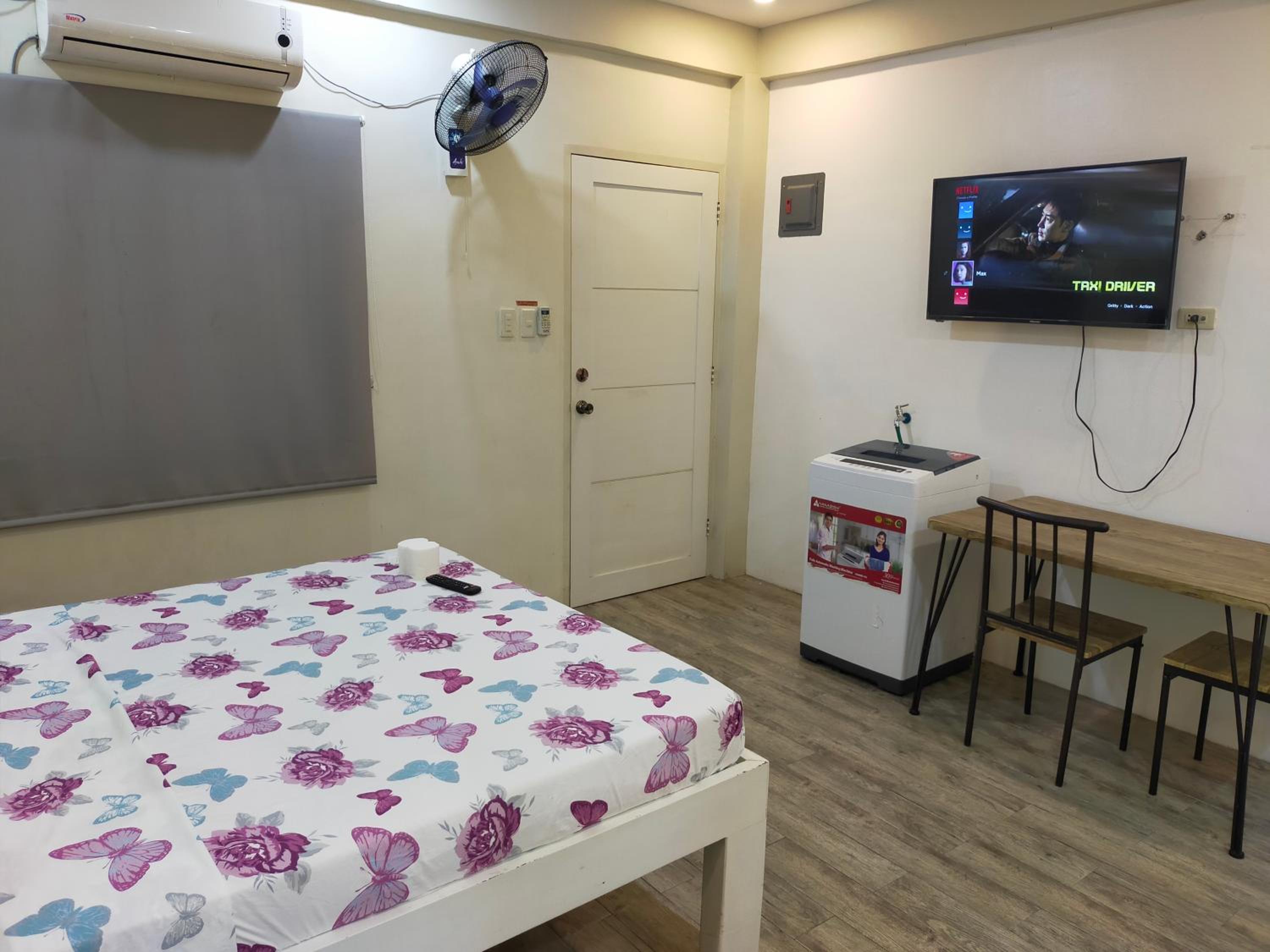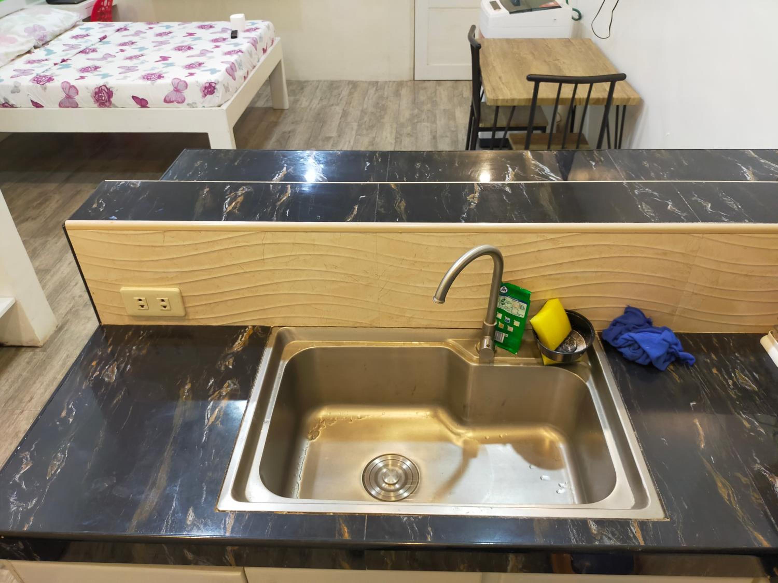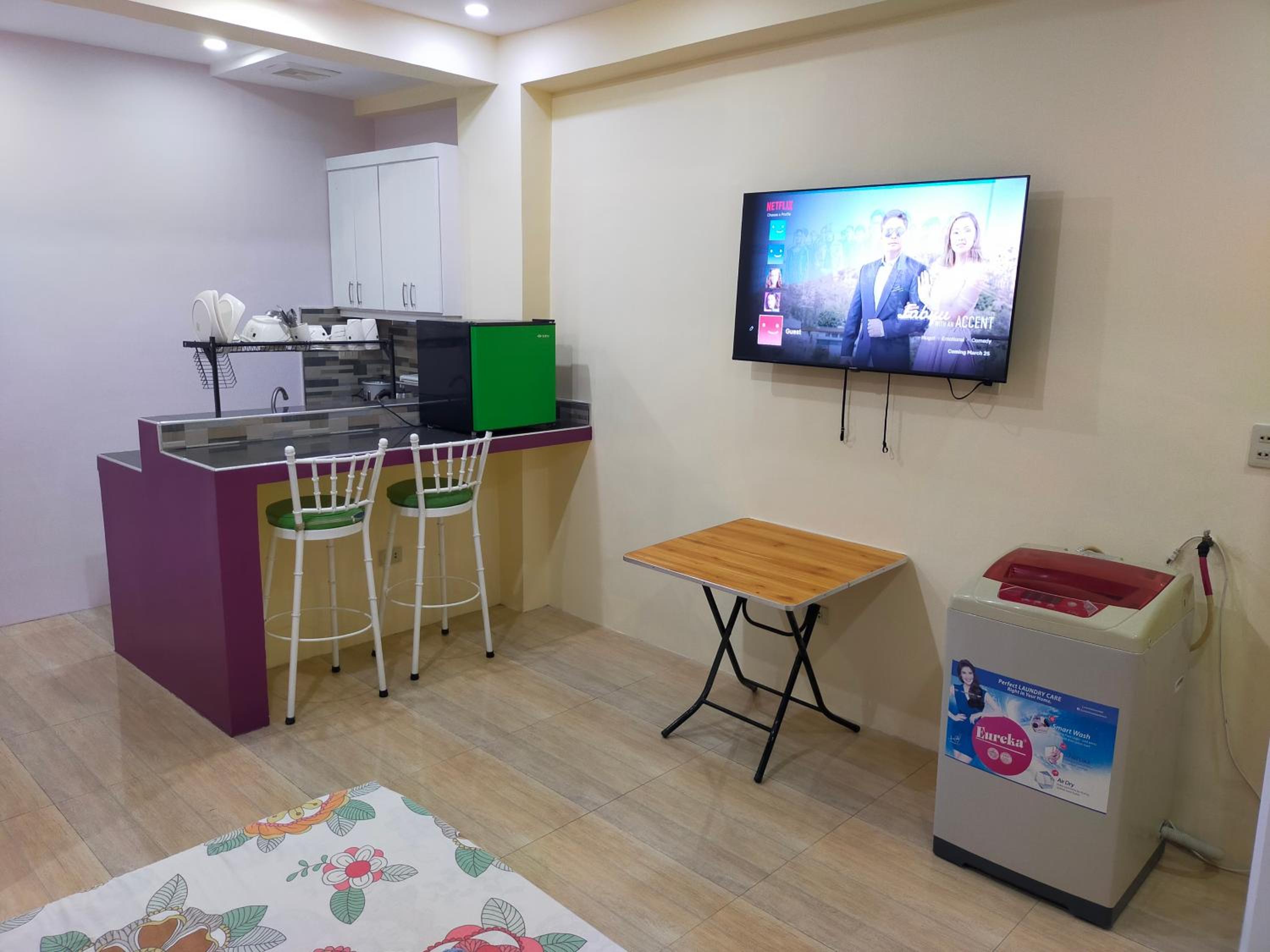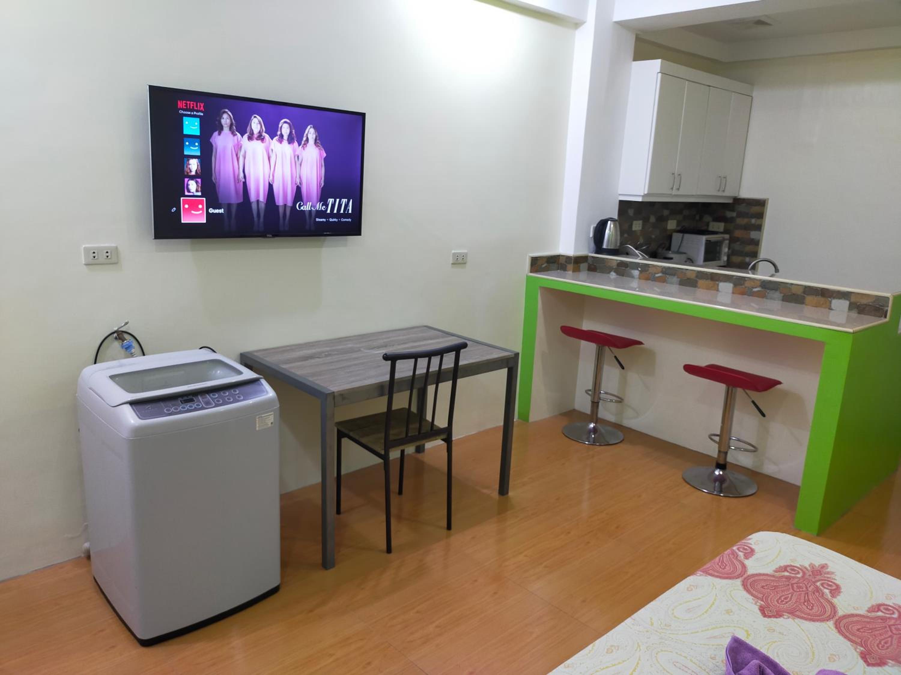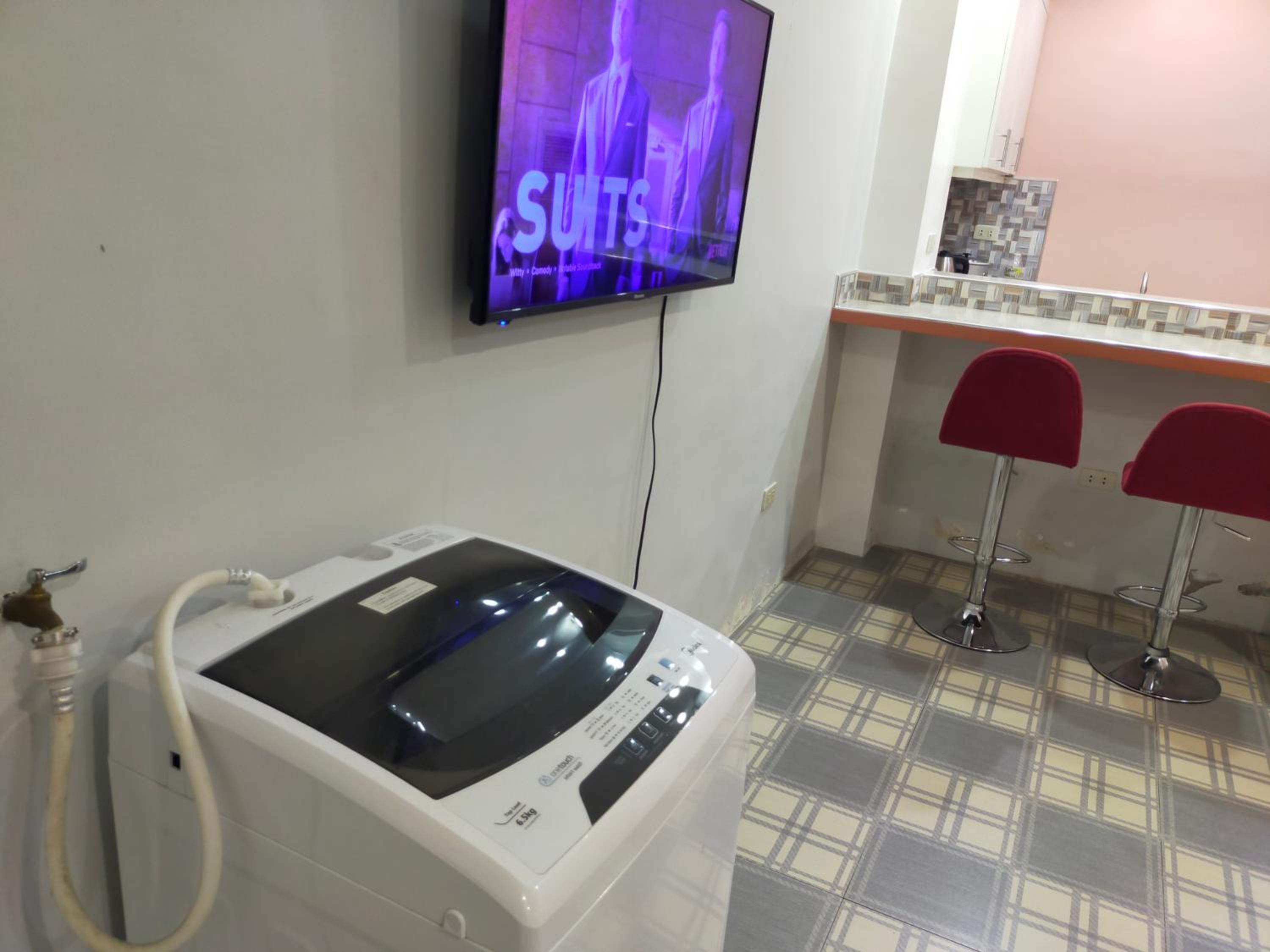 The washer inside my unit was leaking water heavily from a defective tap on the wall, making it unusable since the washer is about a meter from the bed, my baggage on the floor would be all ruined if I left the water run unattended. The room is spacious but they should equip it with a regular reading desk for a laptop. There are only two small bedside stands. Wifi is slow at 72Mbps. Shower water is also running slowly at low pressure probably due to the cheap compact type water heater. The room is not well maintained or prepared for new guests, like there're no trash bags in place for the trash bins in the kitchen or next to the toilet. Bedstands or cabinets appear to be stained, old. One cabinet door is missing a handle. The room needs deep cleaning and some repair.