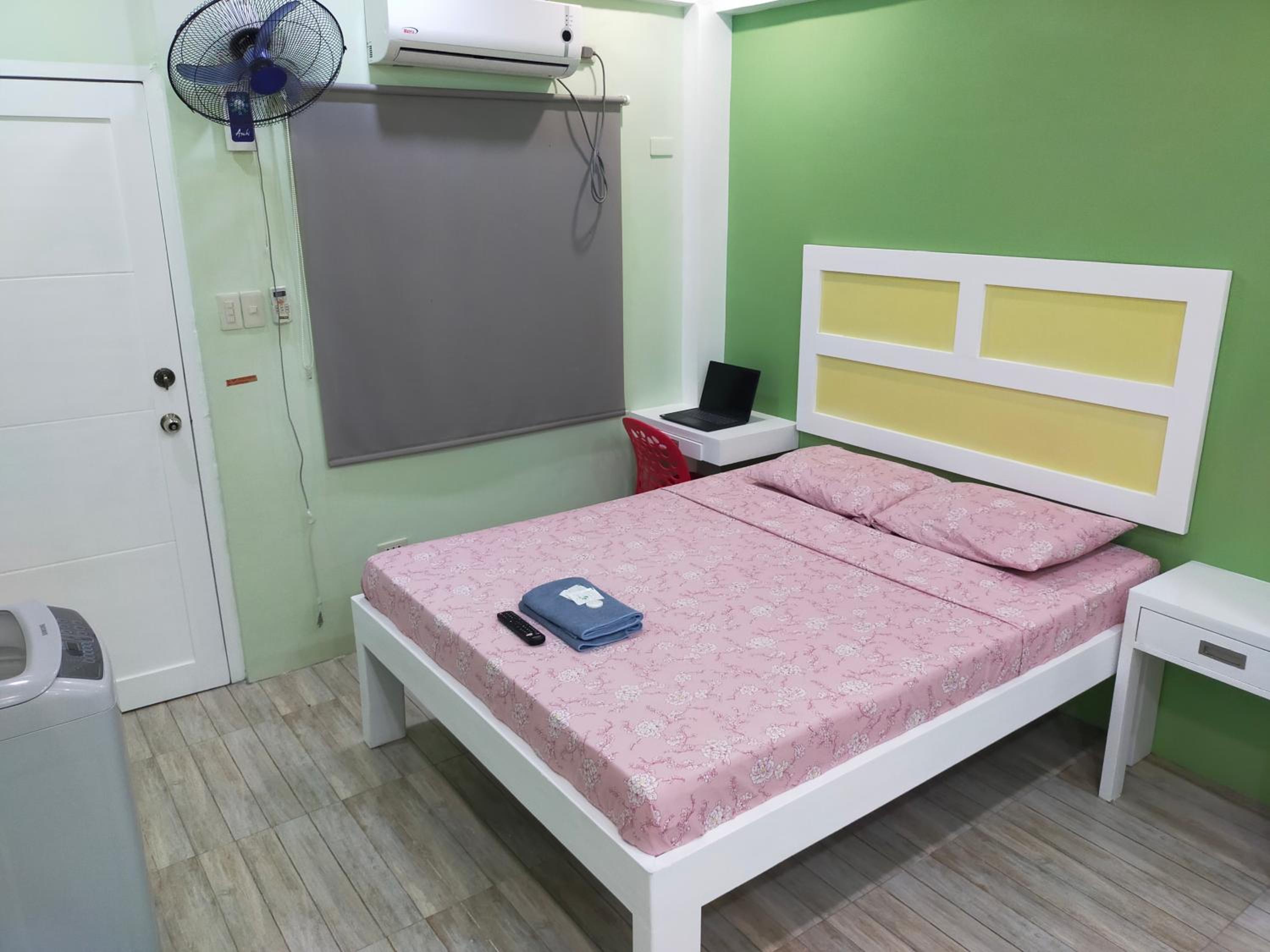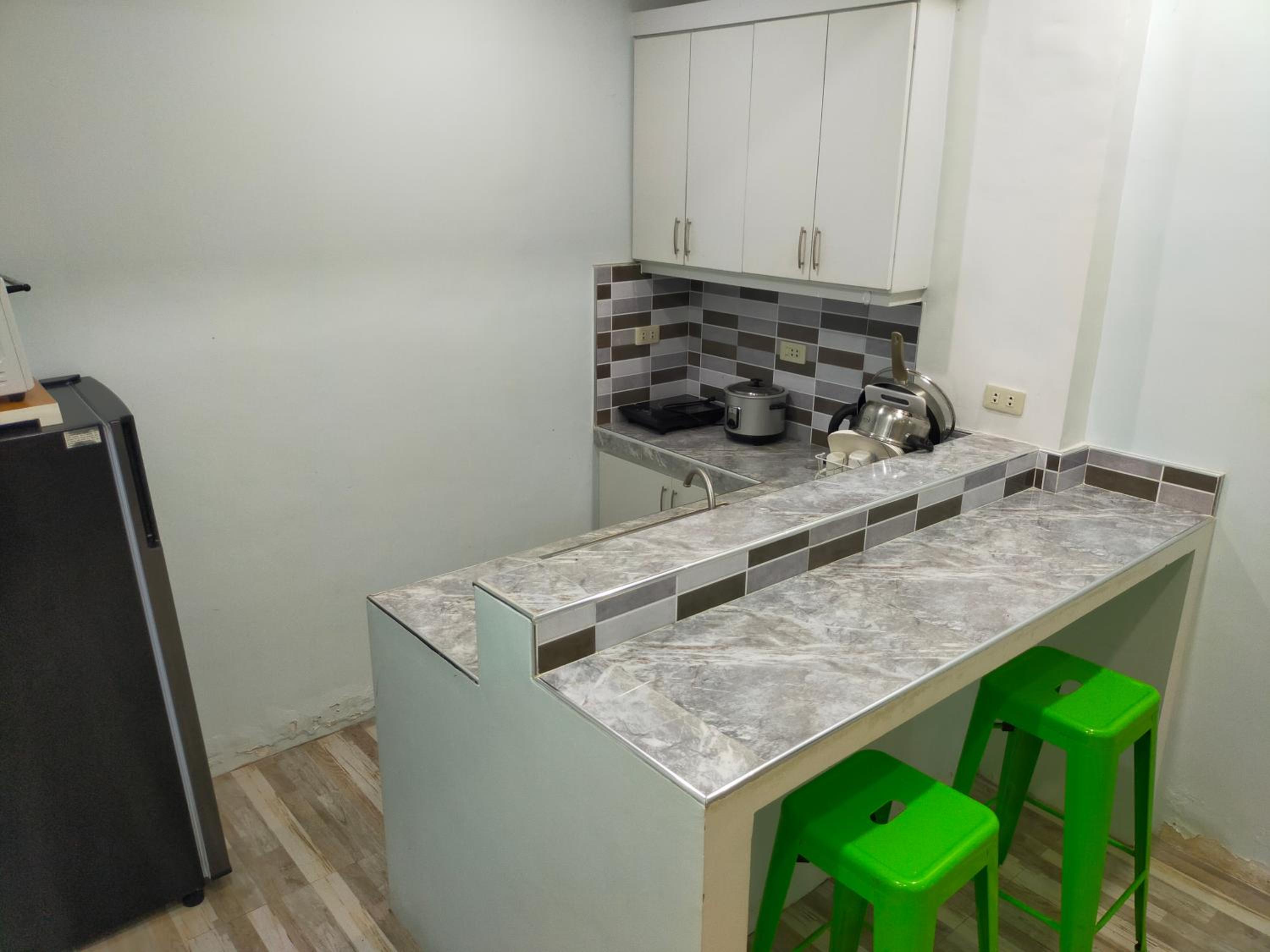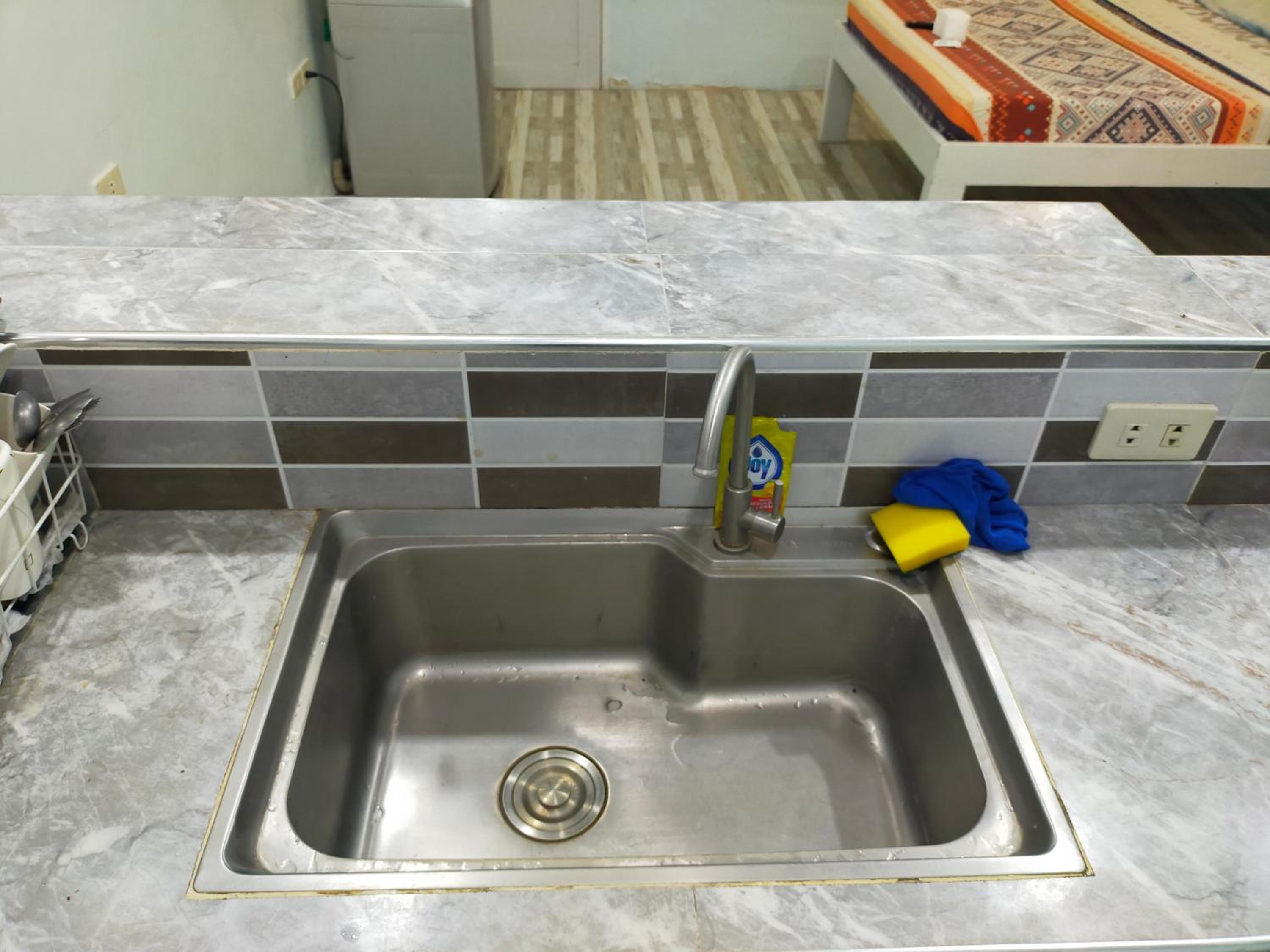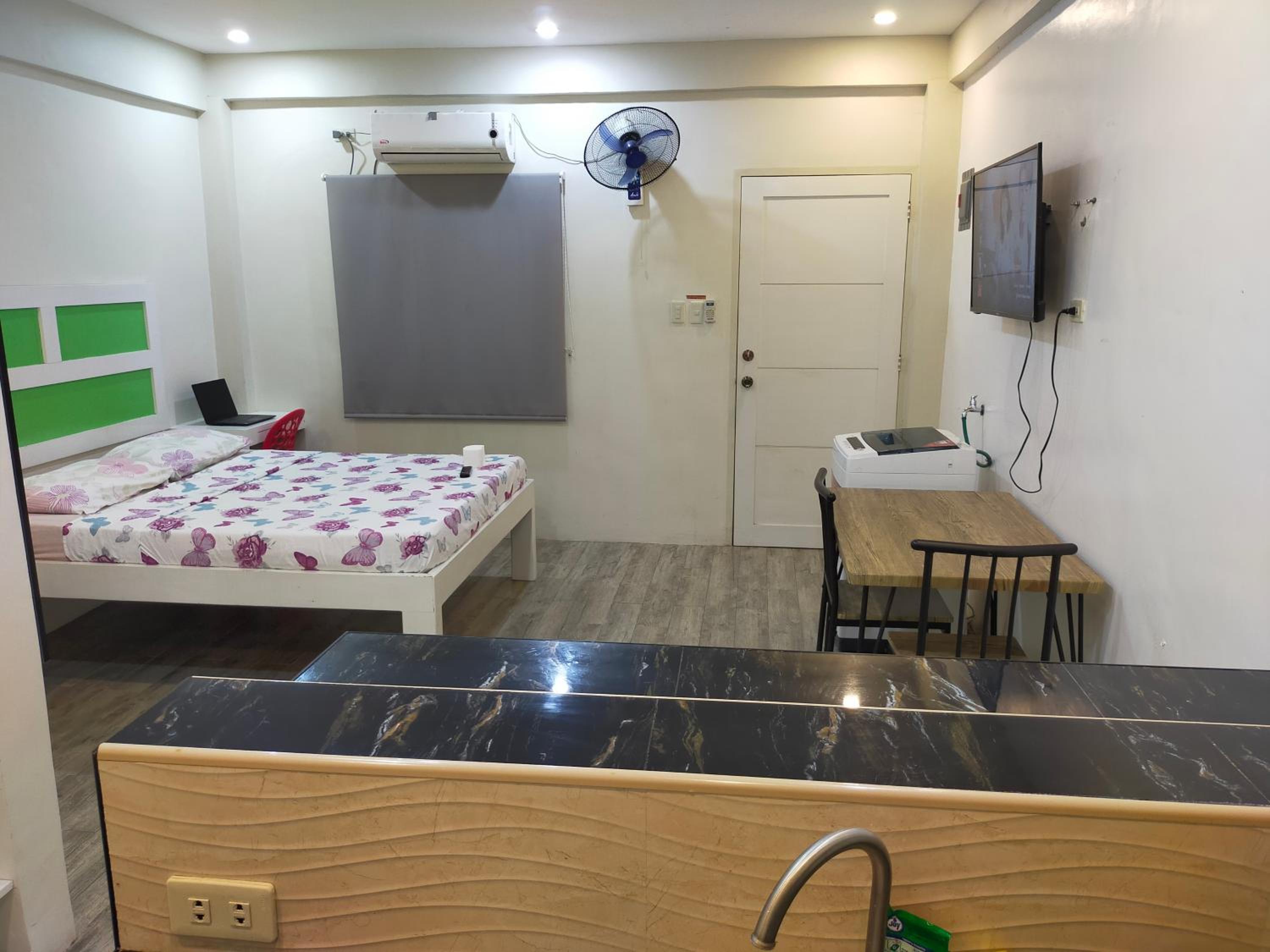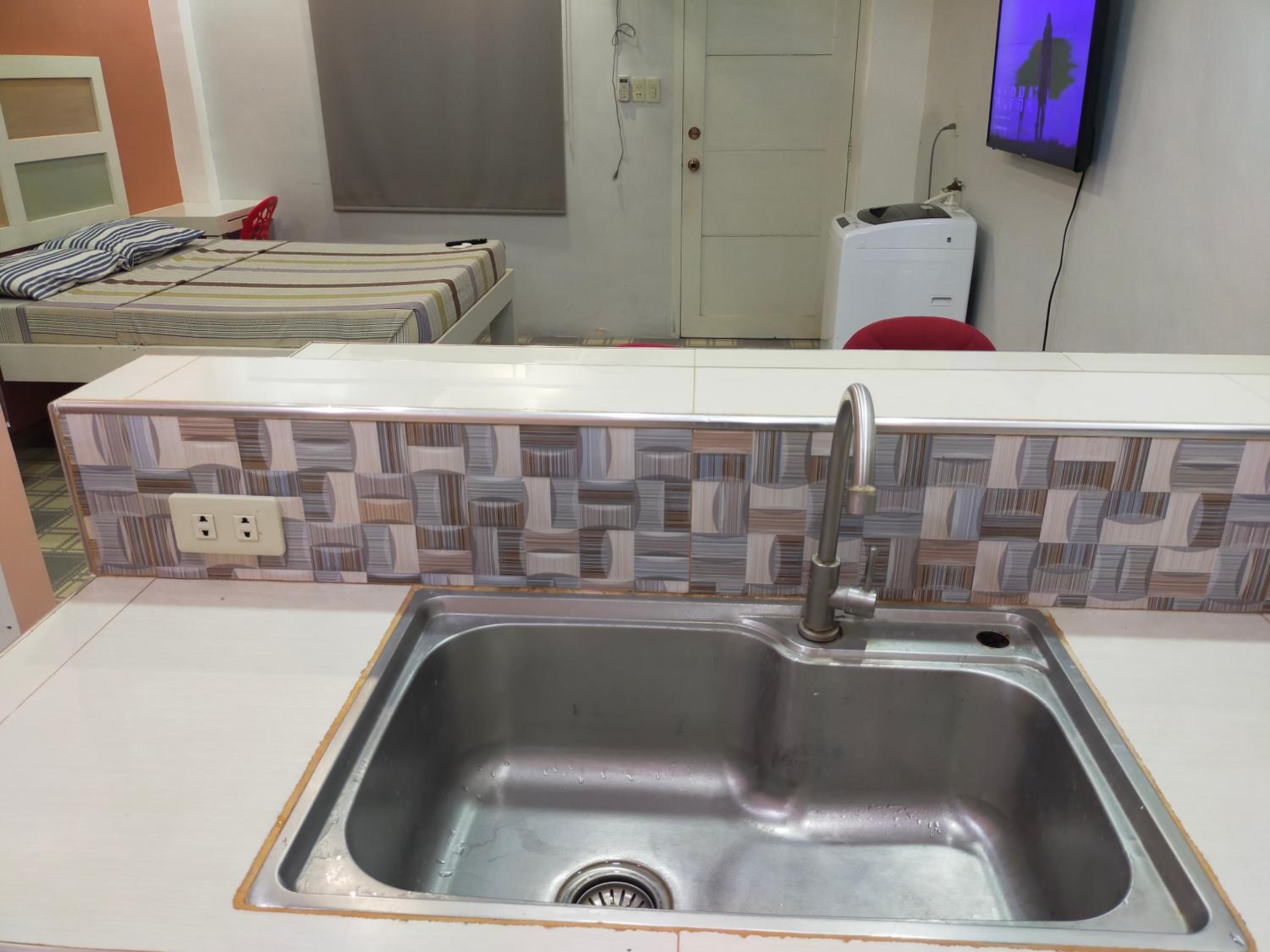 The washer inside my unit was leaking water heavily from a defective tap on the wall, making it unusable since the washer is about a meter from the bed, my baggage on the floor would be all ruined if I left the water run unattended. The room is spacious but they should equip it with a regular reading desk for a laptop. There are only two small bedside stands. Wifi is slow at 72Mbps. Shower water is also running slowly at low pressure probably due to the cheap compact type water heater. The room is not well maintained or prepared for new guests, like there're no trash bags in place for the trash bins in the kitchen or next to the toilet. Bedstands or cabinets appear to be stained, old. One cabinet door is missing a handle. The room needs deep cleaning and some repair.