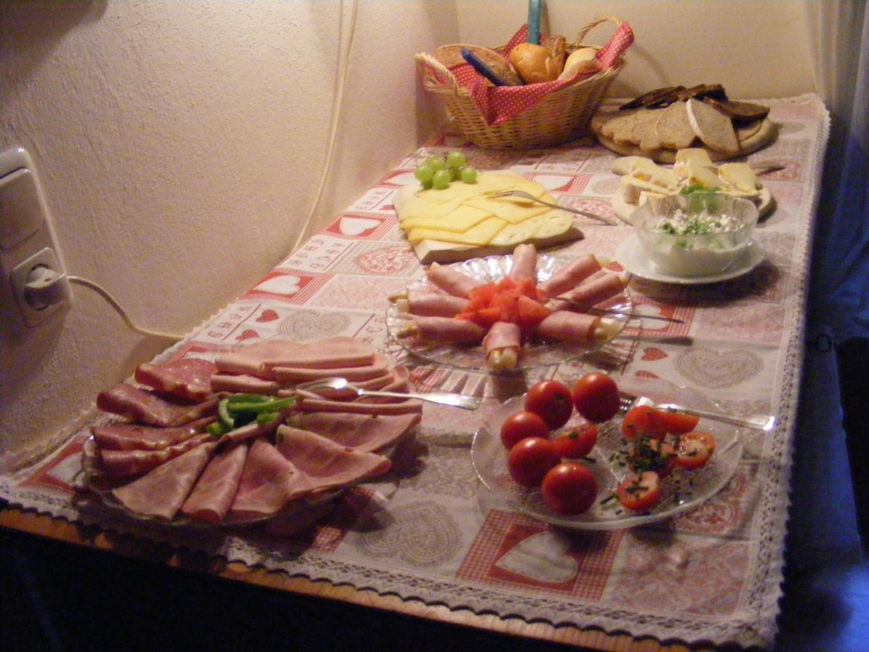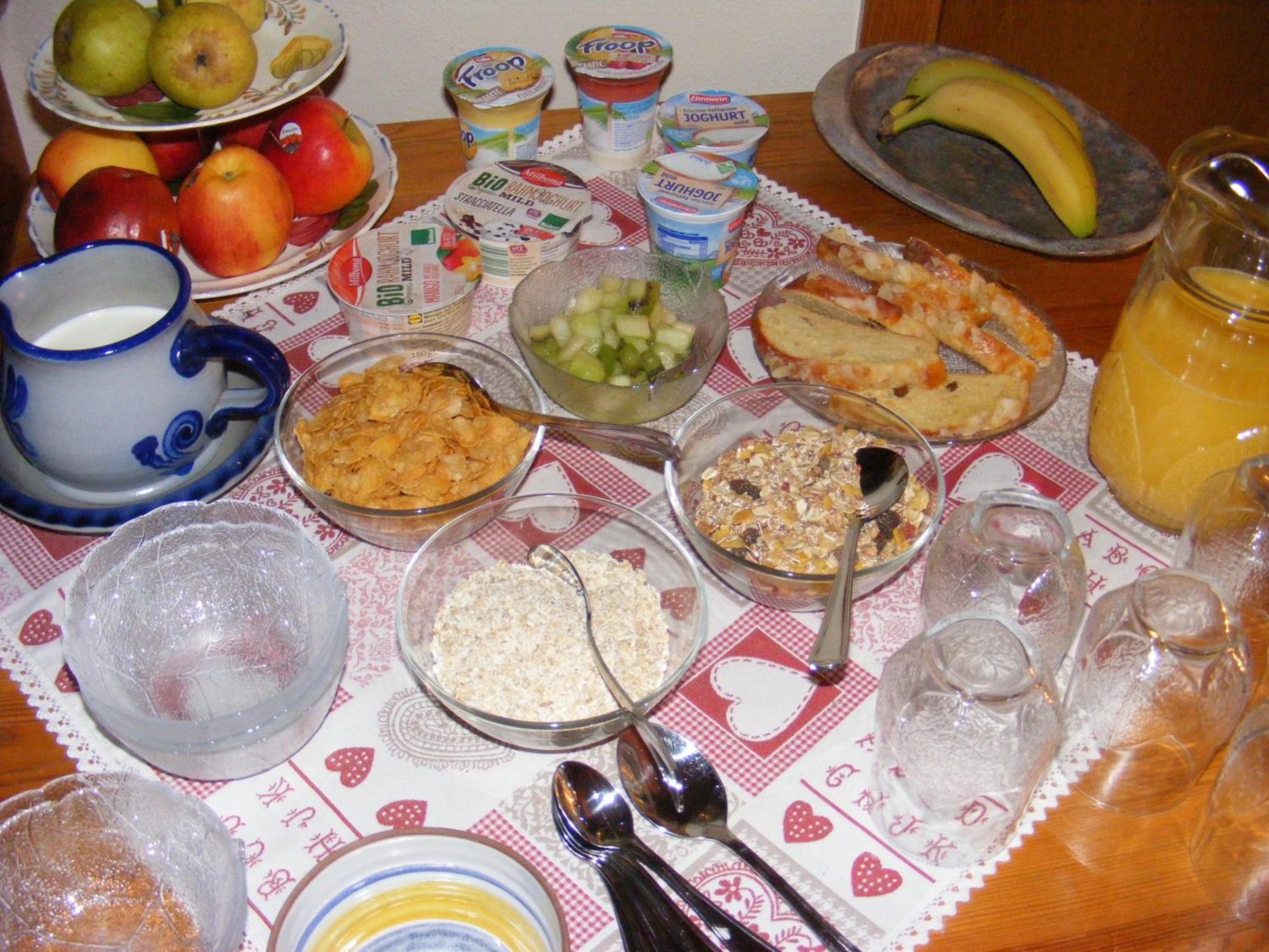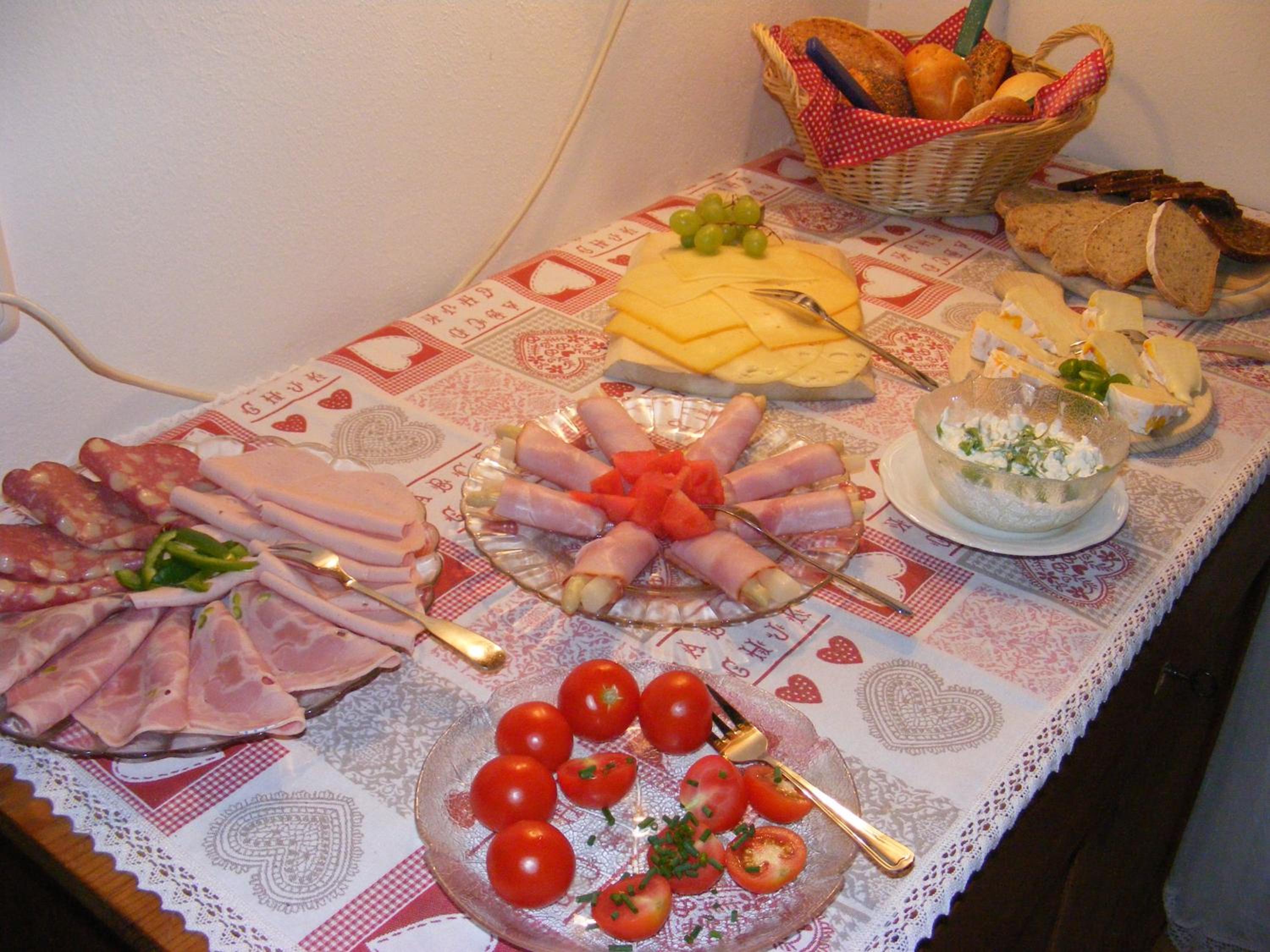 Start your day right with a buffet breakfast featuring a variety of dishes, fruits, and cheese at Gästehaus Möschel.