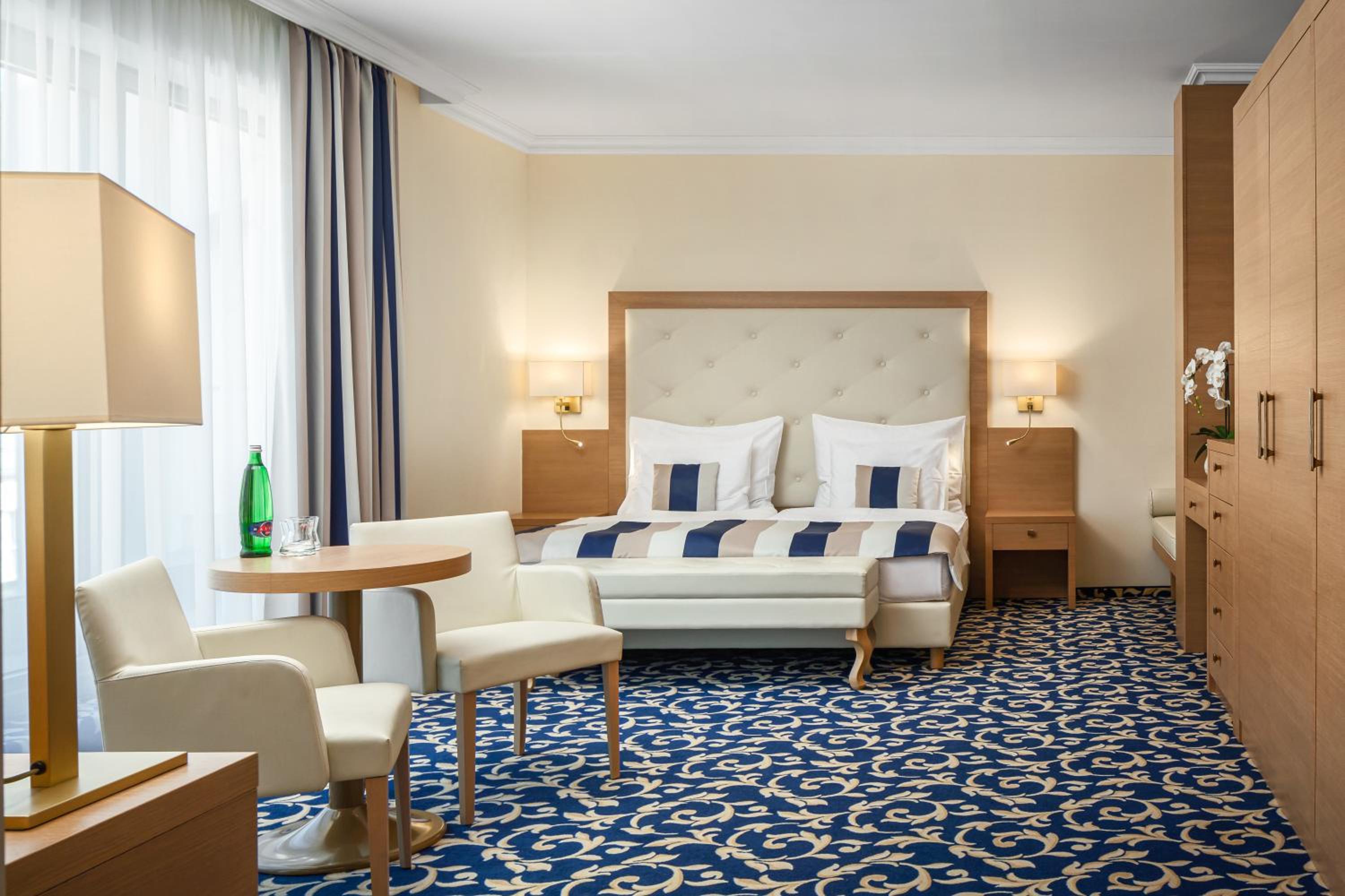 Grandhotel Nabokov in Mariánské Lázně offers elegant 4-star rooms with modern amenities like flat-screen TVs, minibars, and comfortable seating areas. The private bathrooms come with a bath or shower, and guests can enjoy complimentary WiFi and a wellness kit in each room.