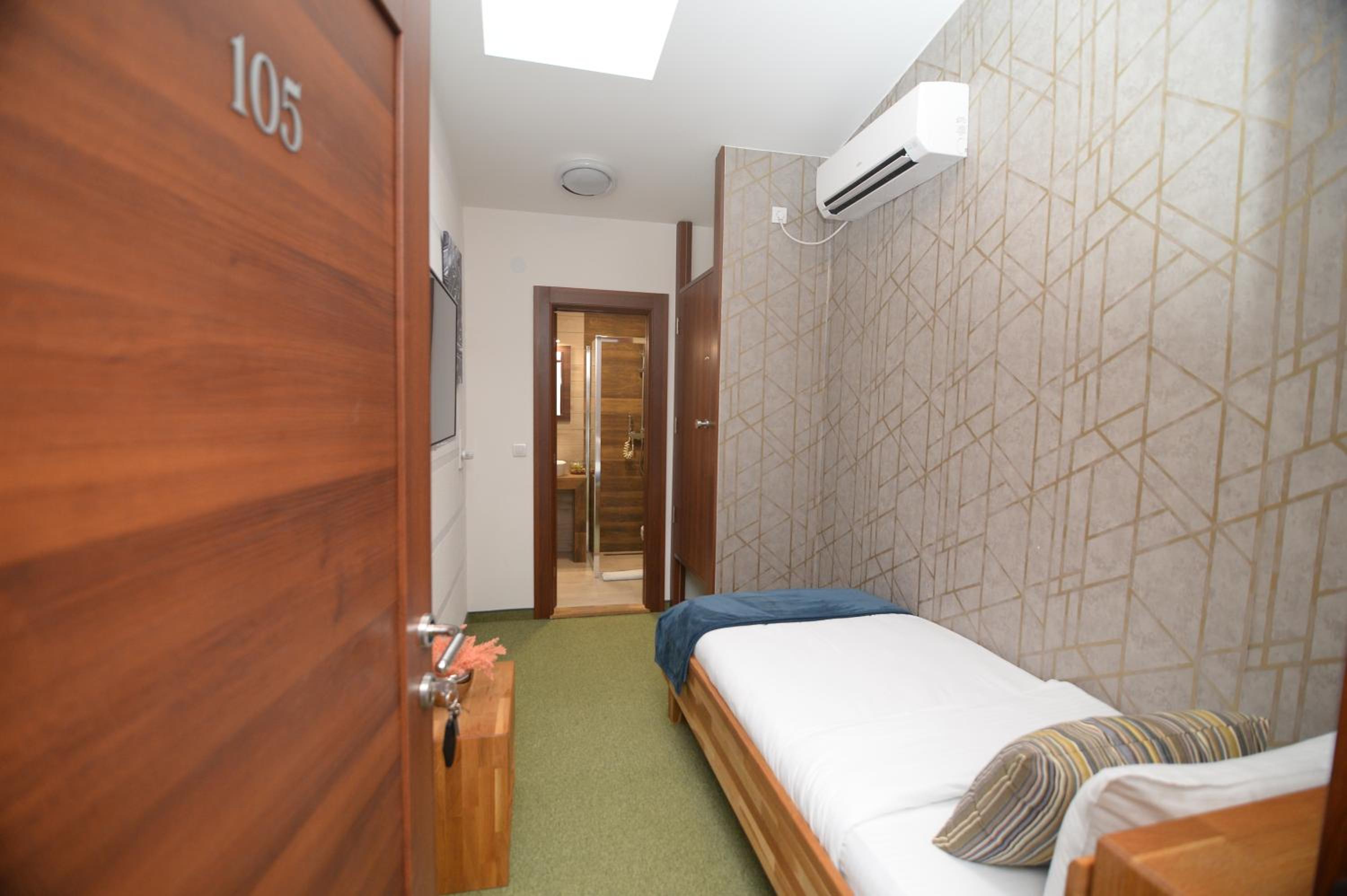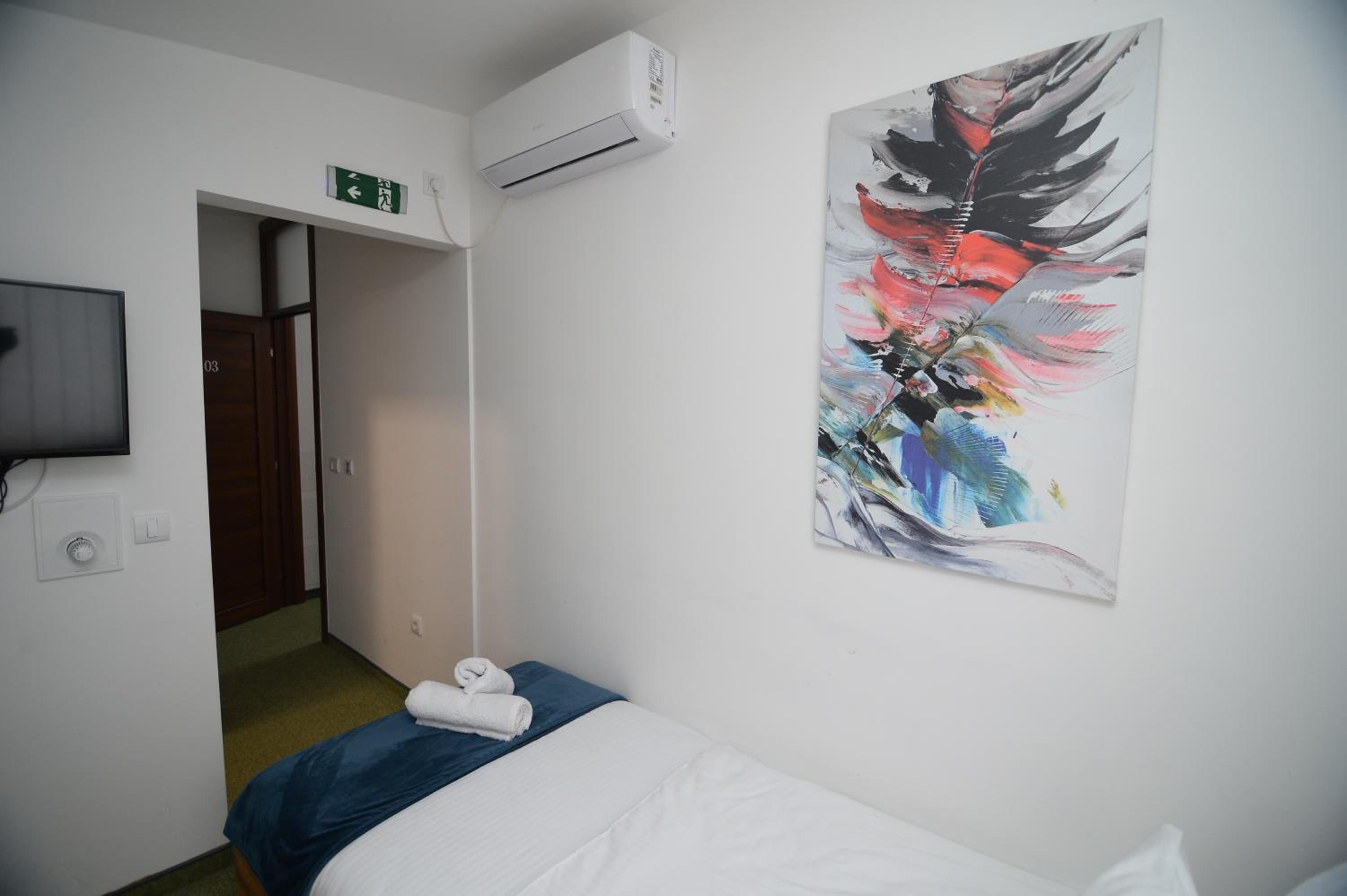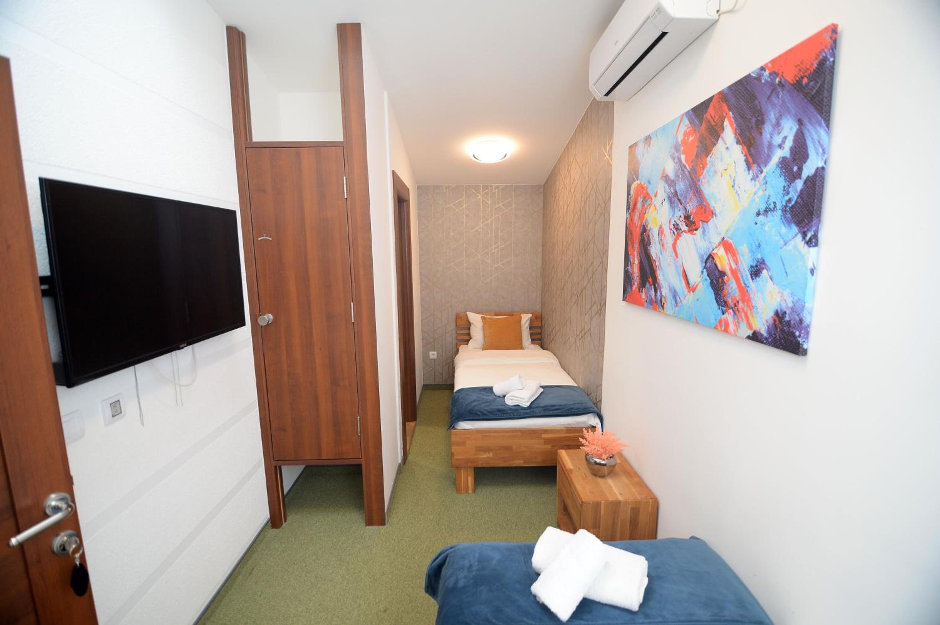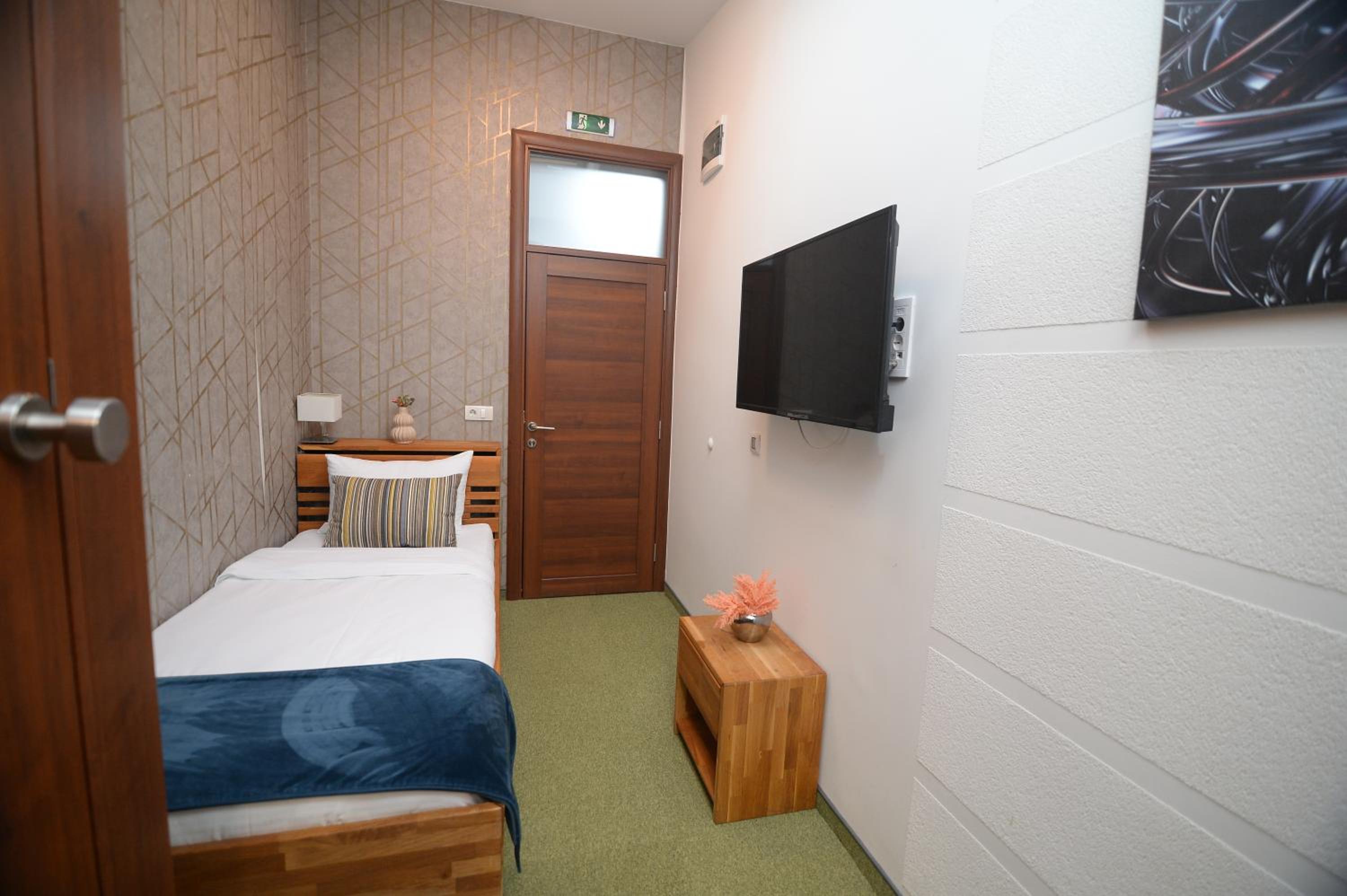 Soba je jako mala. Osim kreveta i mini ormara, ne postoji nista drugo, nemate mesto da spustite casu, a oko kreveta morate da se krecete bocno. S obzirom da nam je ovo bila usputna stanica, imali smo kofer srednje velicine i nismo imali gde da ga otvorimo. Pise da soba ima 15 kvadrata i mozda i jeste istina, ali ne u upotrebnom prostoru, vec soba ima visok plafon. Prozor je gledao u neki prostor ka drugom objektu, te skoro da nije imao prirodnu svetlost.