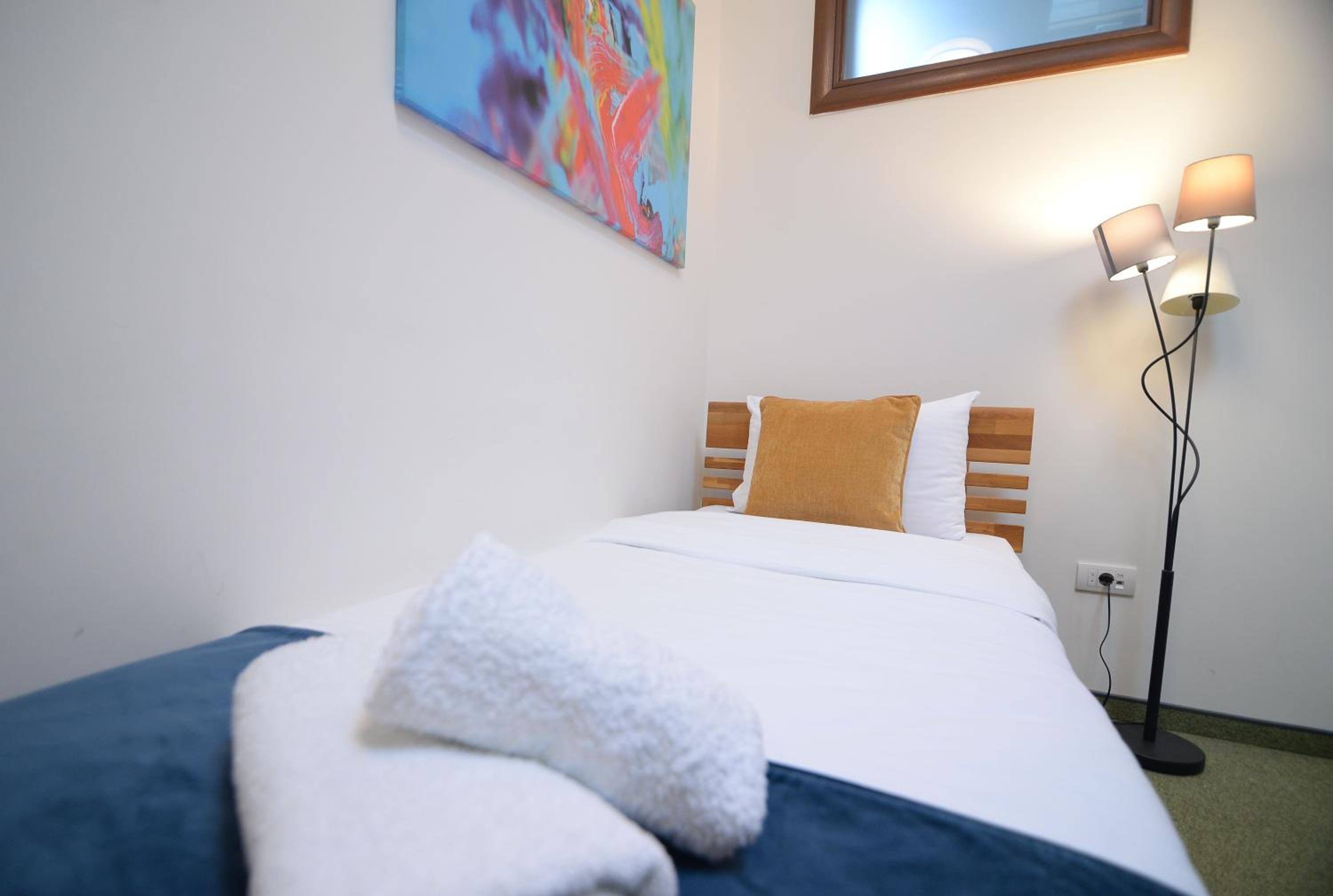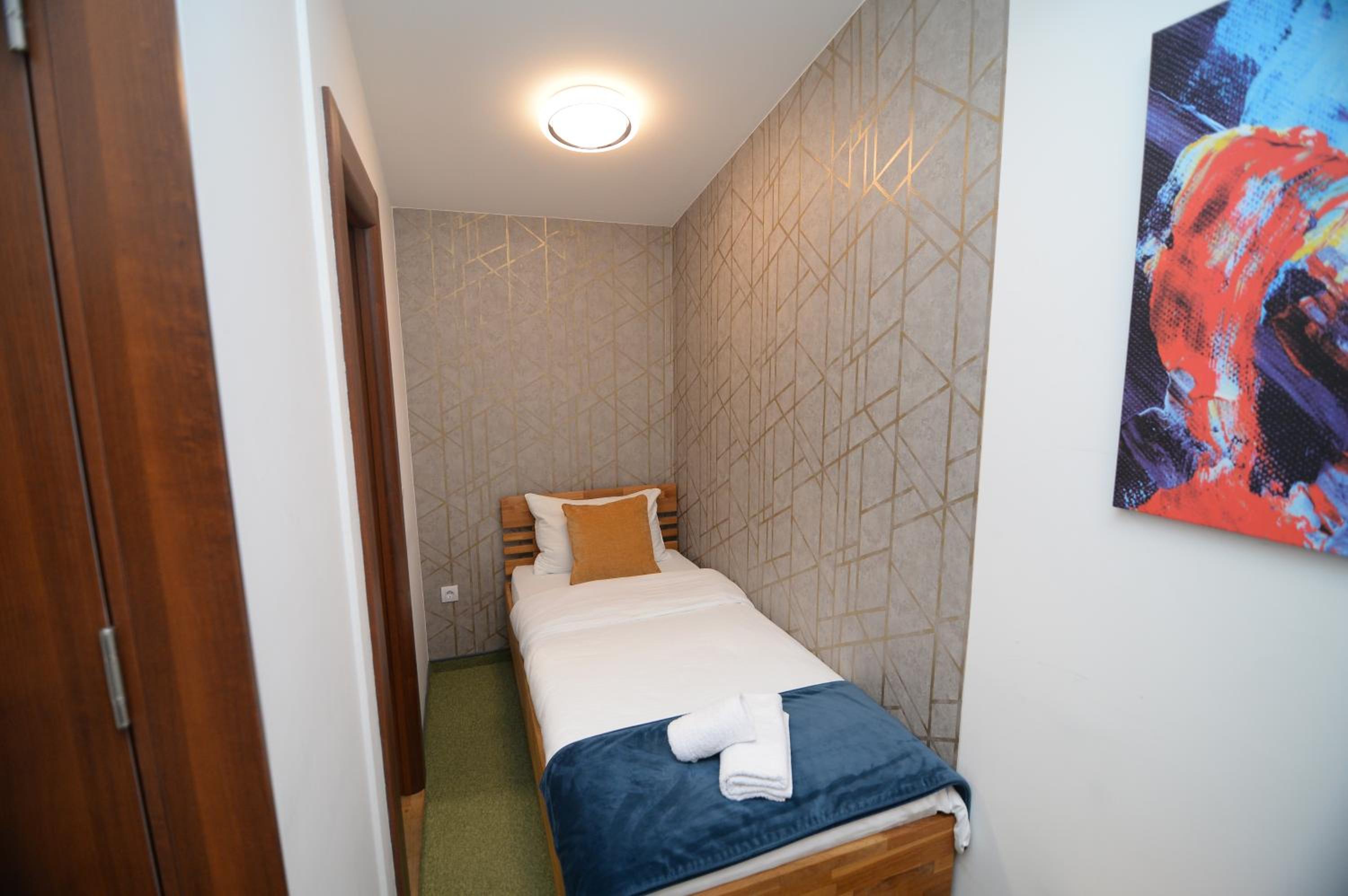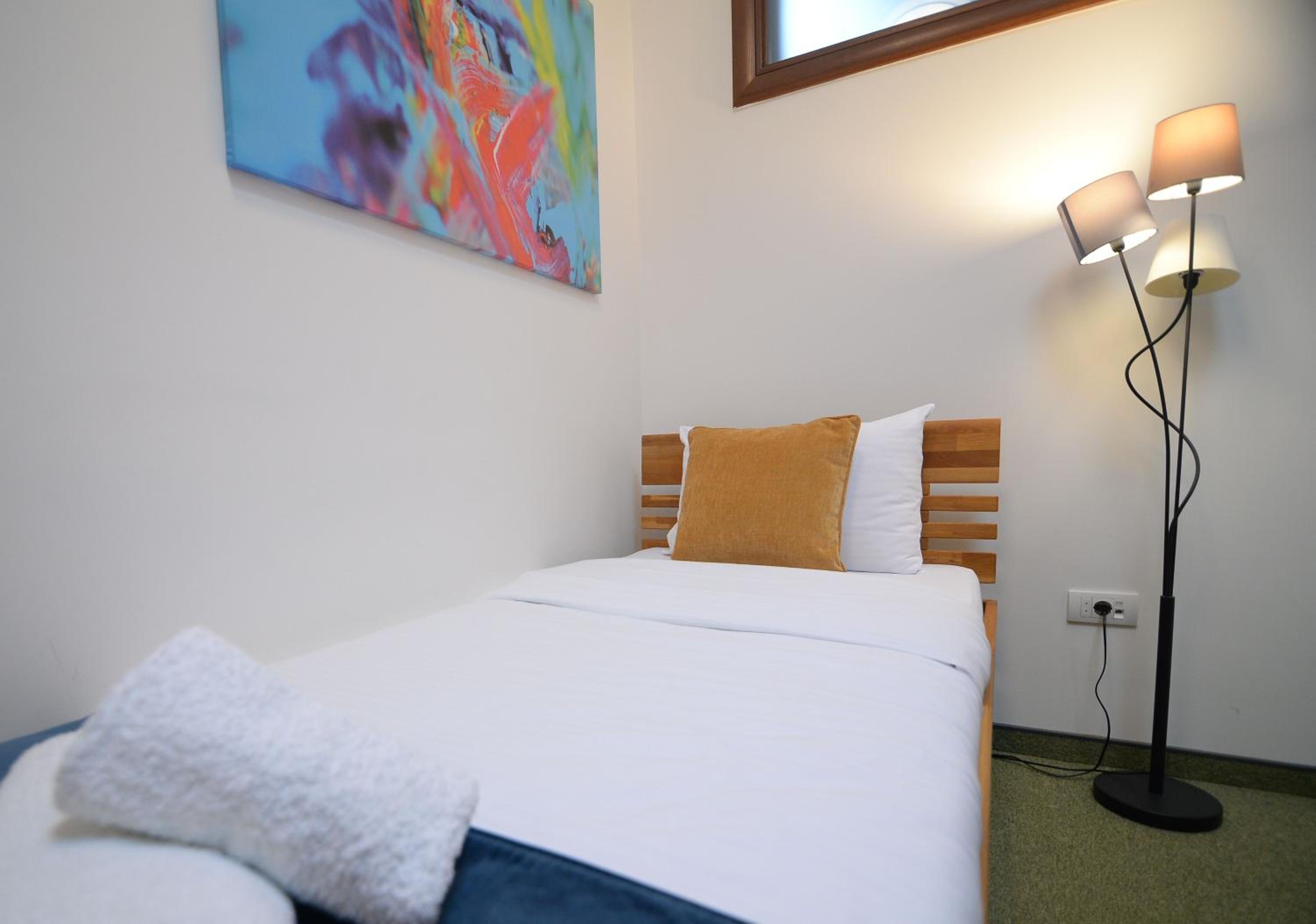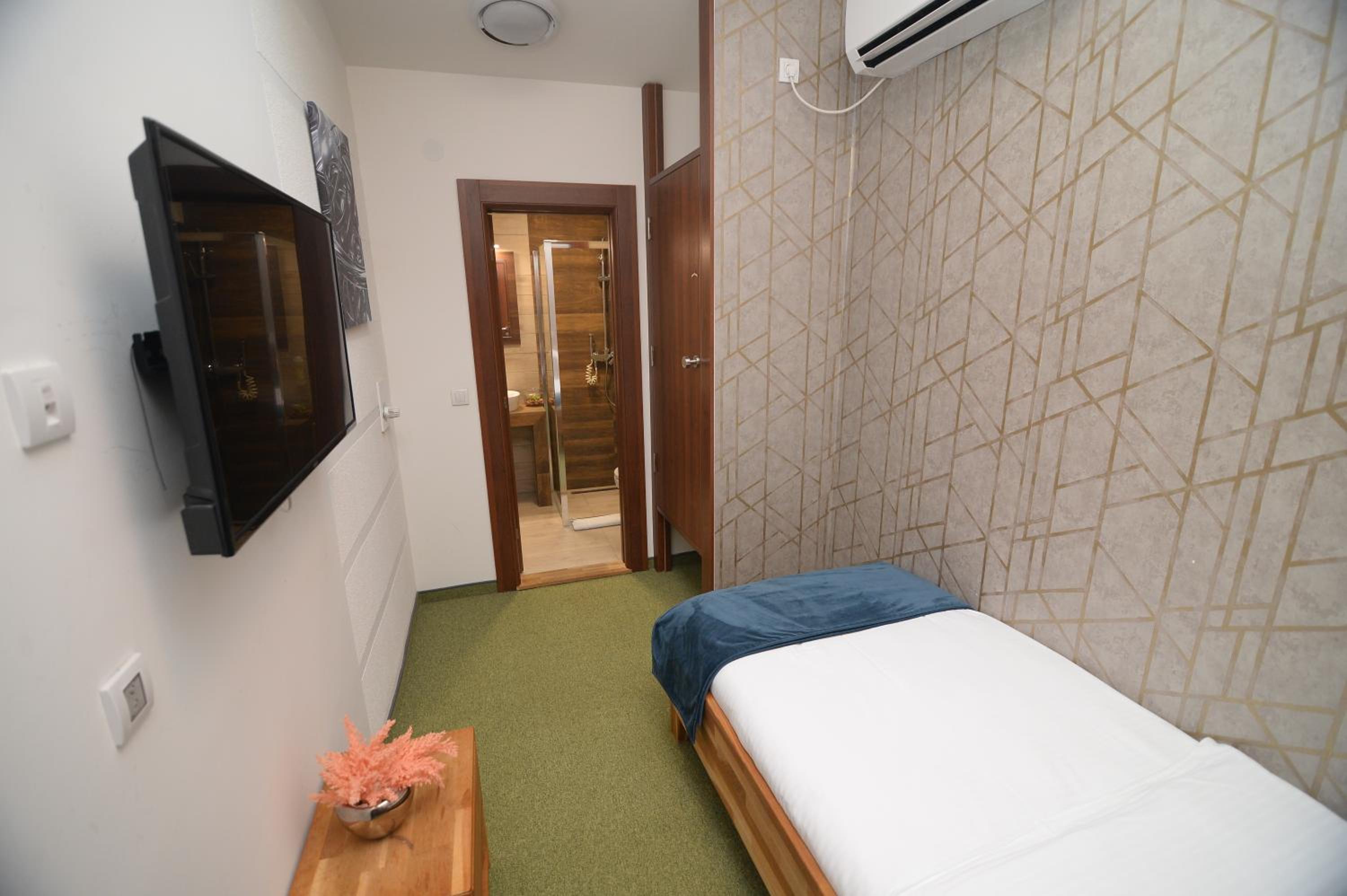 Soba je jako mala. Osim kreveta i mini ormara, ne postoji nista drugo, nemate mesto da spustite casu, a oko kreveta morate da se krecete bocno. S obzirom da nam je ovo bila usputna stanica, imali smo kofer srednje velicine i nismo imali gde da ga otvorimo. Pise da soba ima 15 kvadrata i mozda i jeste istina, ali ne u upotrebnom prostoru, vec soba ima visok plafon. Prozor je gledao u neki prostor ka drugom objektu, te skoro da nije imao prirodnu svetlost.