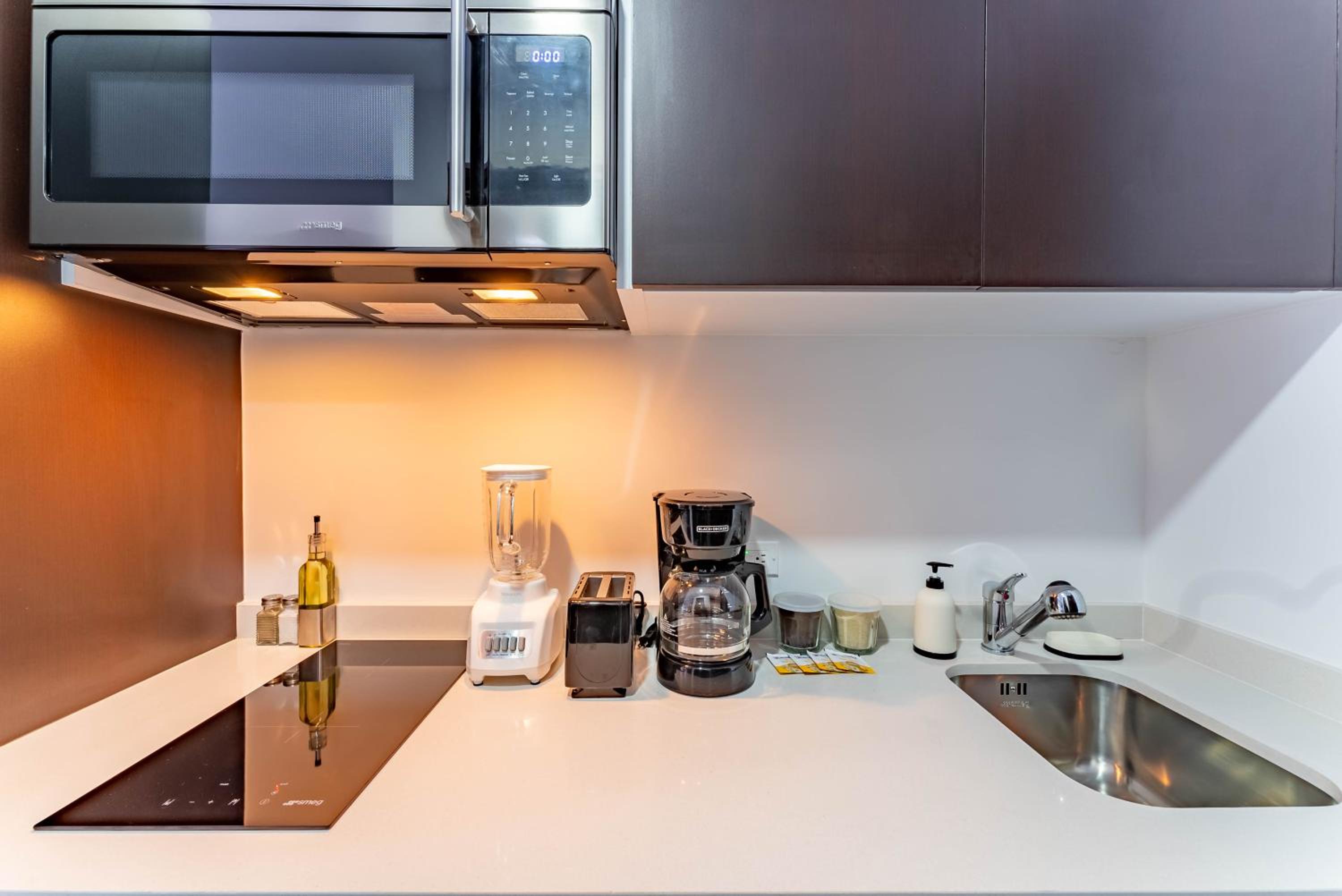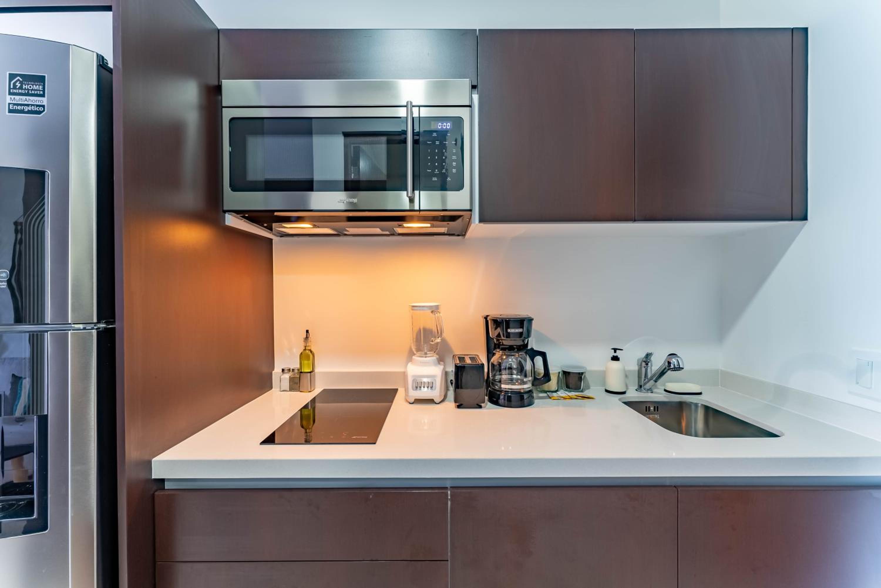 Très bel endroit avec une très grande piscine sur le toit. Le studio était très bien et donnait à l’arrière de l’édifice, ce que nous avons apprécié. Nos hôtes ont été très proactifs dans leurs communications et nous ont accommodés pour une nuit. Merci