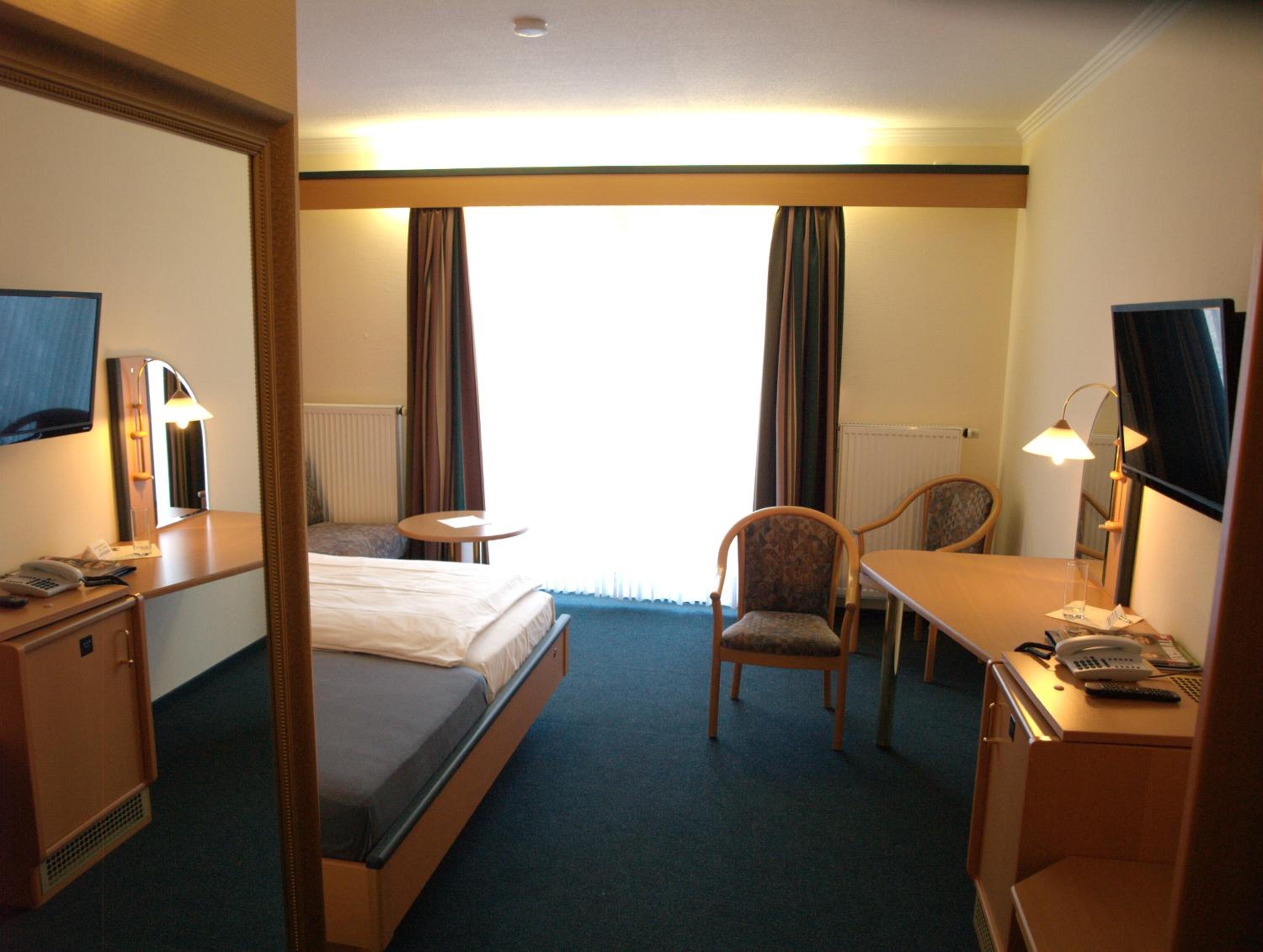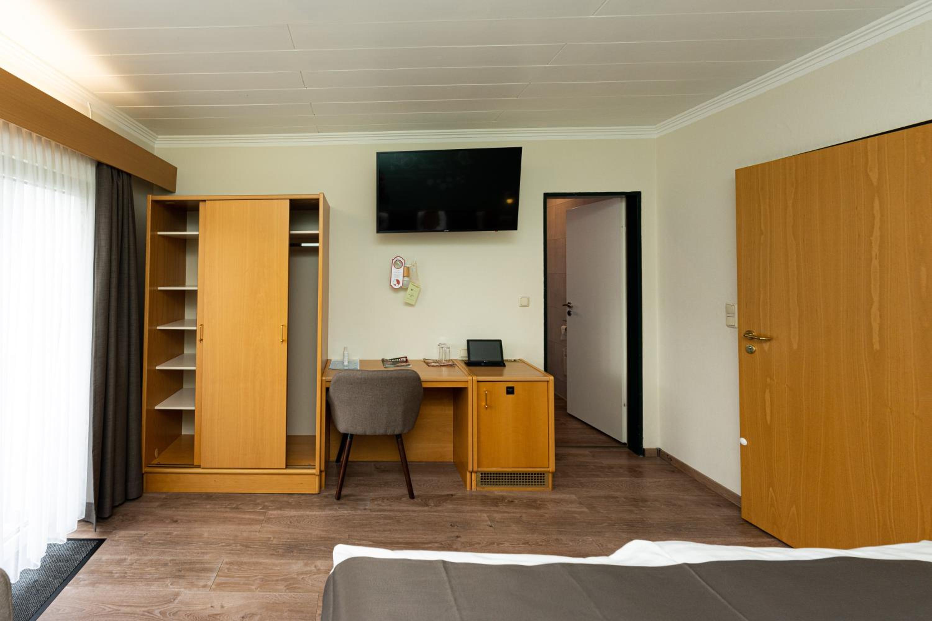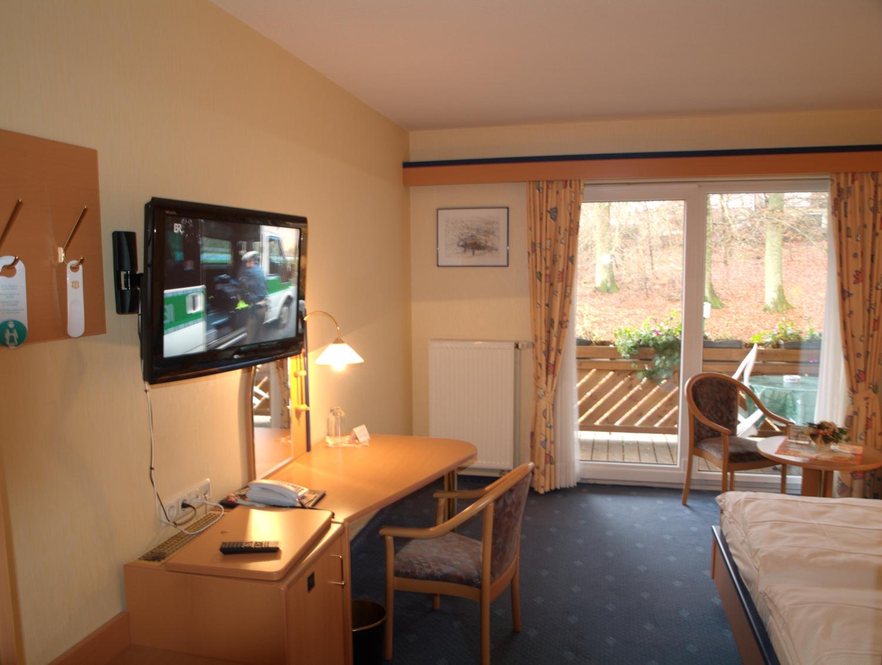 Each room at Waldhotel Kurfürst is thoughtfully designed with a flat-screen TV, private bathroom, and plush amenities. Some rooms feature a serene patio with garden vistas, ensuring a peaceful stay.