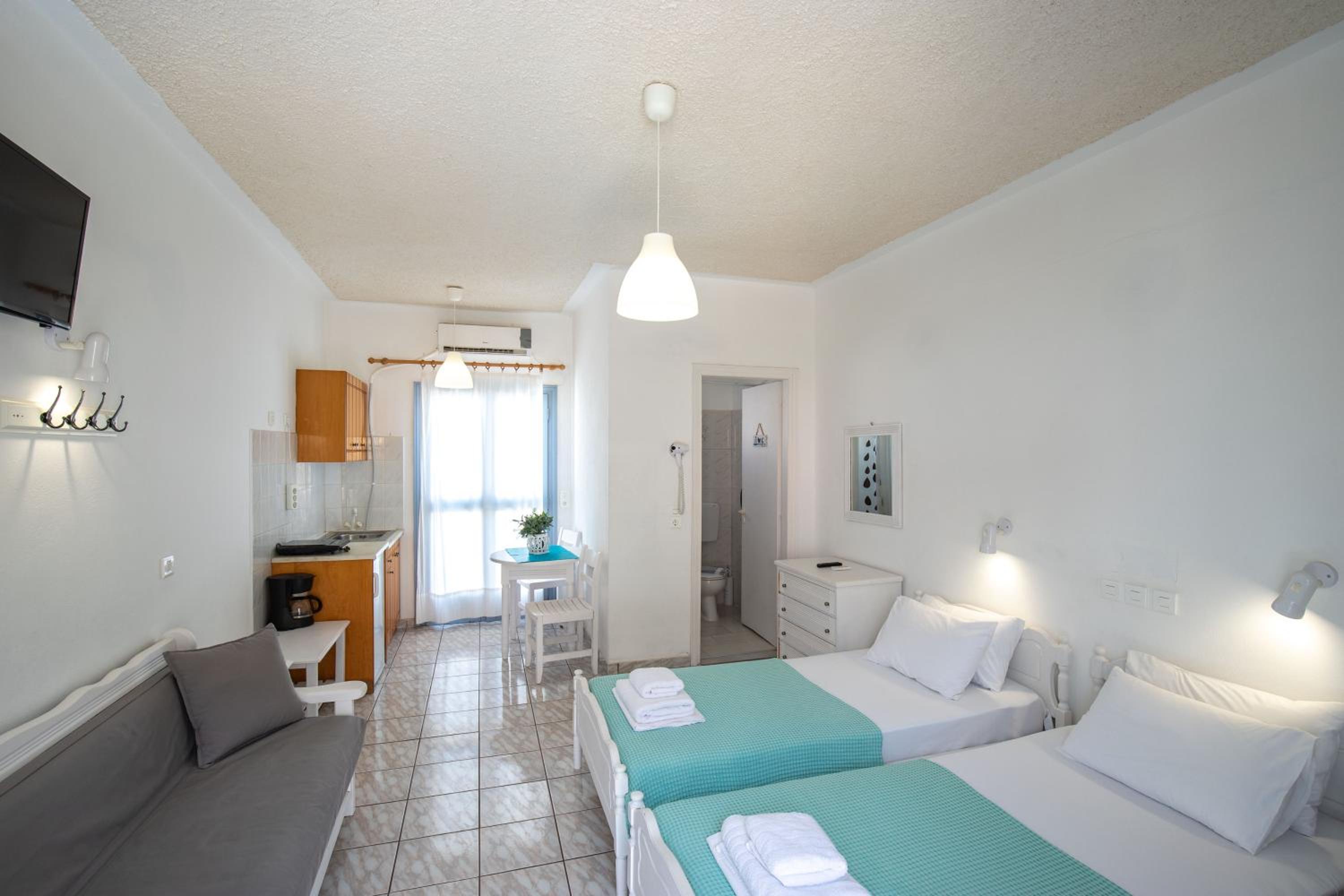 The air-conditioned studios at Zacharakis provide a comfortable stay with essential amenities. Each studio features a bathroom with a shower, a kitchen equipped with a fridge, and a private balcony offering stunning sea or mountain views. Perfect for guests looking for a cozy retreat.