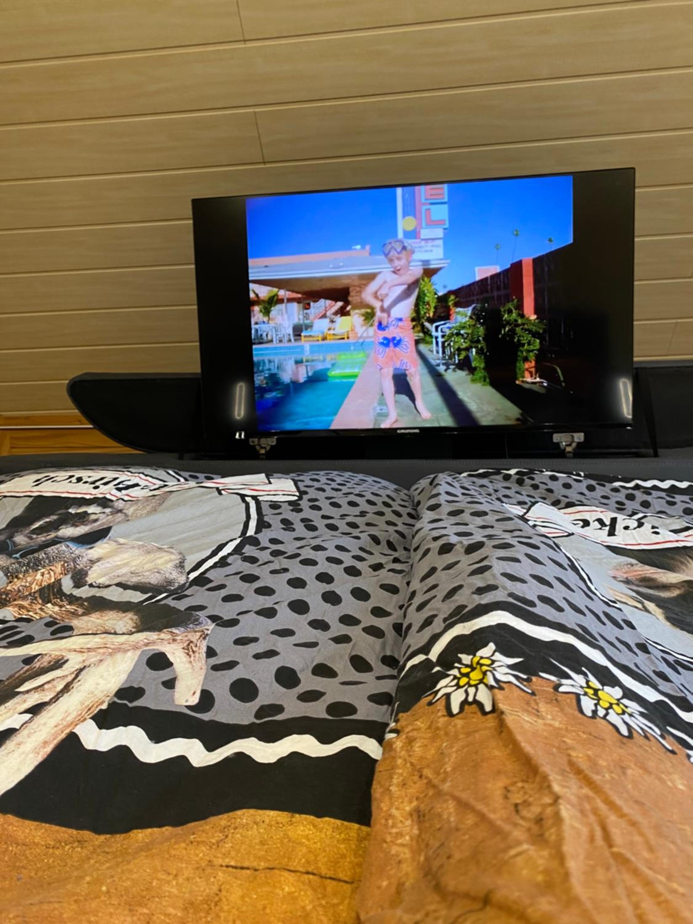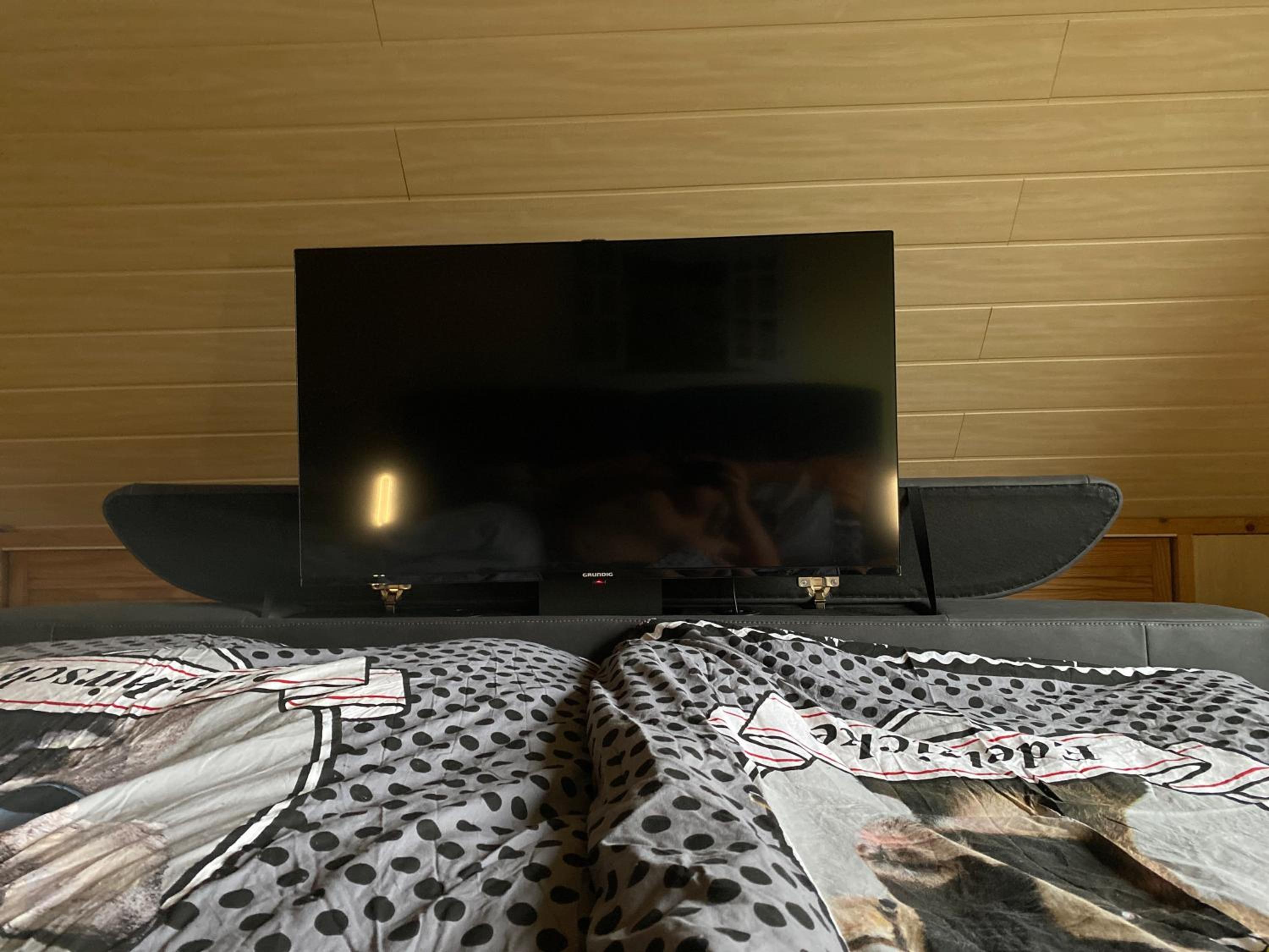 Bett gut und mit ausfahrbarem TV