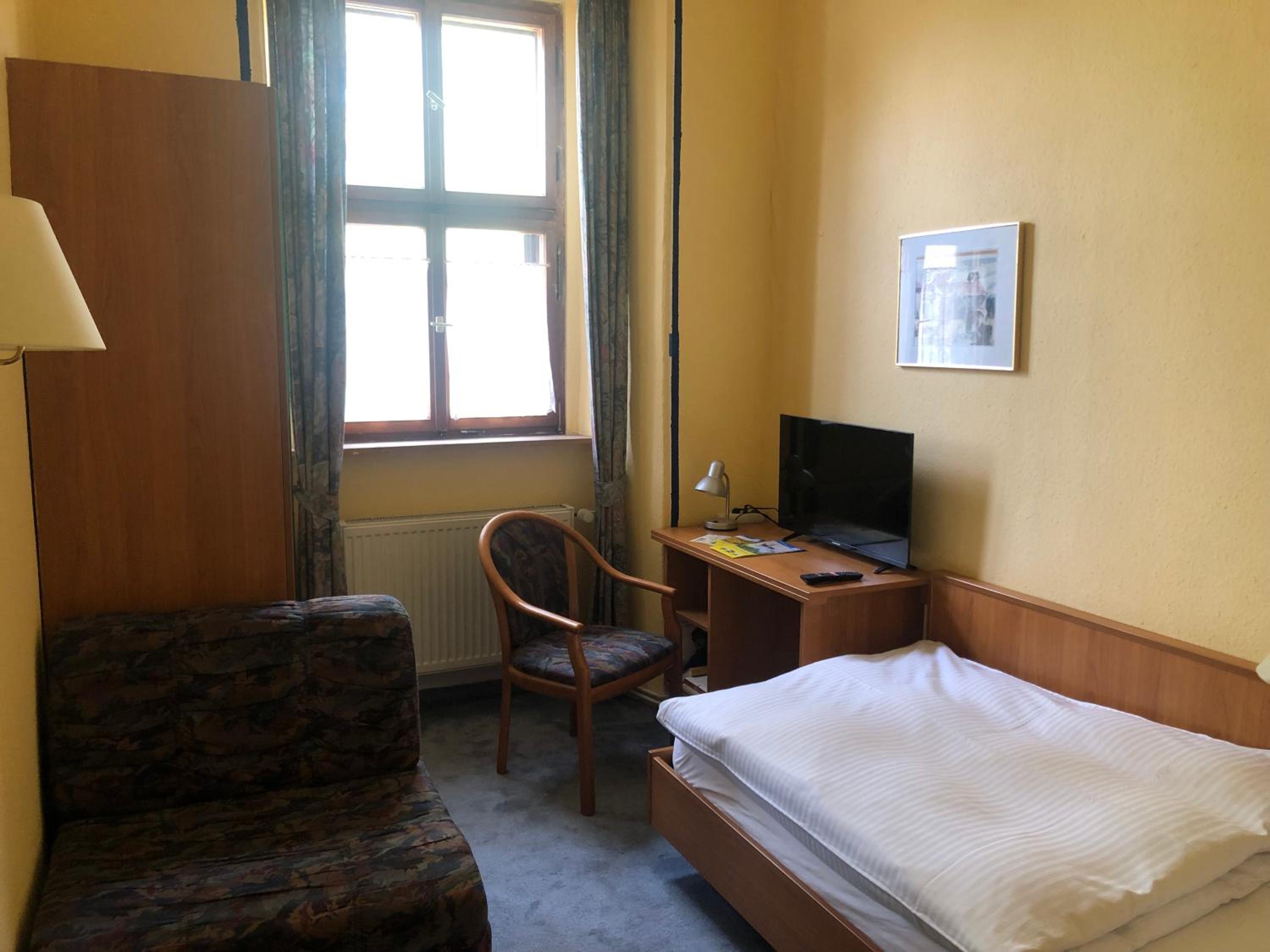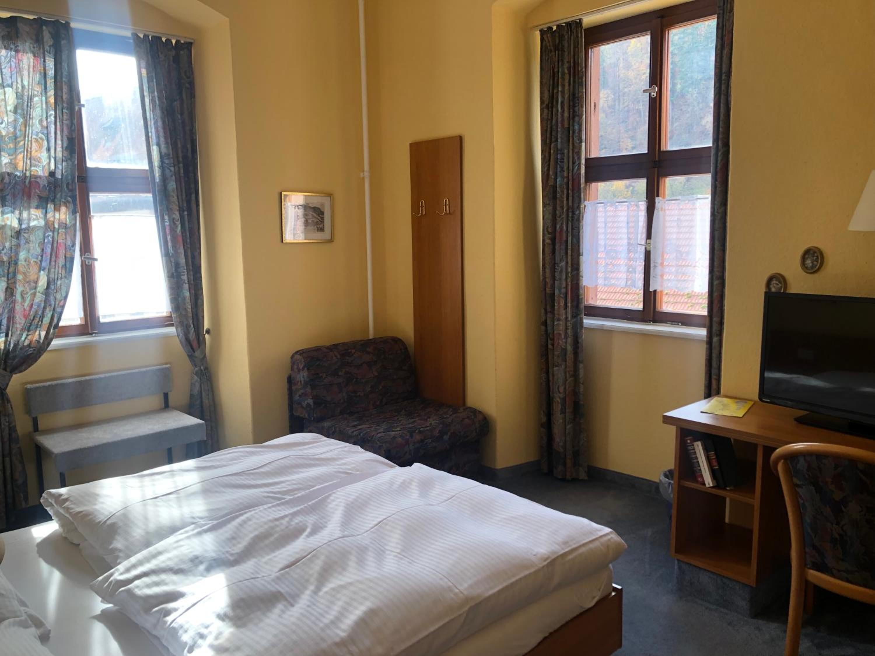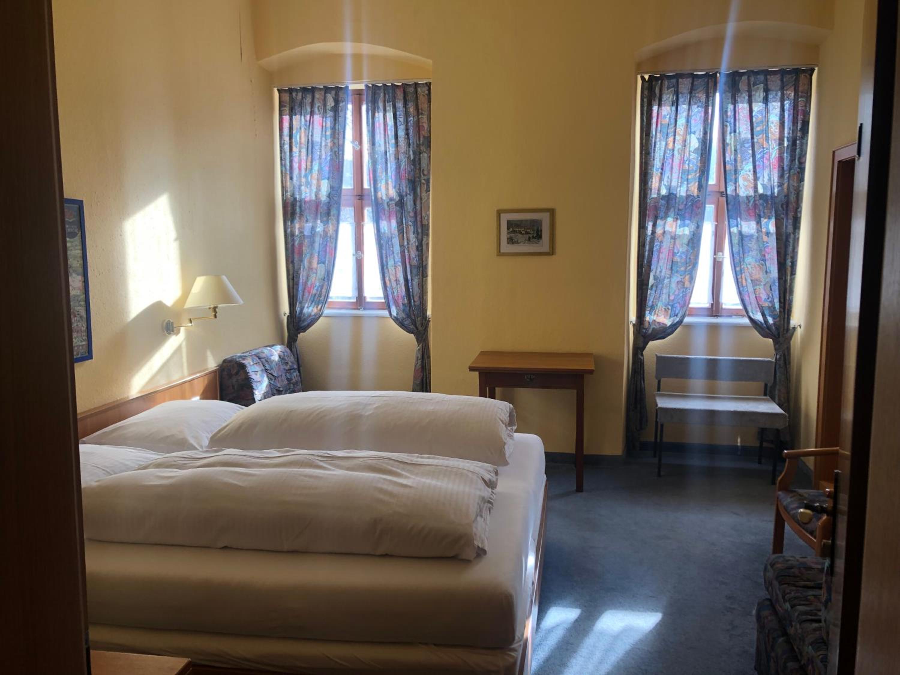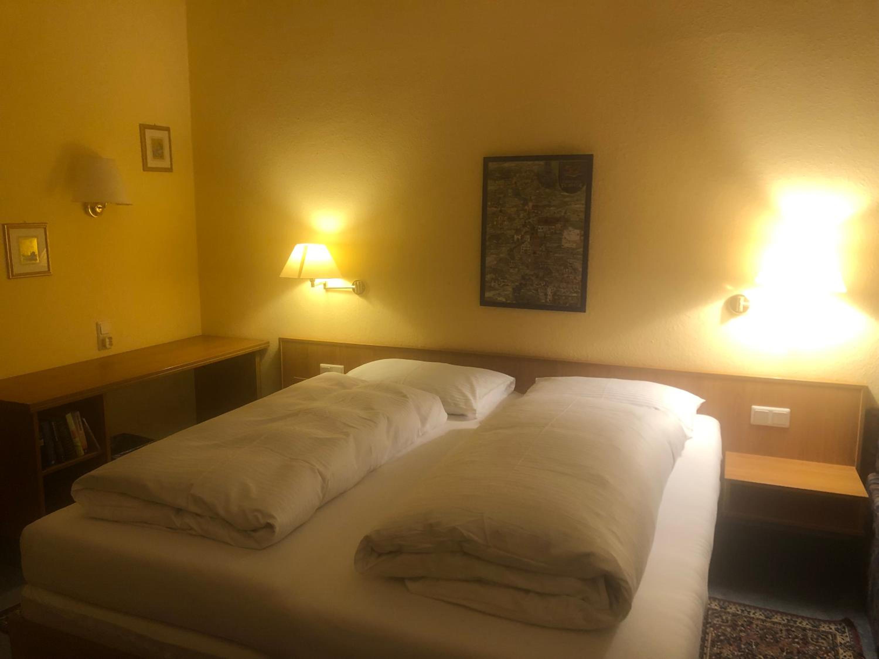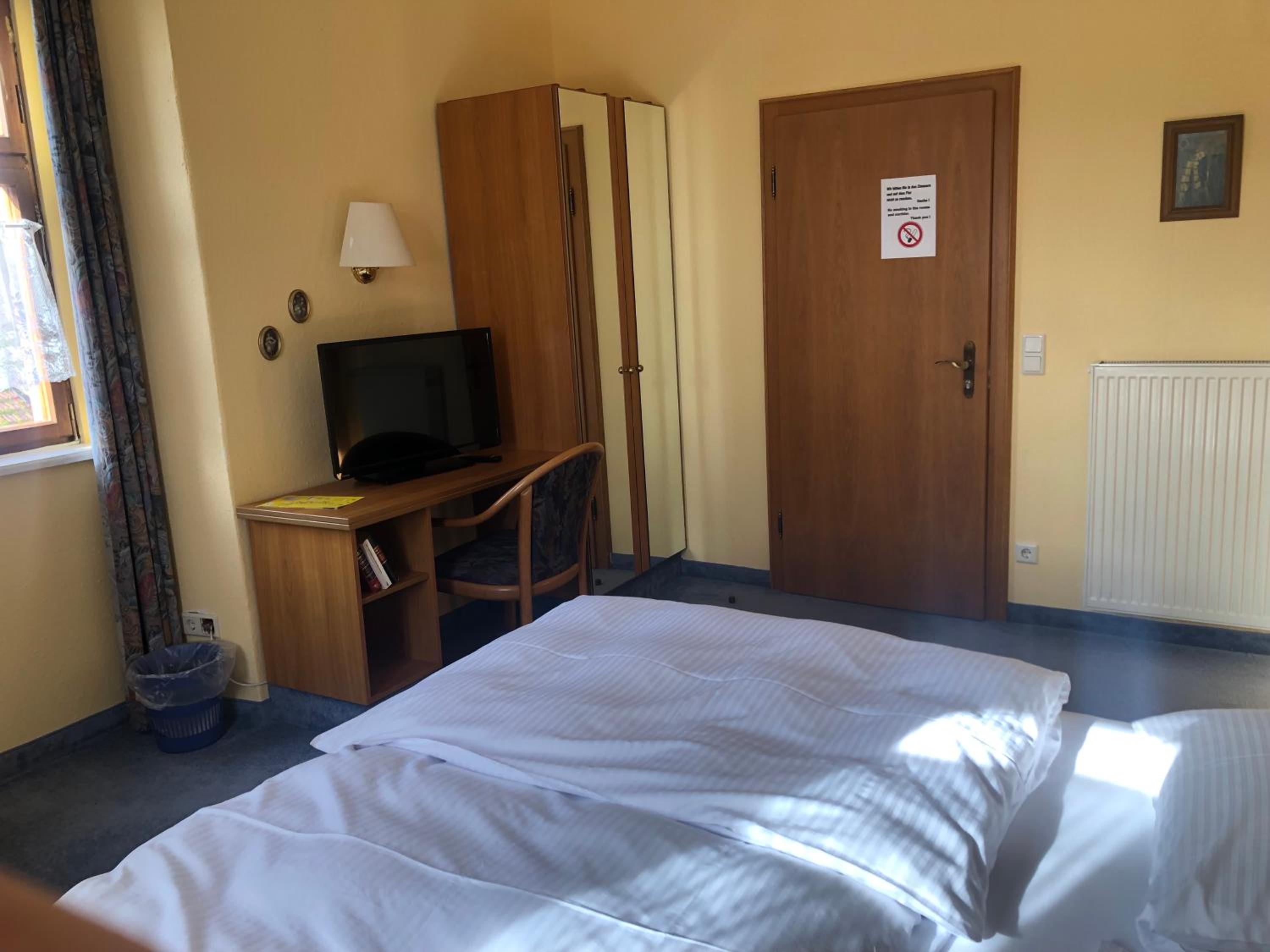 Kleine Zimmer in altem historischem Gebäude, sehr sauber und mit SAT-Fernseher ausgestattet. Genügend Steckdosen im Zimmer vorhanden. Wallbox für E-Auto gegenüber und kostenlose Parkplätze direkt vor dem Gasthof.