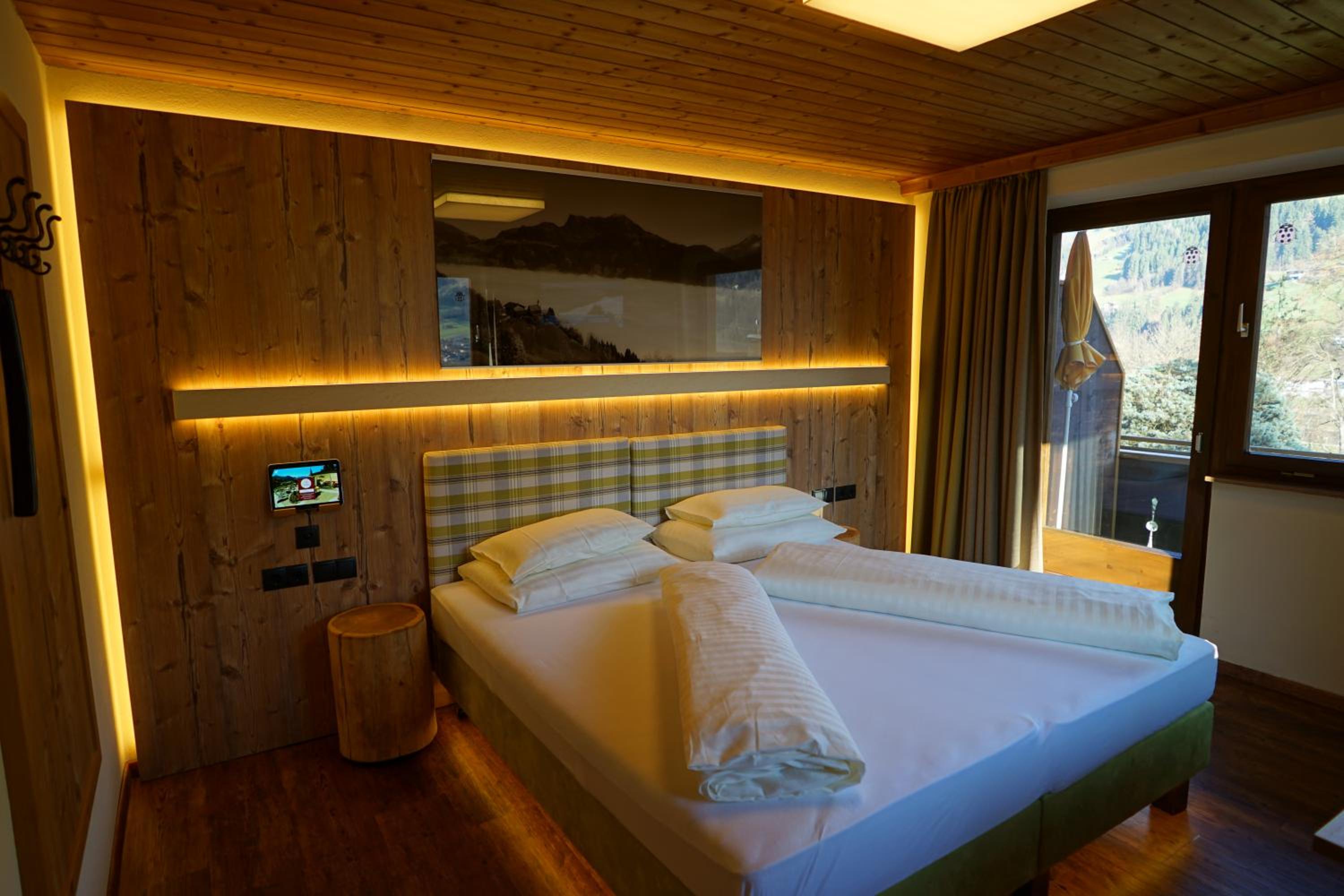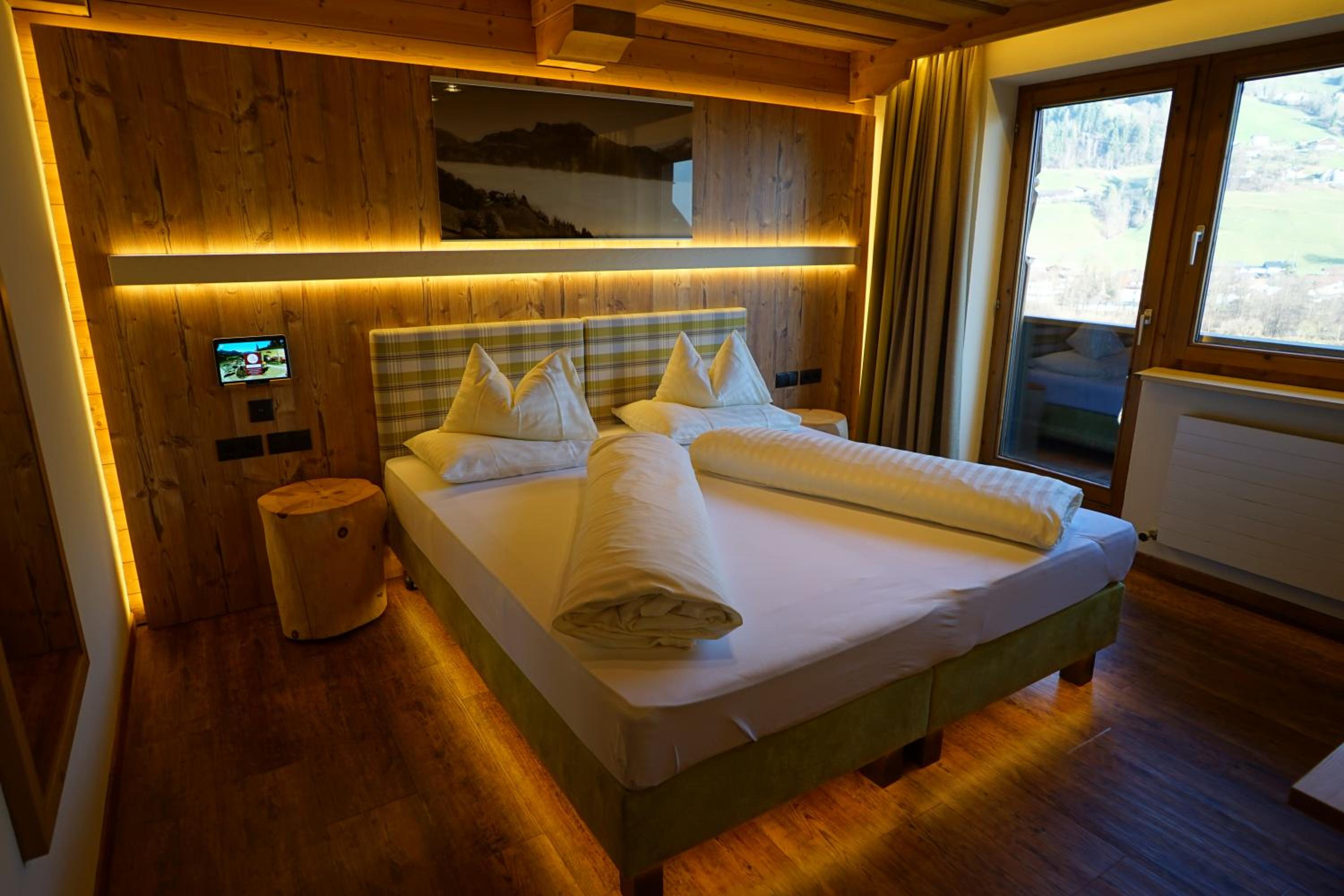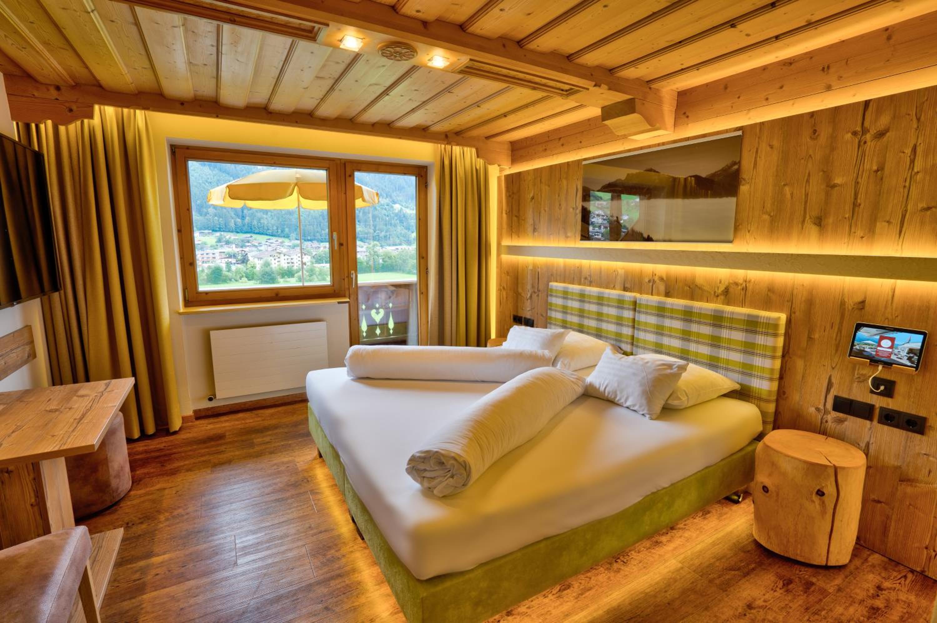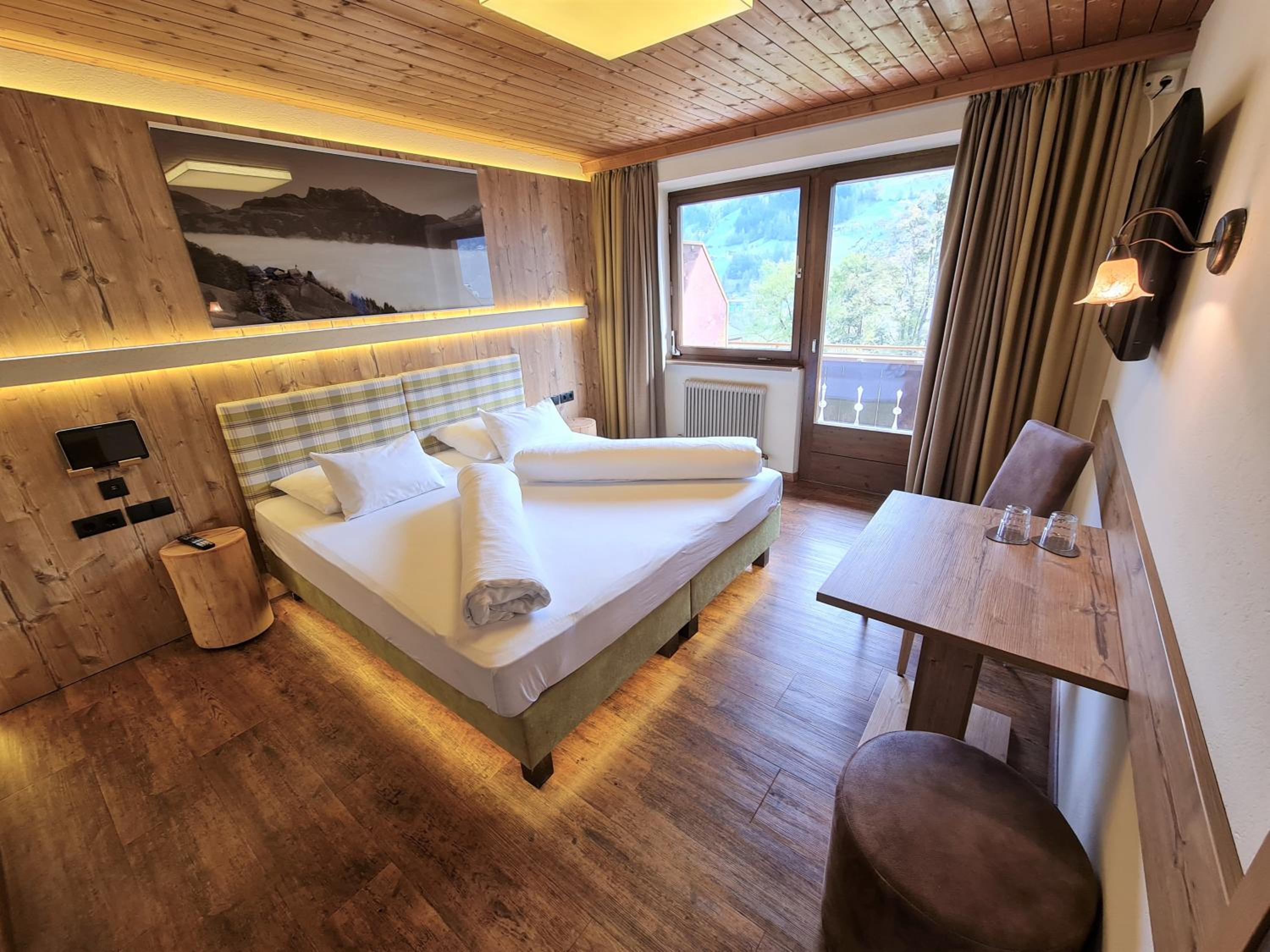Comfortable Accommodation: Relax in spacious Tyrolean-style rooms, many with balconies offering stunning mountain views, and equipped with modern amenities including a large flat-screen TV.