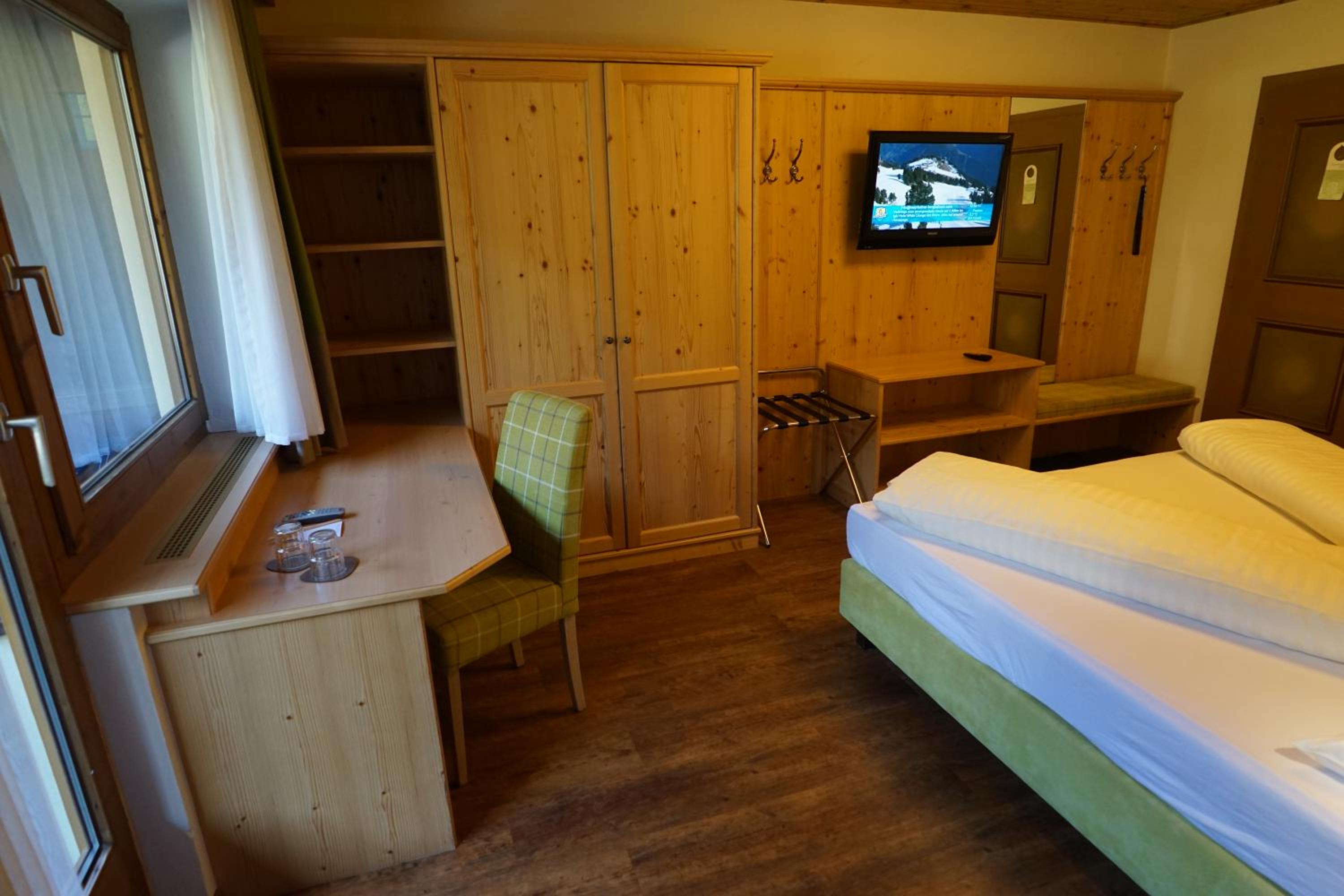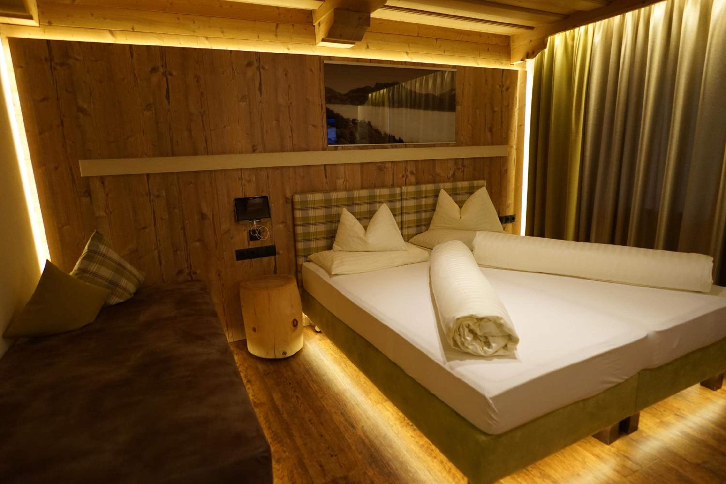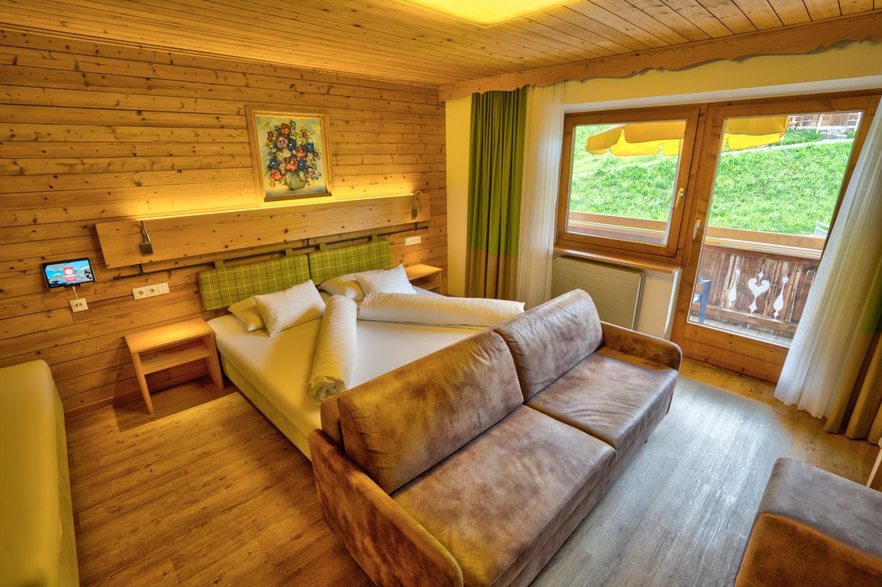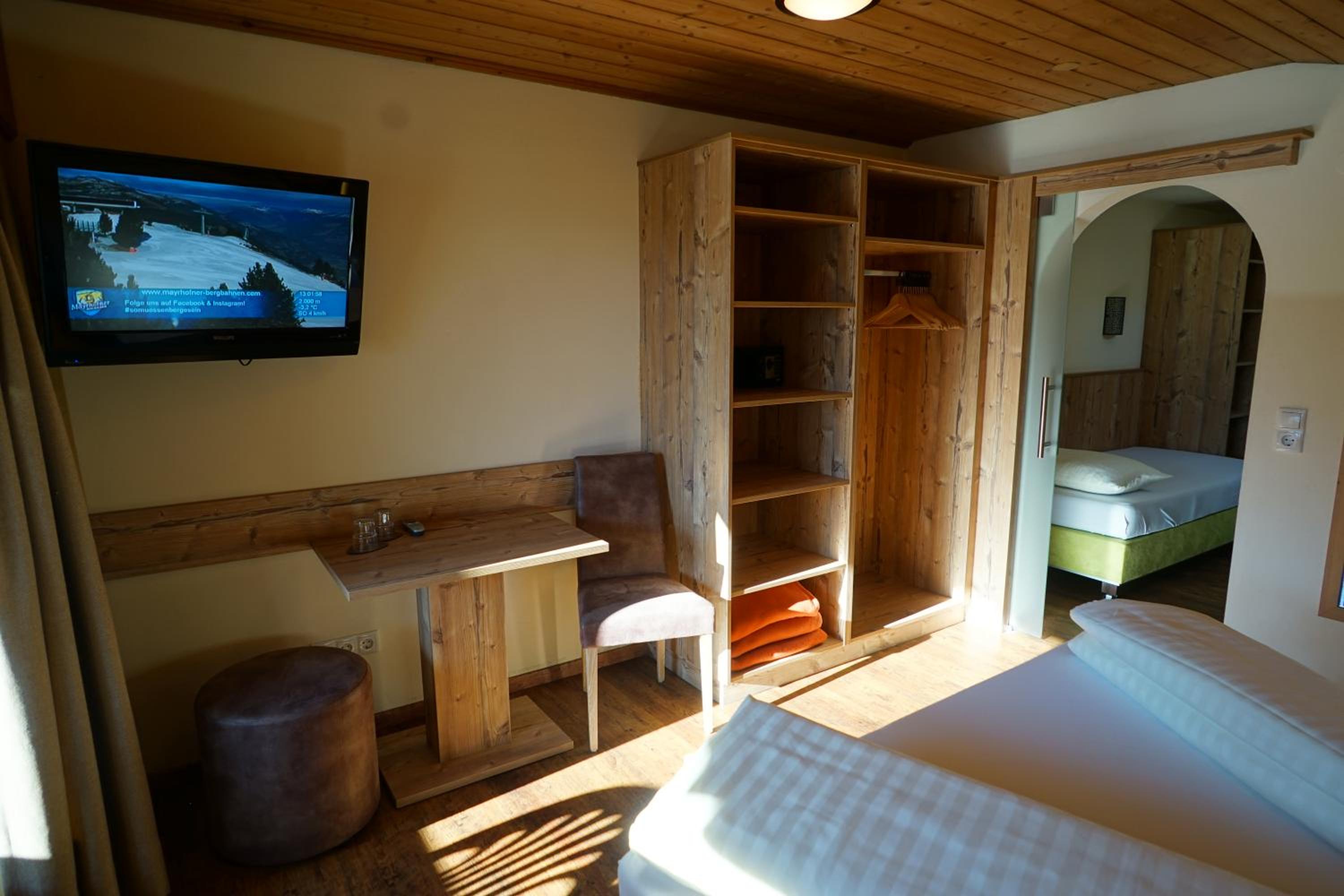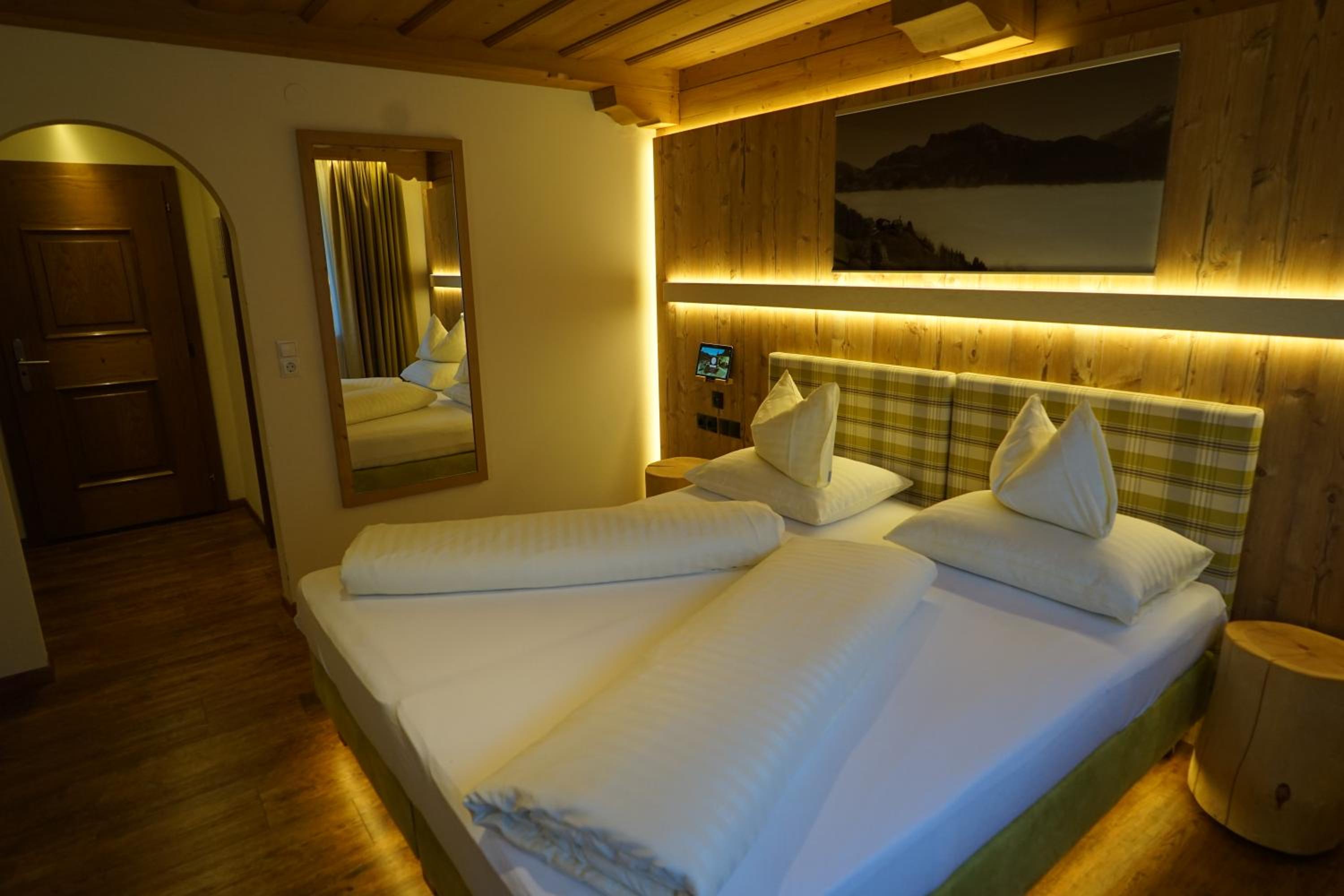 Comfortable Accommodation: Relax in spacious Tyrolean-style rooms, many with balconies offering stunning mountain views, and equipped with modern amenities including a large flat-screen TV.