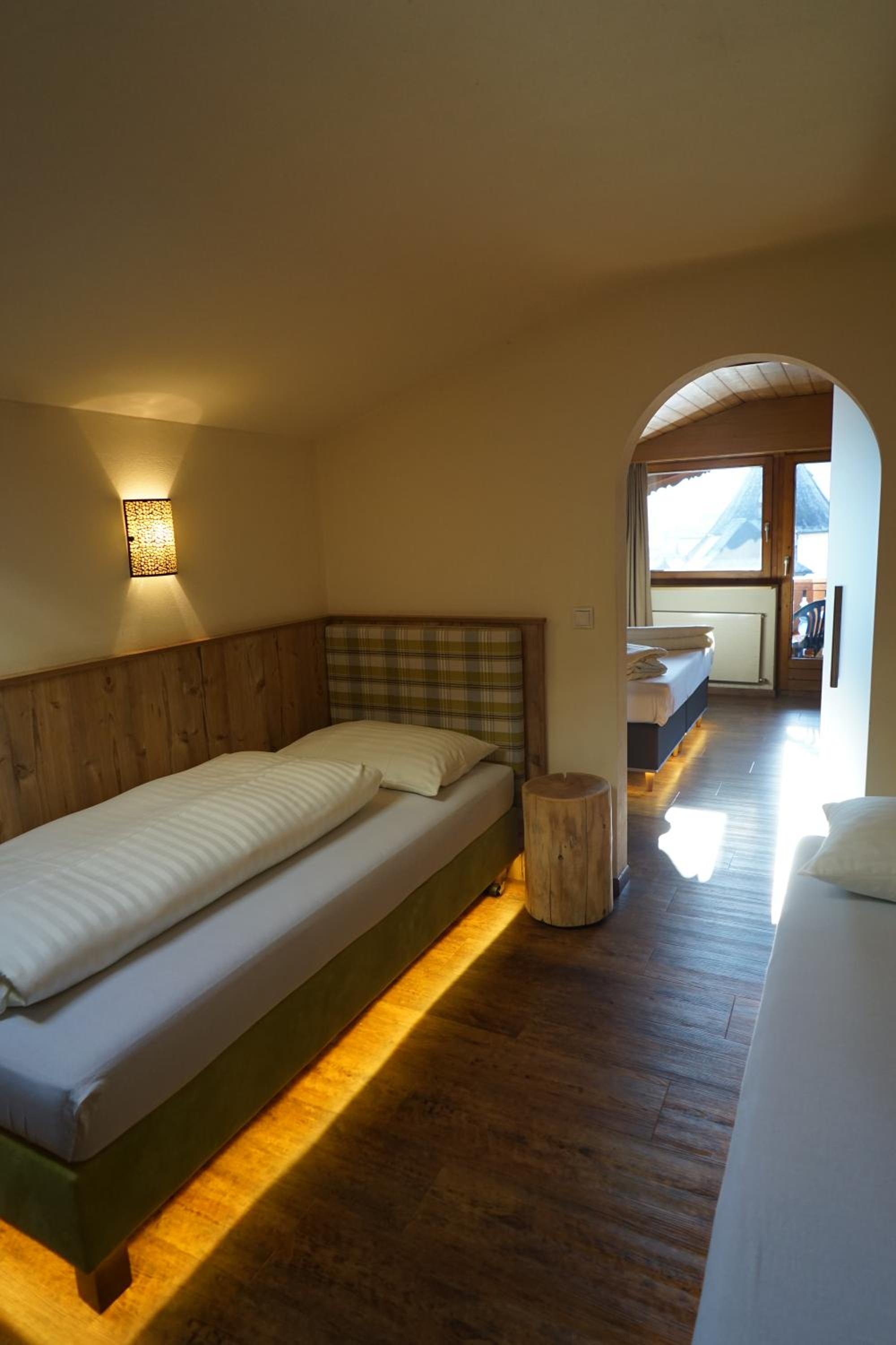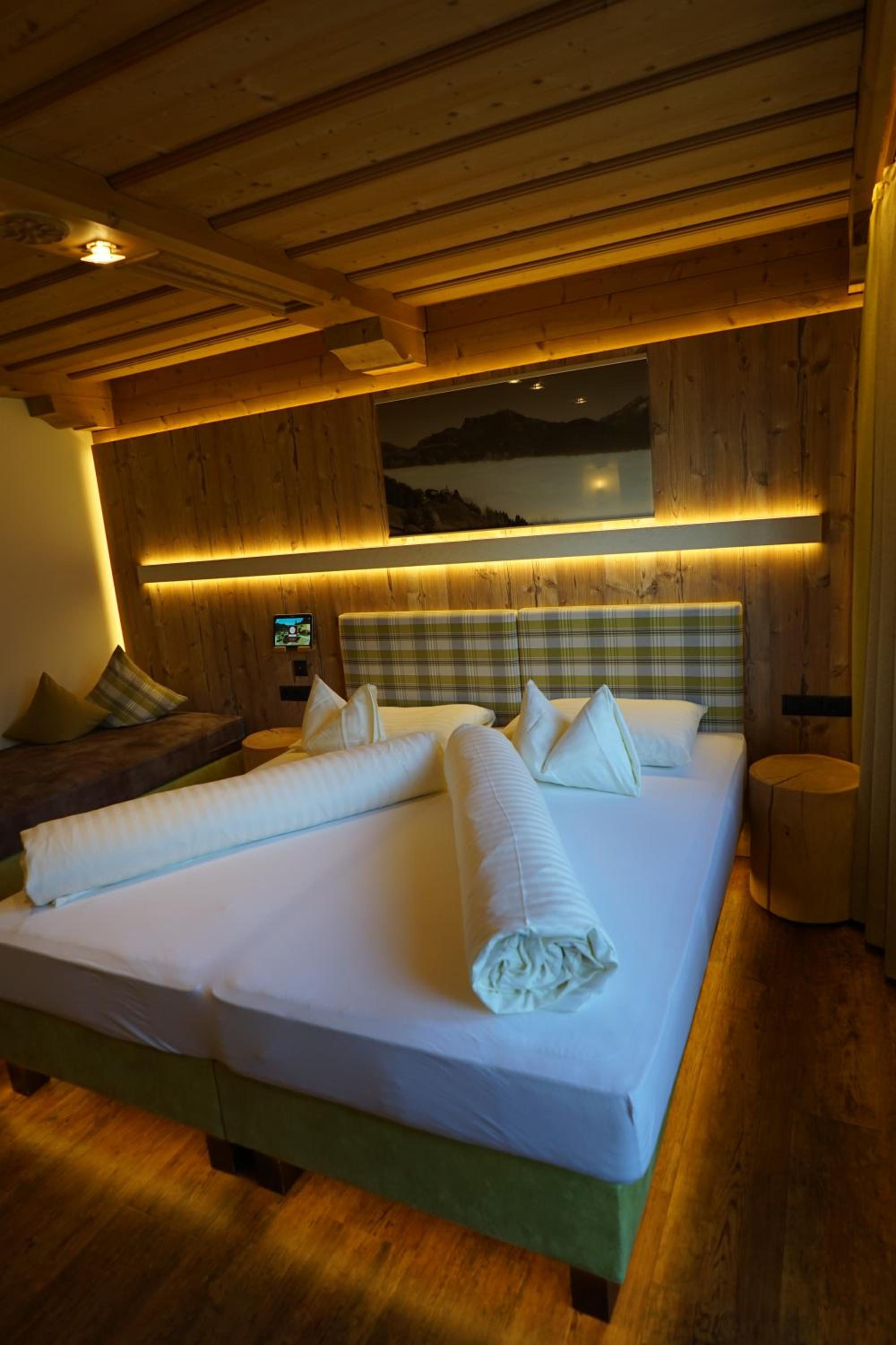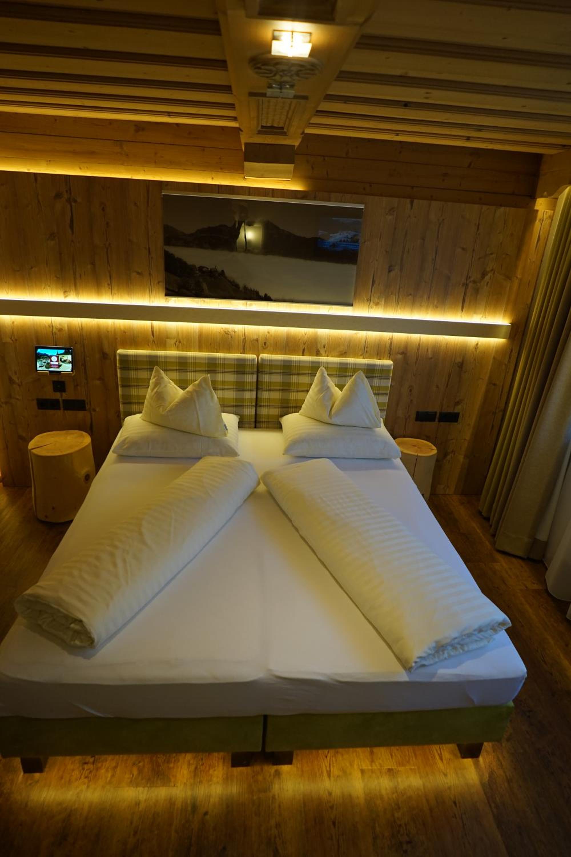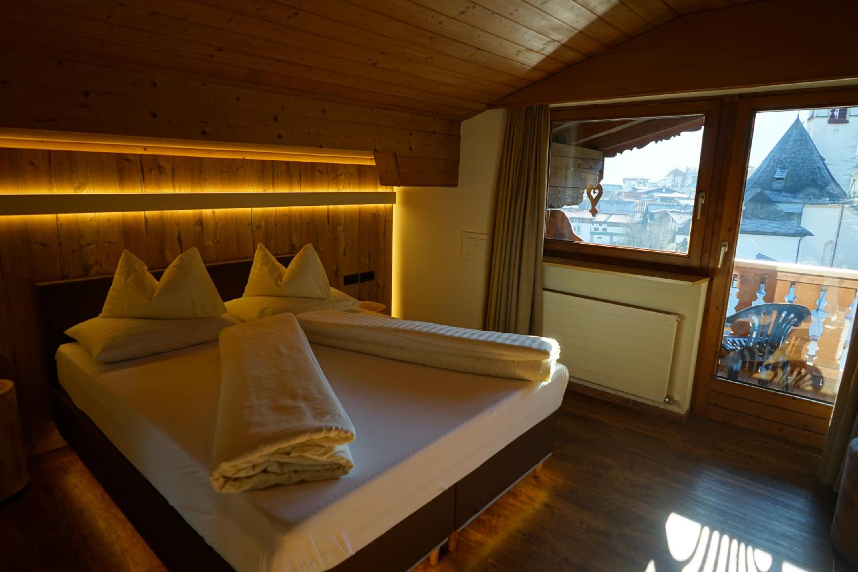 Comfortable Accommodation: Relax in spacious Tyrolean-style rooms, many with balconies offering stunning mountain views, and equipped with modern amenities including a large flat-screen TV.