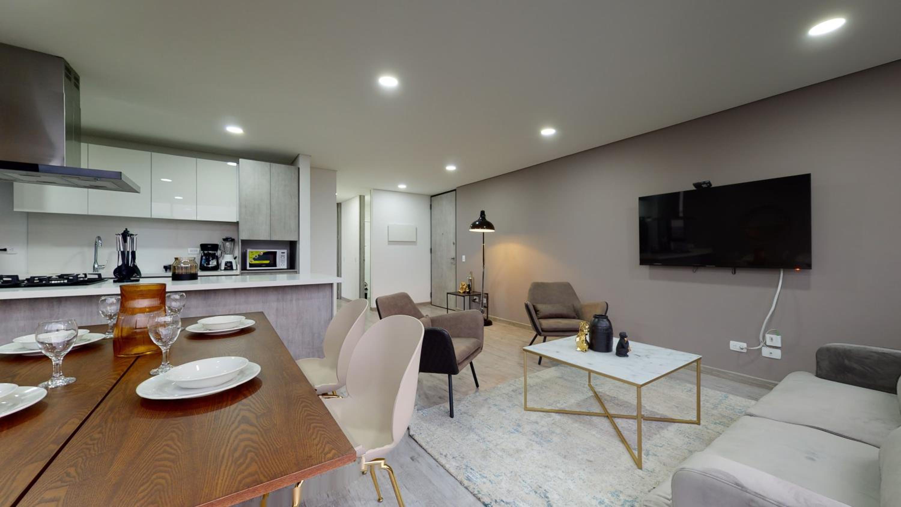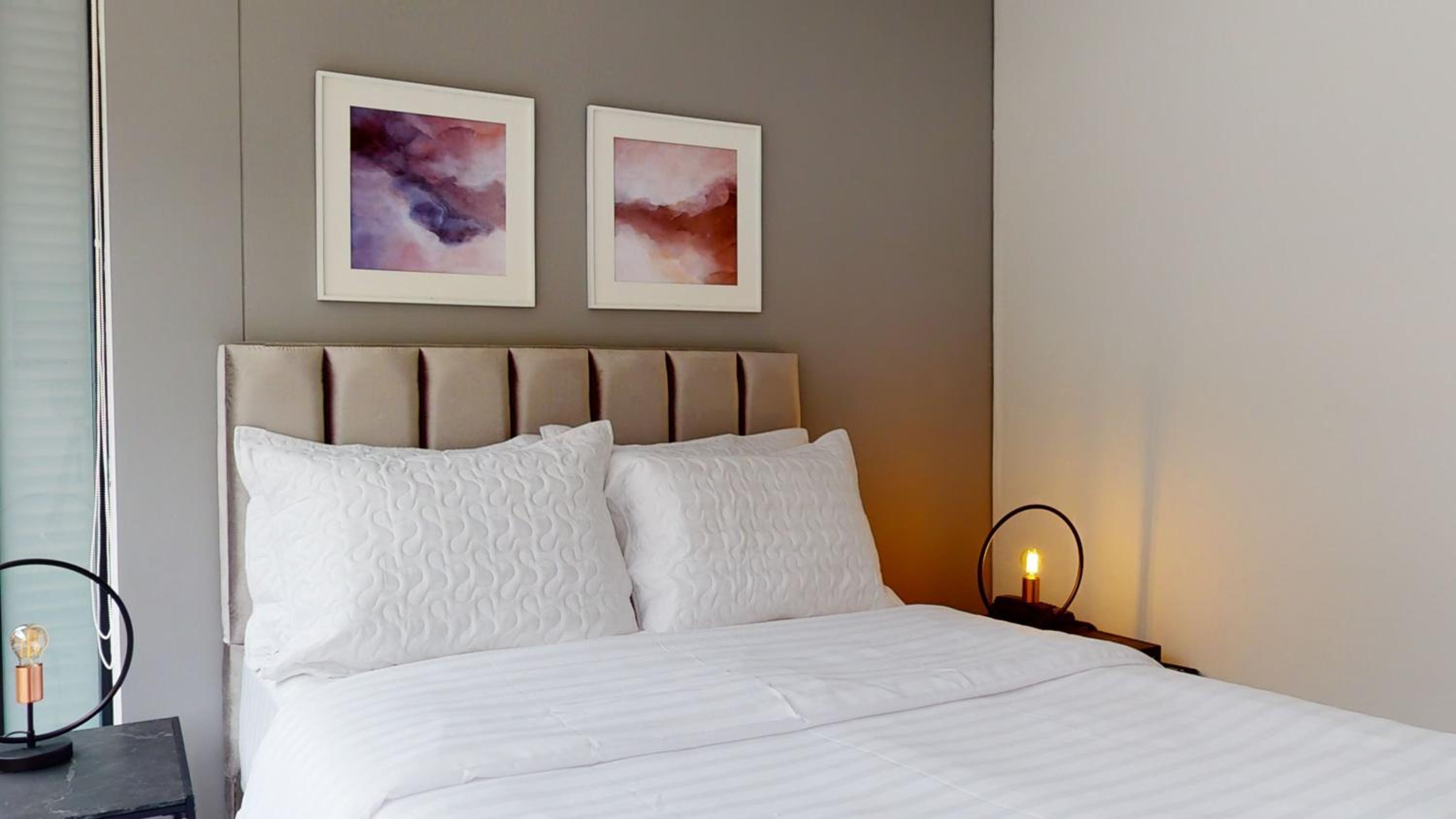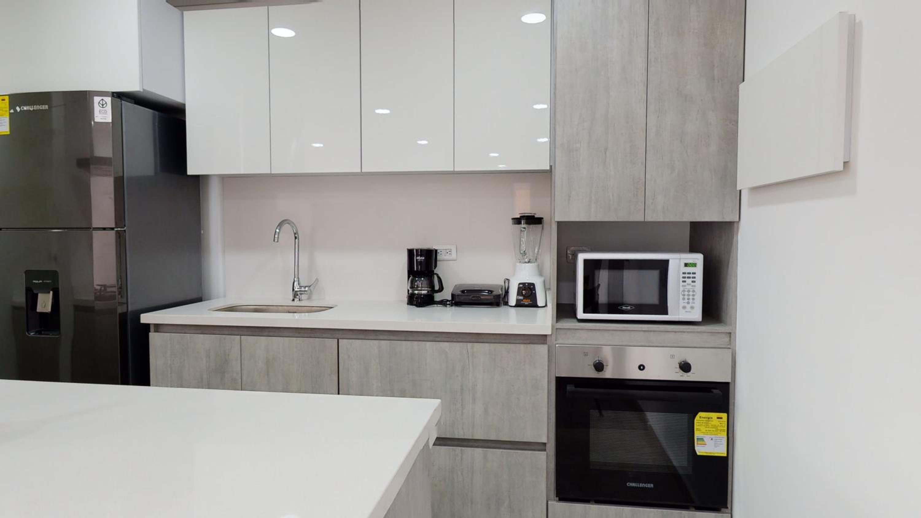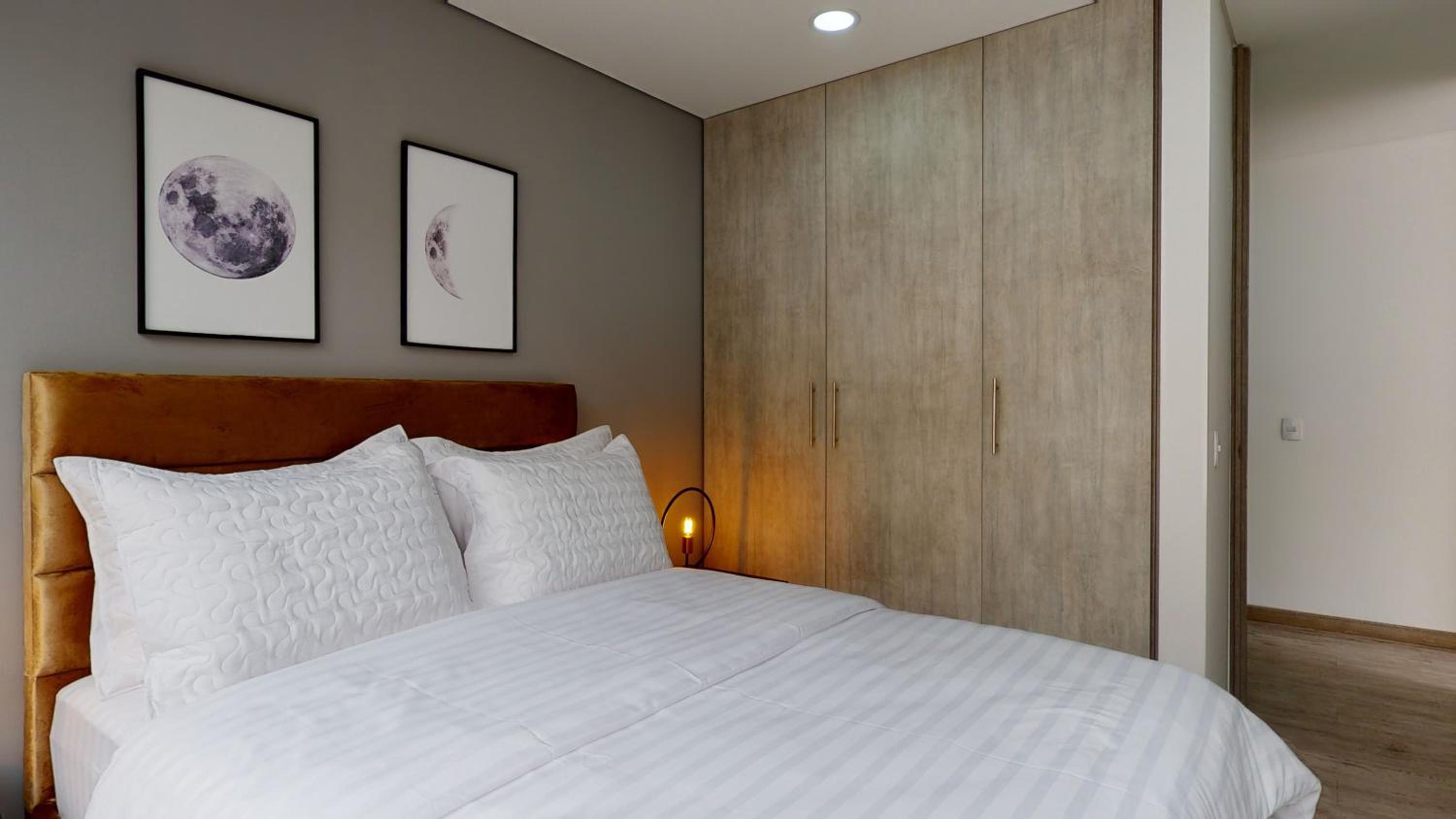 Luxurious 2-Bedroom Aparthotel: Enjoy a spacious living room with a flat-screen TV, fully equipped kitchen, and a modern bathroom.