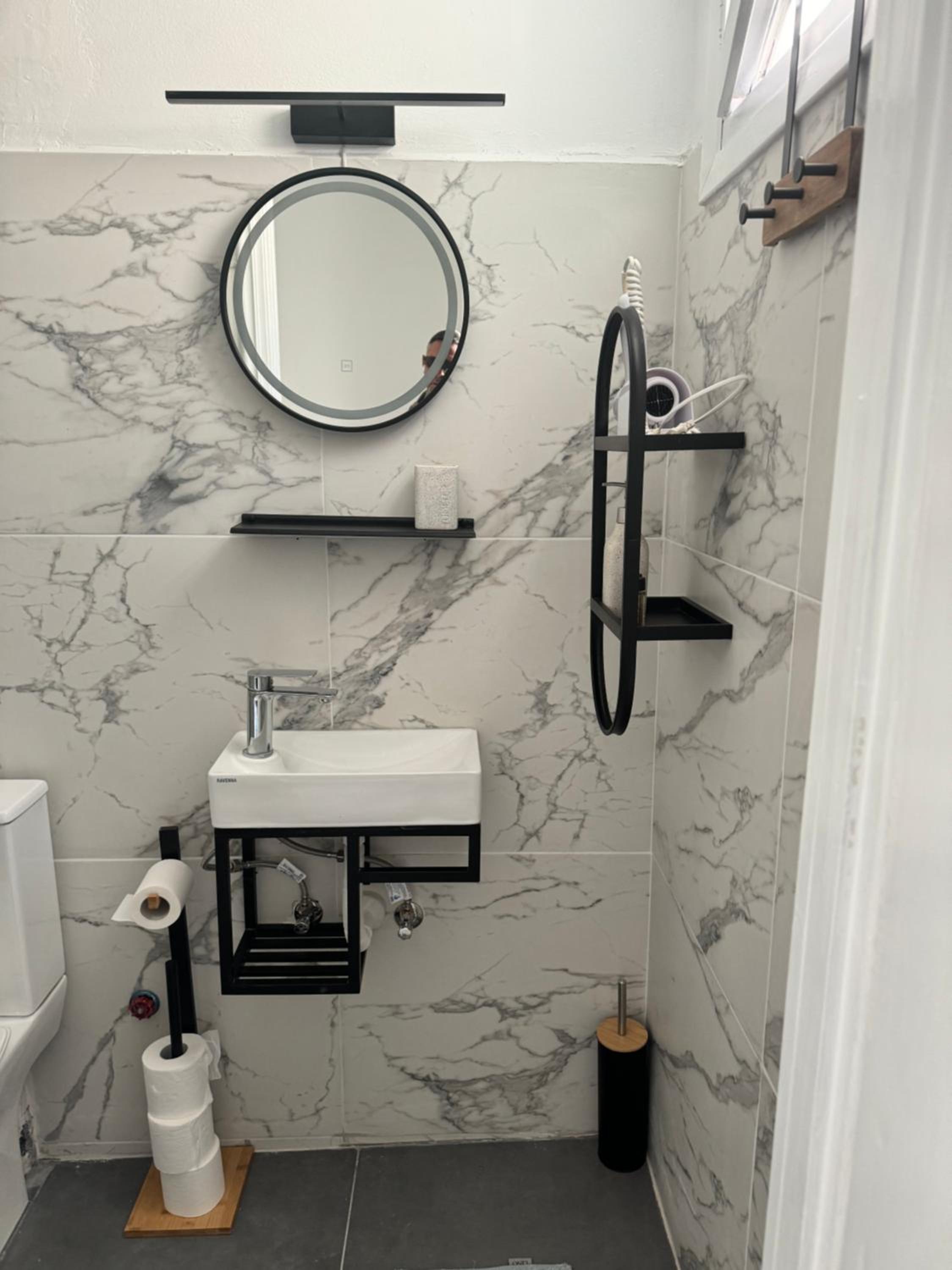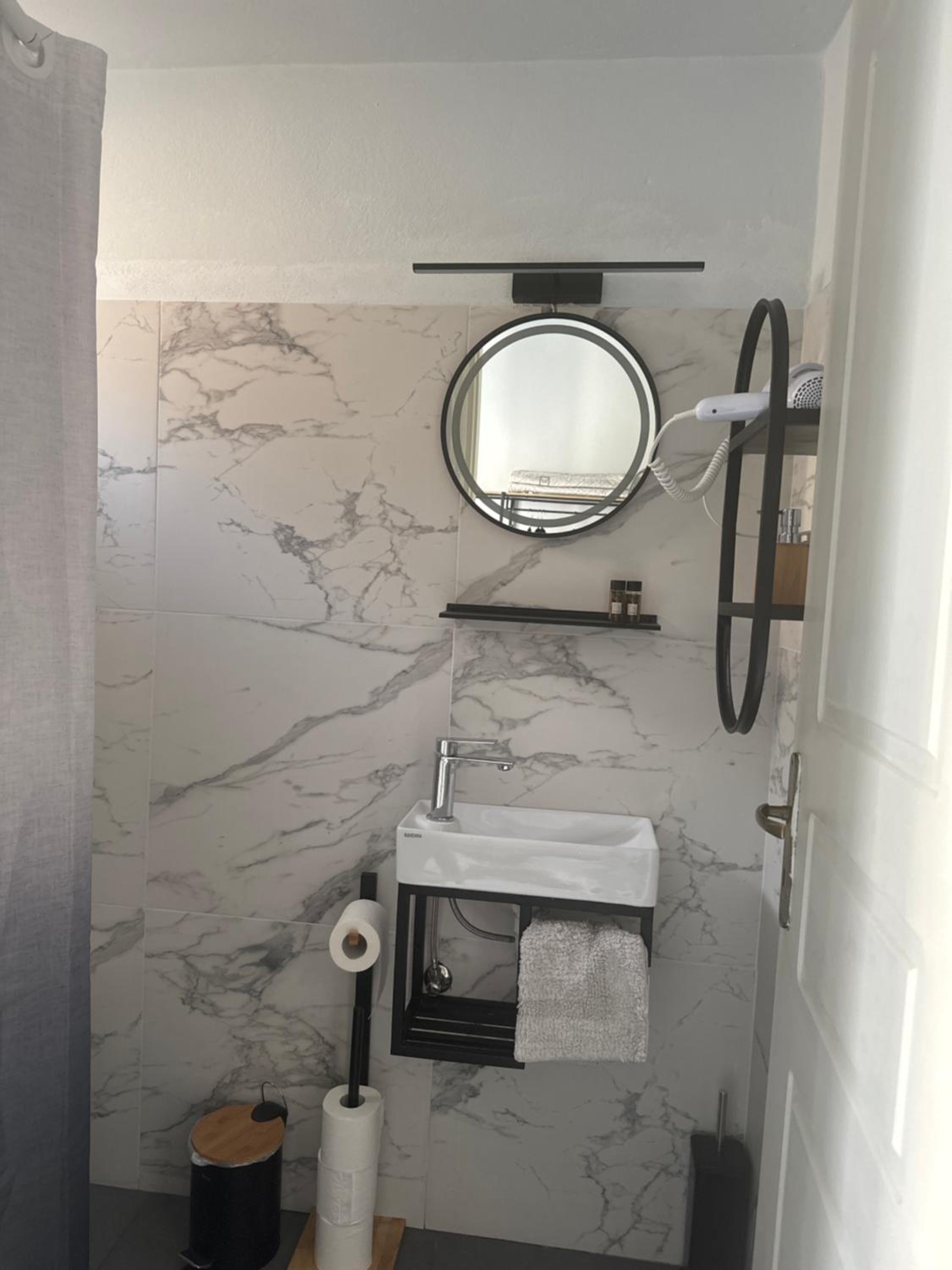 Ο νιπτήρας στο μπάνιο είναι υπερβολικά μικρός. Θα ήταν καλό να υπάρχει ένα απορροφητικό χαλάκι για να μαζεύει τα νερά που αναπόφευκτα πετάγονται τριγύρω. Επίσης θα θέλαμε να είχαν αδειάσει το μικρό καλαθάκι του μπάνιου, έστω μια φορά, από το Σάββατο το απόγευμα (check in) ως την Τρίτη το πρωί (check out).