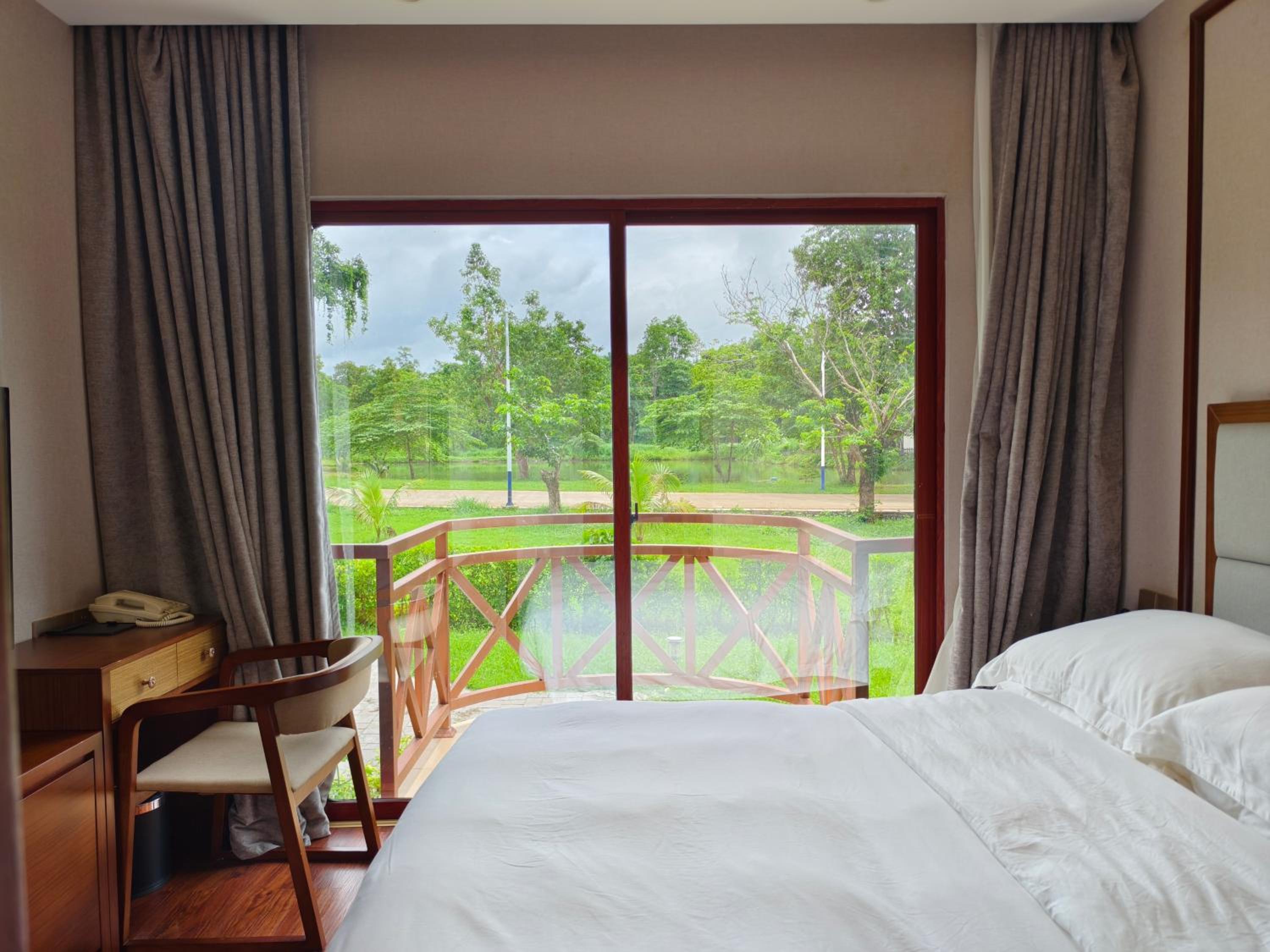 We hebben de kamer ge-upgraded met zicht op de Mekong, dat was mooi. Kamer was ook groot. Omdat er bijna niemand was (volgens ons) was 1 nacht voldoende, we kregen gemakkelijk geld terug.