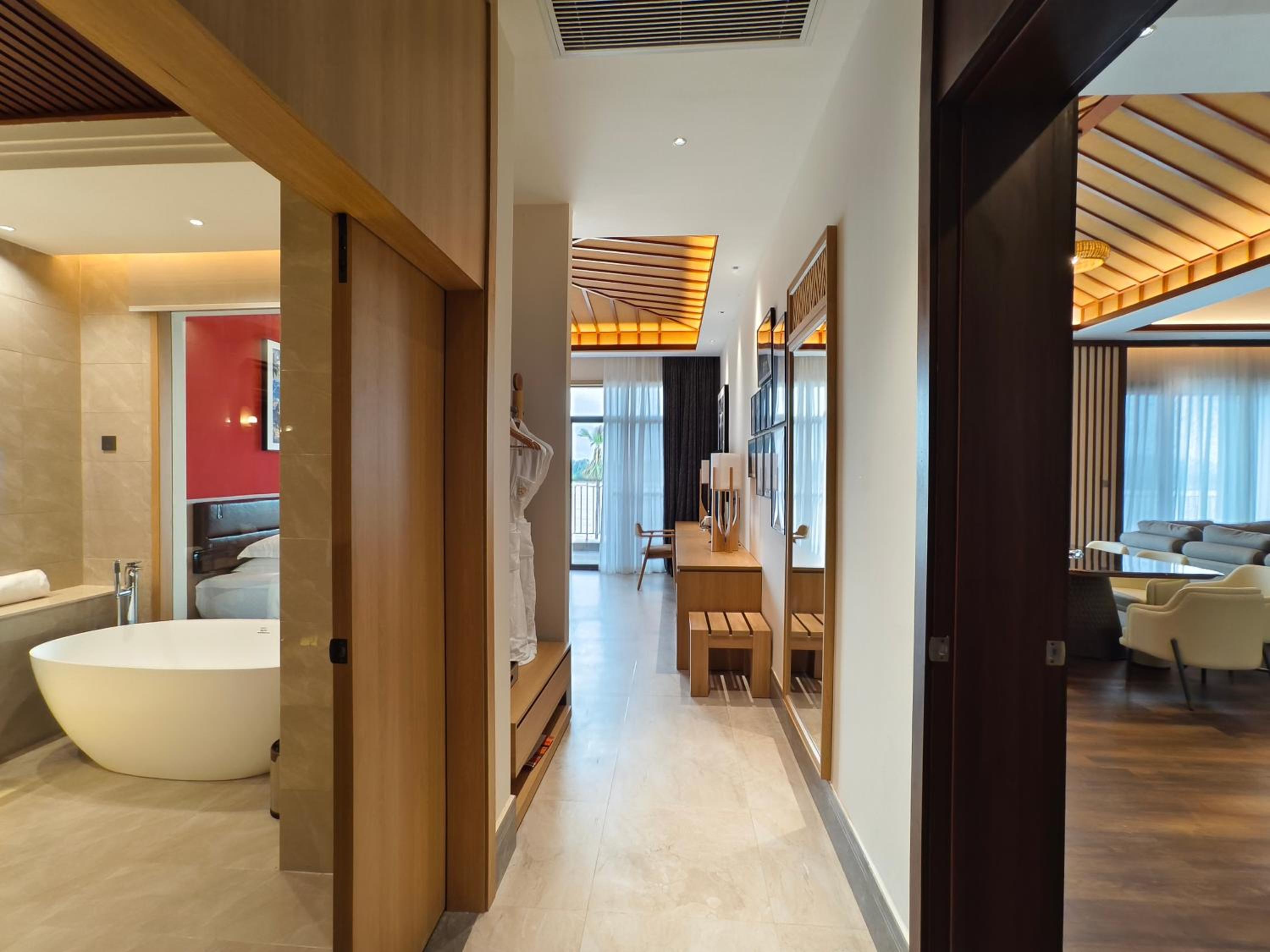 Het hotel ligt 20 minuten op een tuktuk verwijderd van Nakasang. Dat was niet duidelijk. Geen duidelijke eetgelegenheden in de buurt en het eten in het hotel vonden wij ronduit slecht.Ook het ontbijt was mager met slechte koffie. Heel veel chinees personeel wat totaal geen engels verstaat, behalve bij de receptie. 1 Zwembad was leeg en je vraagt je af waarom alles zo groot is. Zwembad met heel lang water tot de knieen, een plein voor t restaurant met 0 zitgelegenheid, lange gangen met grote schilderijen. Indrukwekkend groot maar wij vonden de stilte spooky.