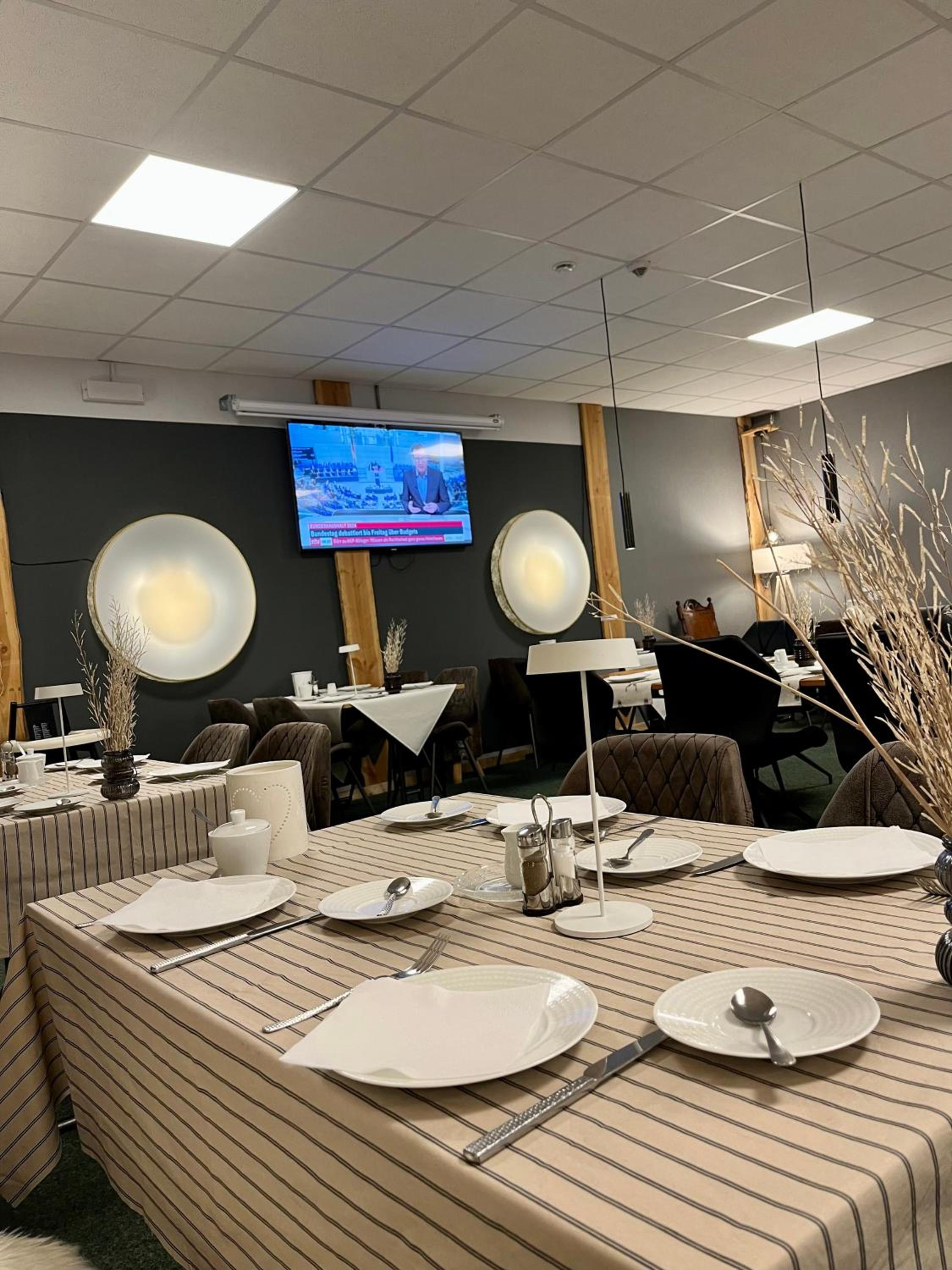 Auswahl beim Frühstück für Vegetarier ziemlich schmal, zumal die ganze Zeit auf riesigem Bildschirm ziemlich laut NTV lief - nicht gerade ein guter Tag in den Tag. 20€ pro Nacht als Gebühr für Hunde liegt zudem schon deutlich über den Norm